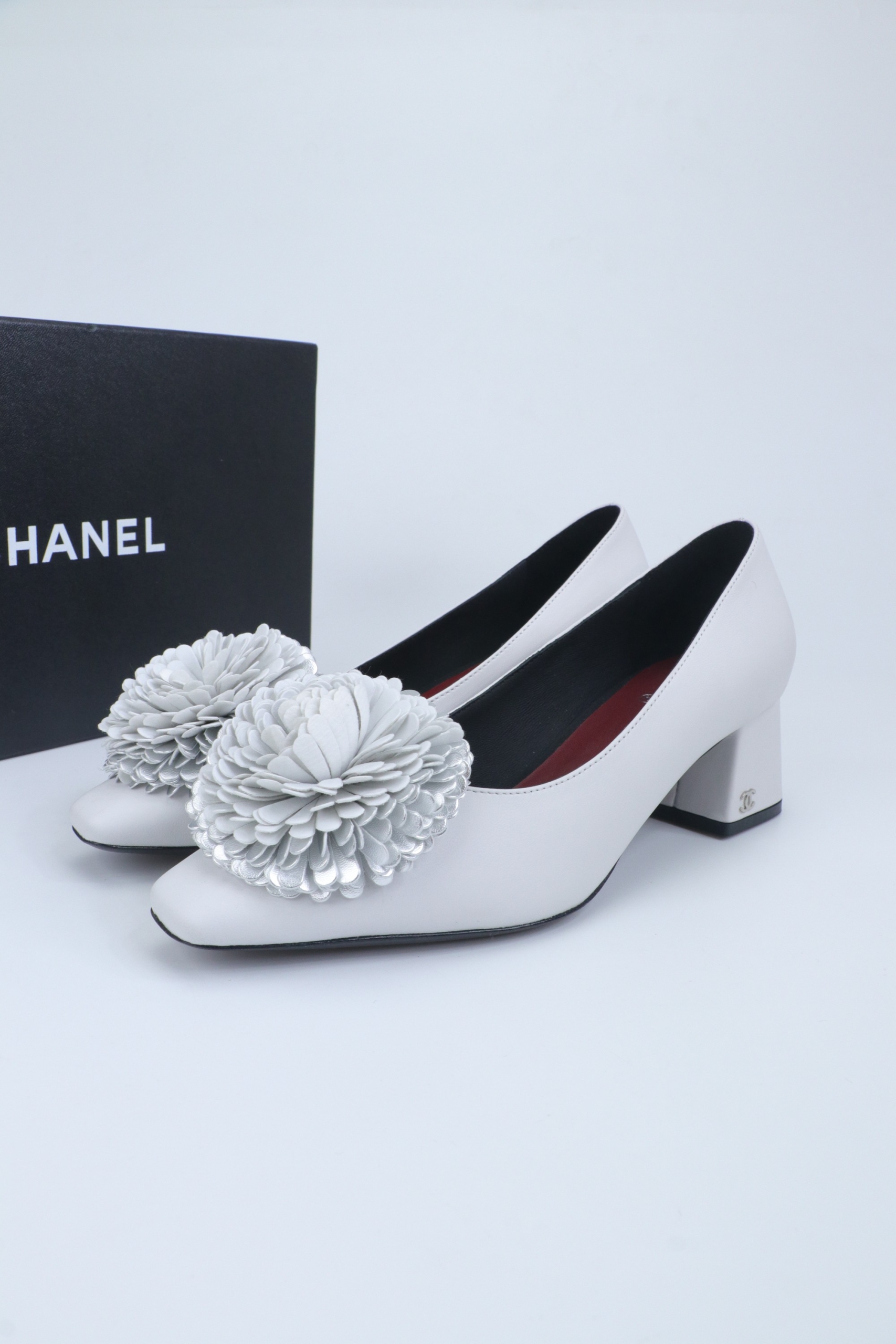 Chanel white chunky heels with three-dimensional camellia embellishments