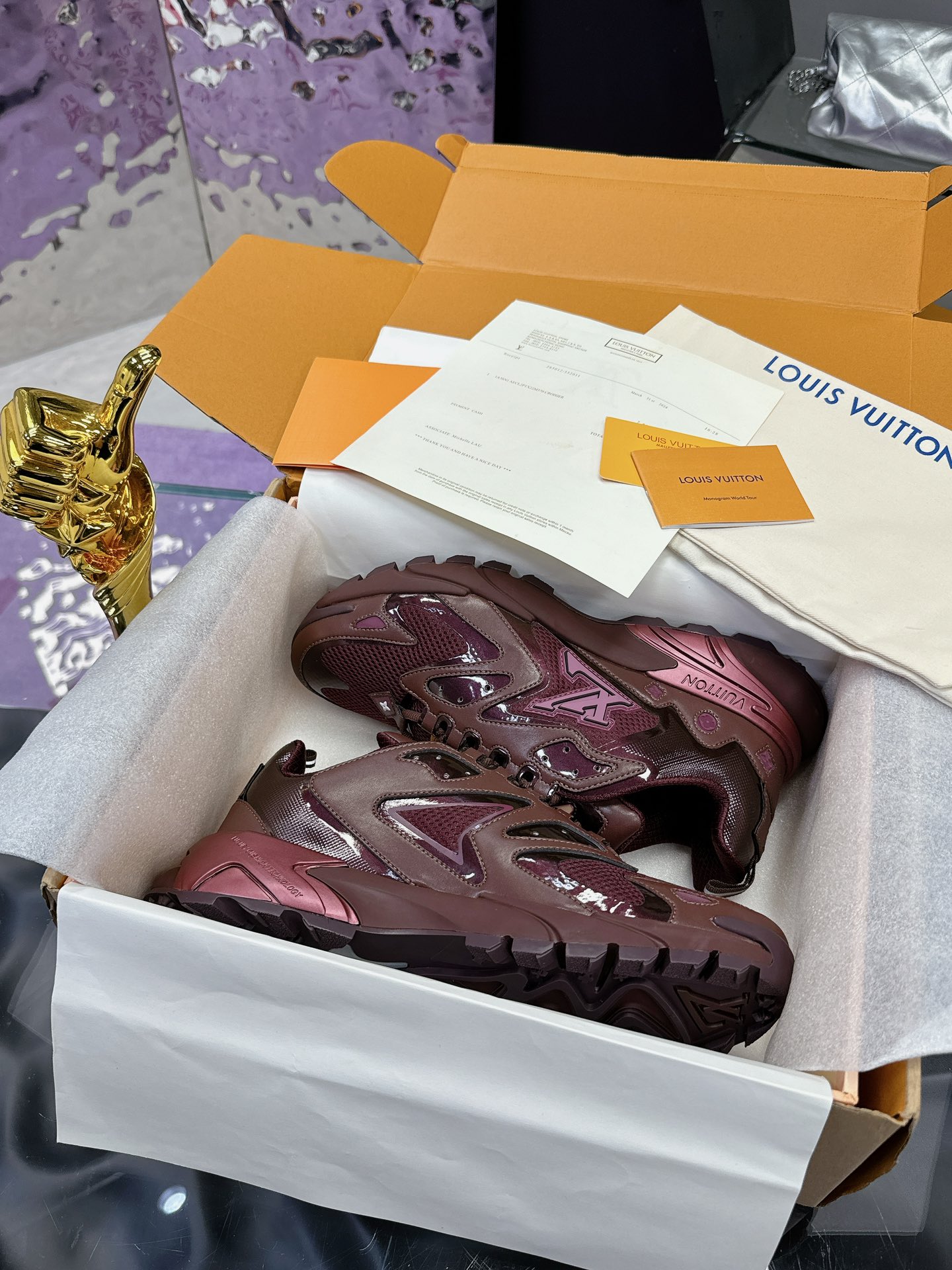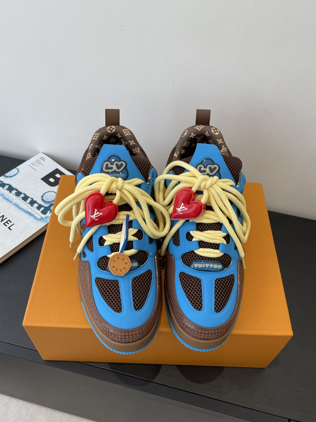 Details: The tongue features the LV logo, and the side is printed with the Vuitton signature. It’s worth noting that the red heart-shaped lace buckles and circular medallion ornaments on the laces shown in the image are not original Louis Vuitton accessories, but rather additional custom or personal embellishments.
