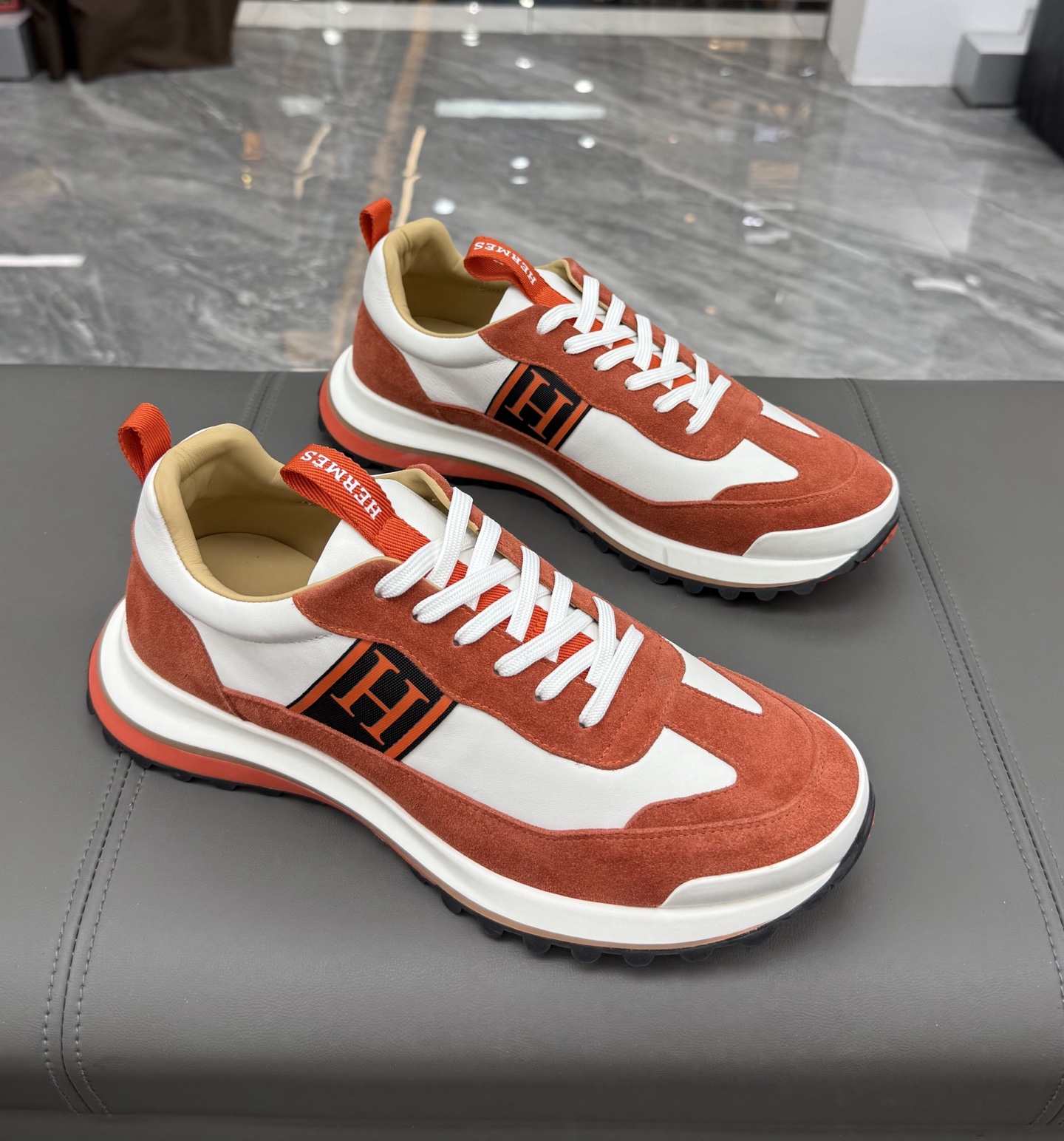 Features: Lightweight rubber sole for cushioned comfort. The sole features the iconic oversized “H en bias” (italicized “H”) pattern on the side.
