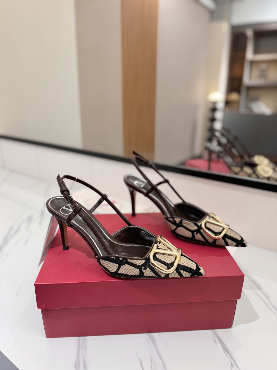 This shoe is notable for its unique all-over V-logo pattern and elegant open-heel design.
