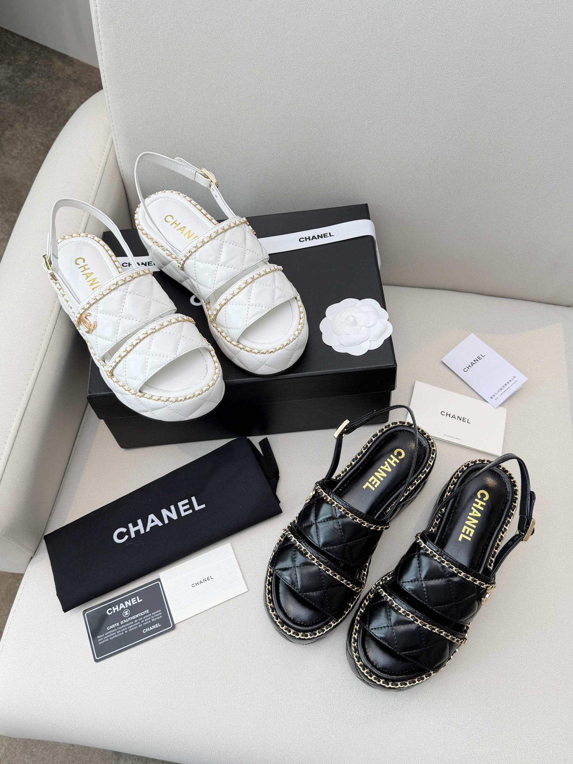Just touching the texture of these Chanel chain sandals, I knew this summer’s “starry night” look was a sure thing! ✨The soft, quilted leather wraps around your feet. The chain isn’t cold, hard metal; it’s a refined, warm chain. The black exudes confidence, while the white is like stepping on a glowing cloud.