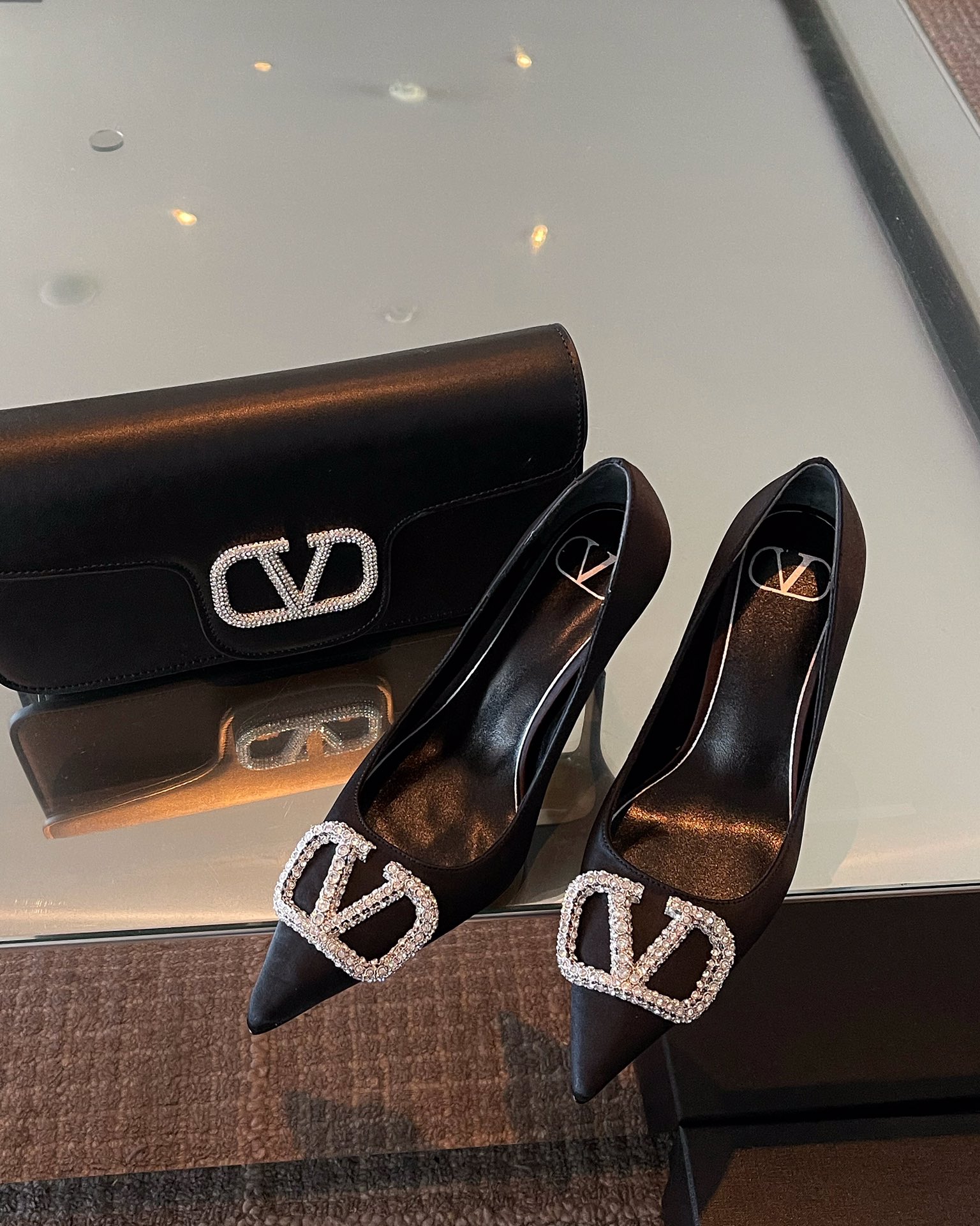 Style: Pointed-toe slingback pumps adorned with a crystal-encrusted VLogo logo.Color: Black satin silk.