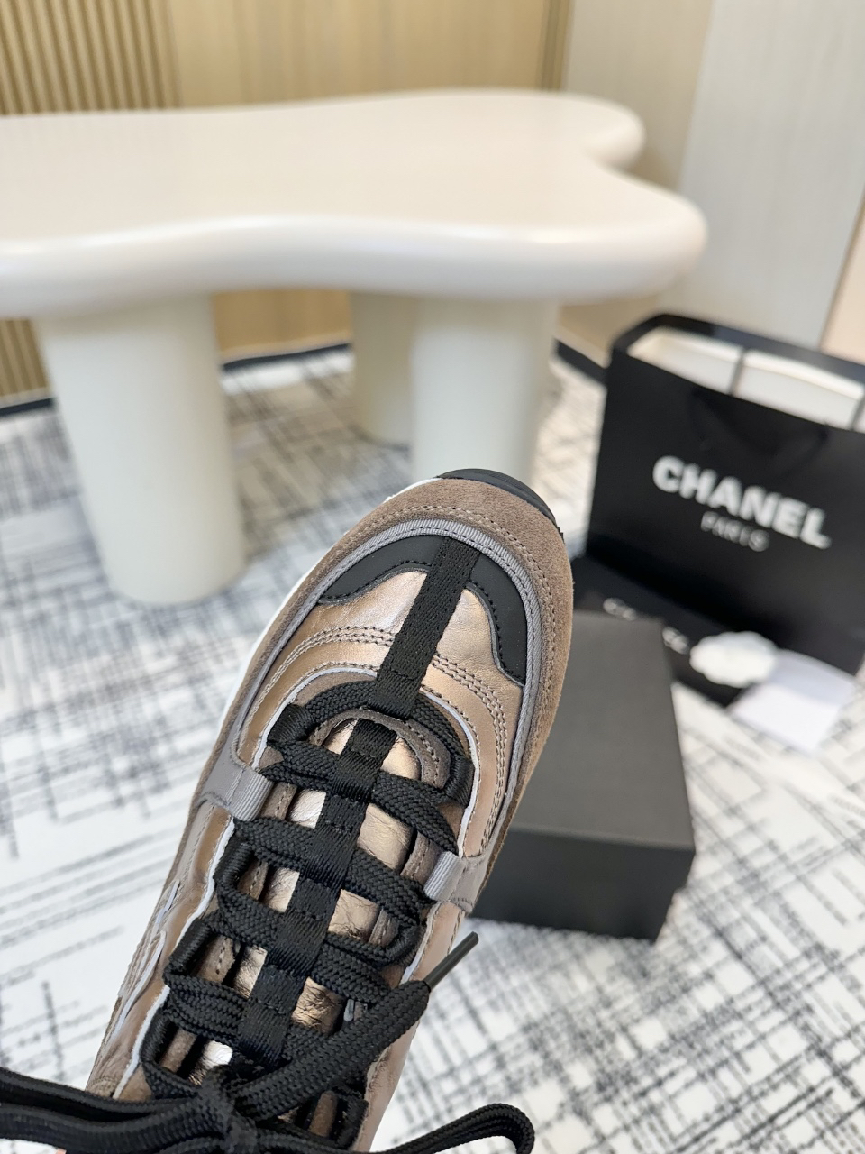 Shoe Shape: Low-top chunky sneaker style with light khaki laces and a heel pull tab, combining functionality with everyday wearability.