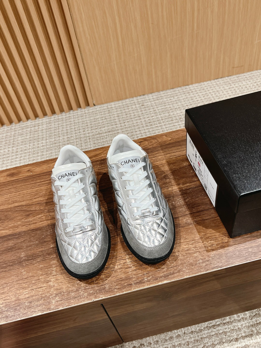 Chanel-style color-blocked metallic casual sneakers