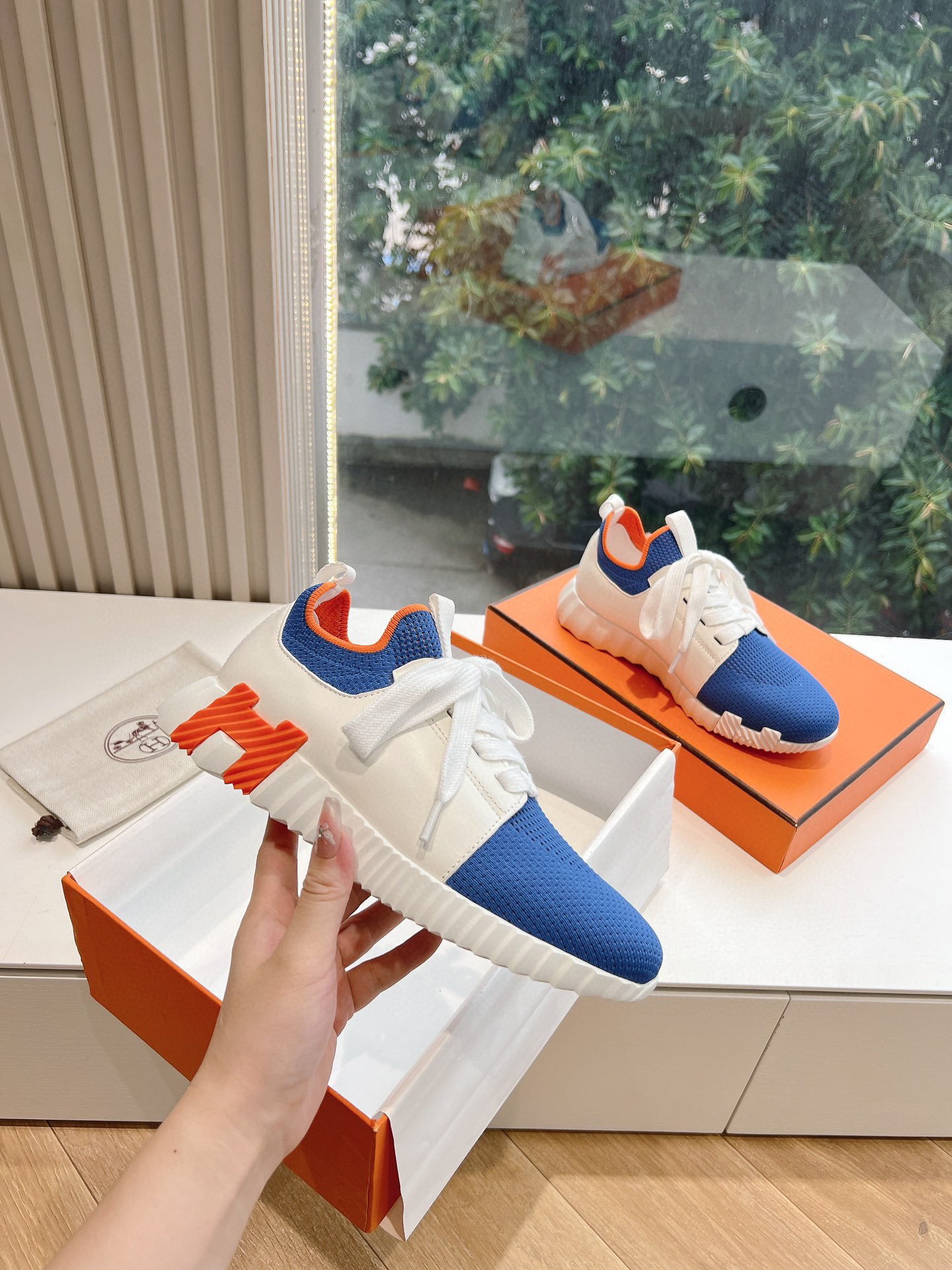 Features: These sneakers feature a lightweight sole and the iconic “H en biais” logo on the side. The upper is constructed from calfskin, mesh, and suede. The color scheme is a combination of blue, white, and orange.