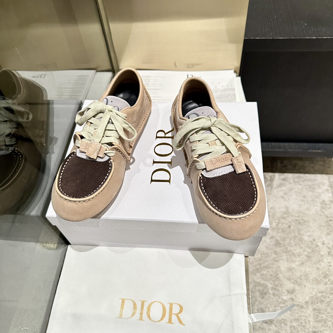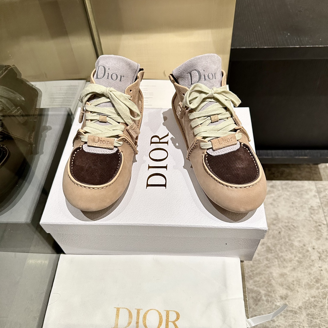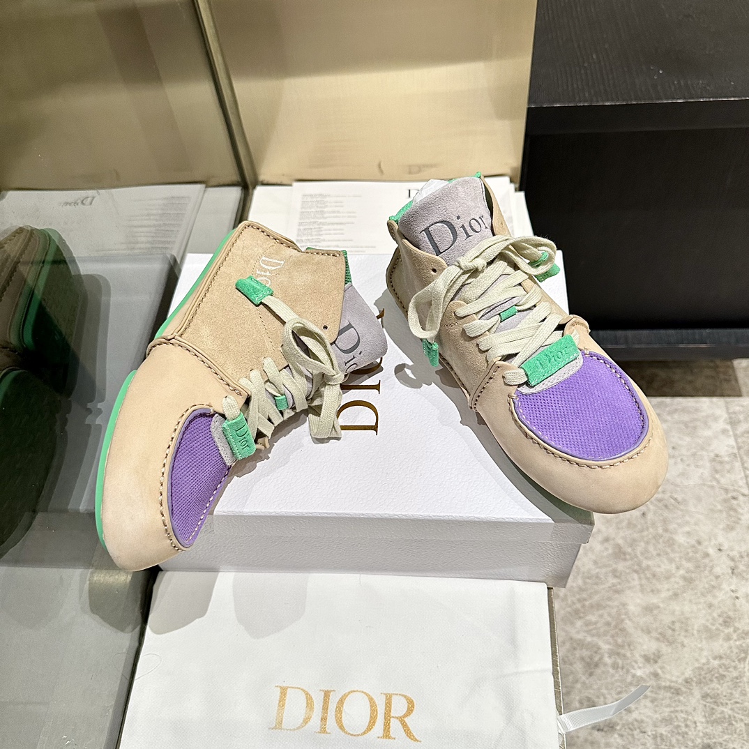 Shoe Shape: Low-top chunky sneaker style with white laces and “Christian Dior” logo details. The shoe boasts full lines and a unique design.