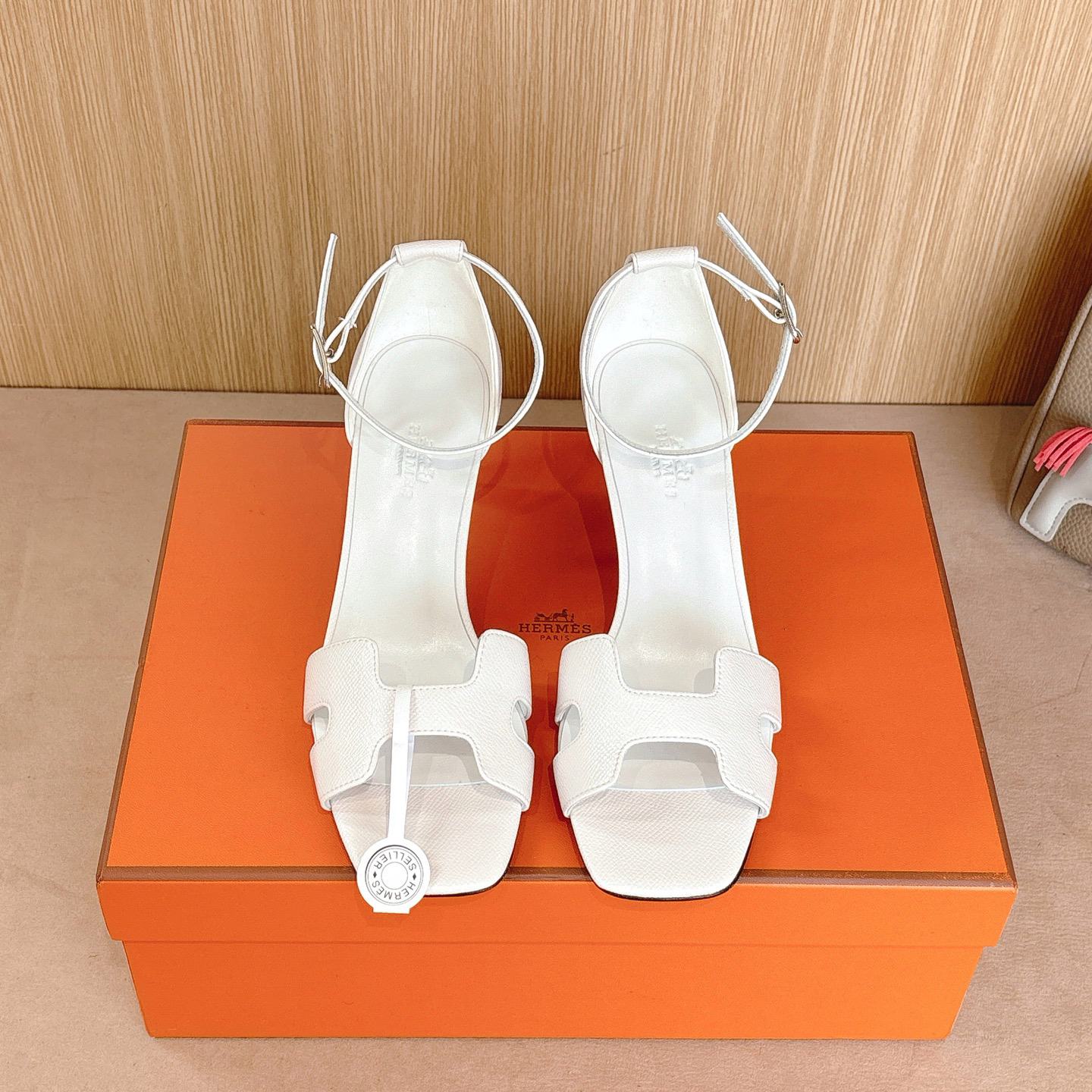 Features: These high-heeled sandals are crafted from cashmere leather, featuring the iconic “H” shaped cutout design on the upper and adorned with delicate rhinestones. The ankle strap adds an elegant and fashionable touch.