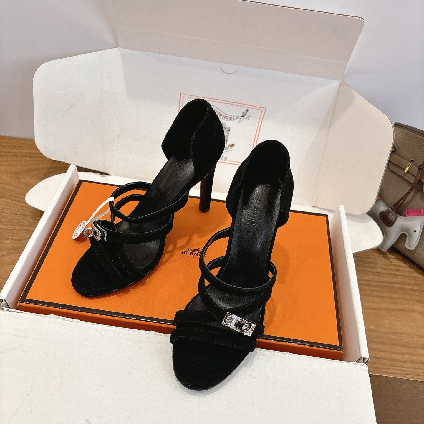 Design Features: Multi-strap design with palladium-plated metal buckle (similar to the Kelly bag buckle), paired with a leather stiletto heel