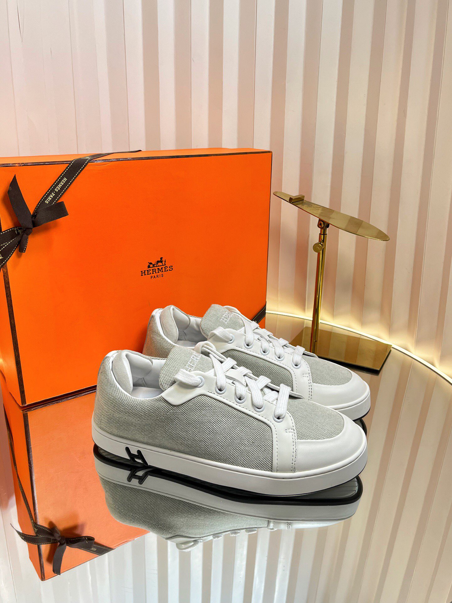 Design Features: A simple light grey canvas upper with white leather trim and laces. The heel features the signature black “H” detail.