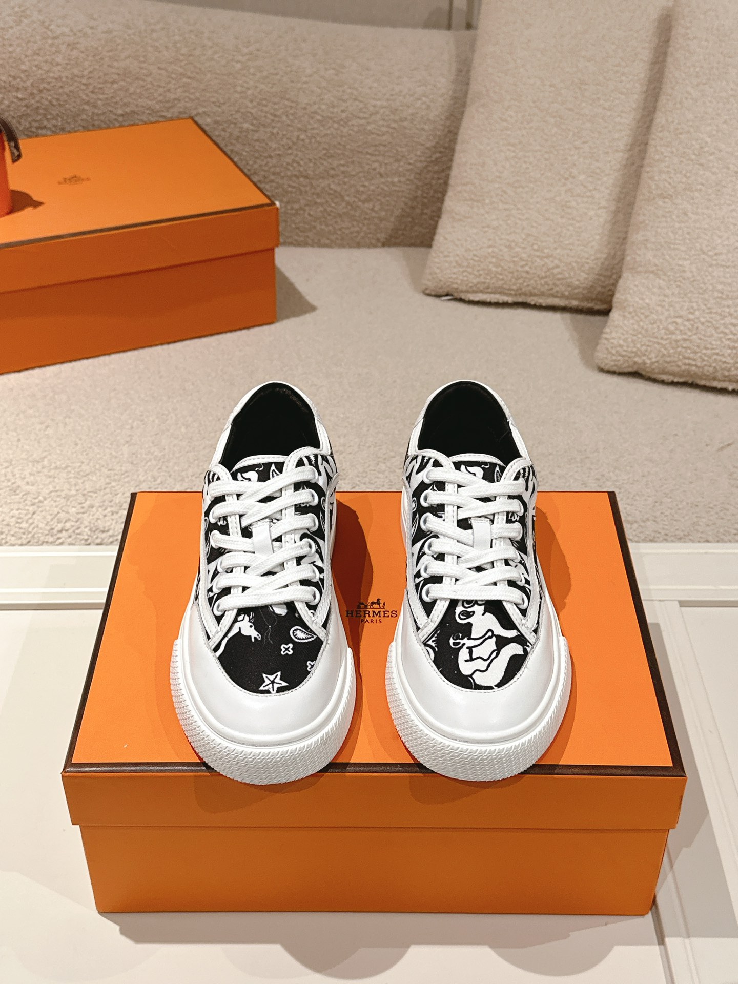 Design Features: Canvas upper, white rubber sole, and the iconic “H en Biais” geometric pattern on the heel. Available in black and white pattern and paisley pattern.