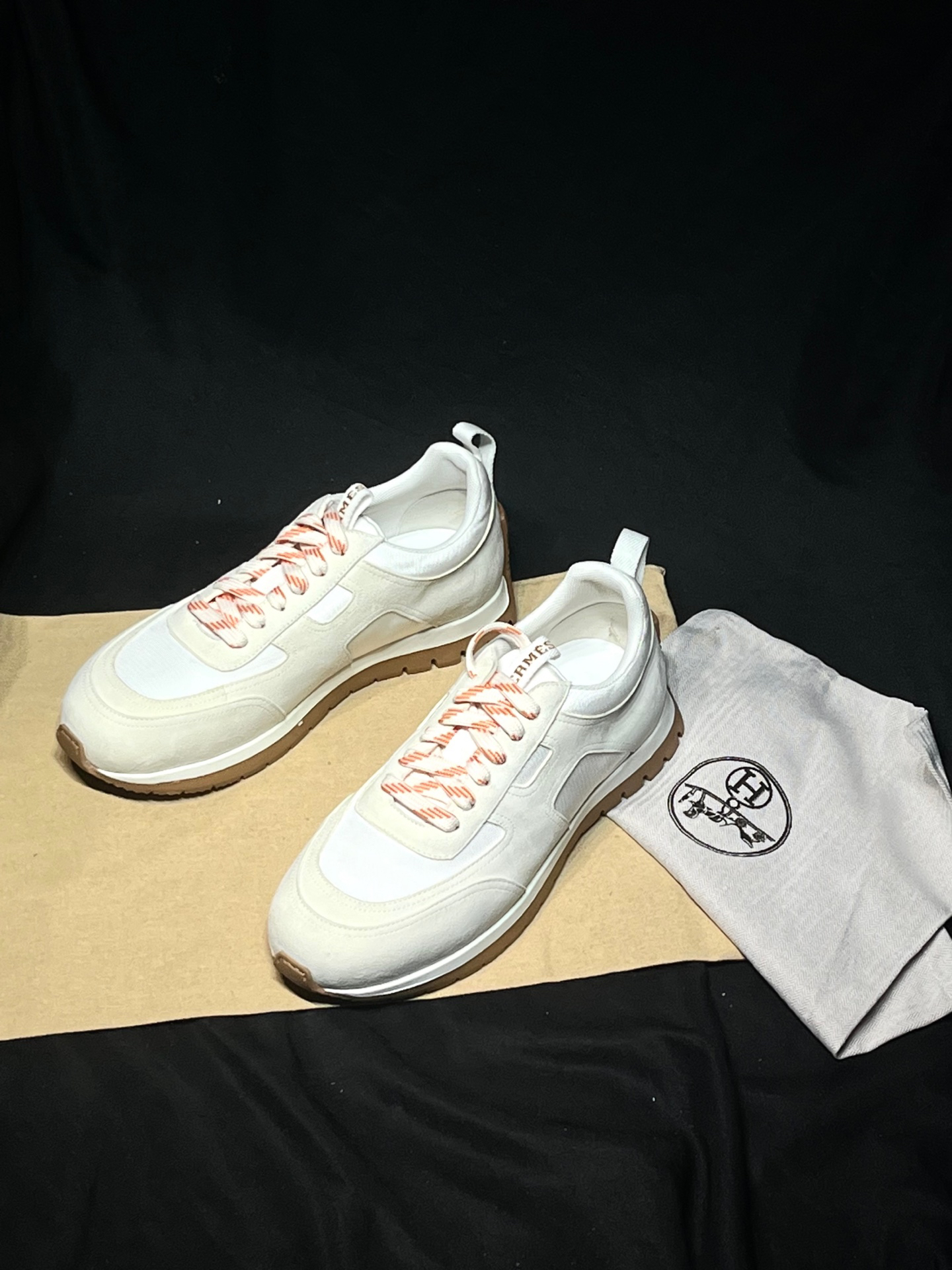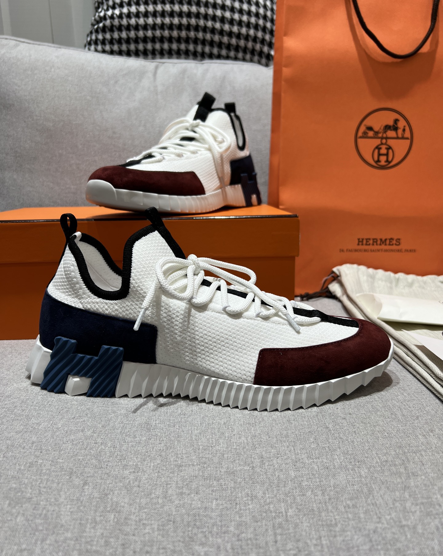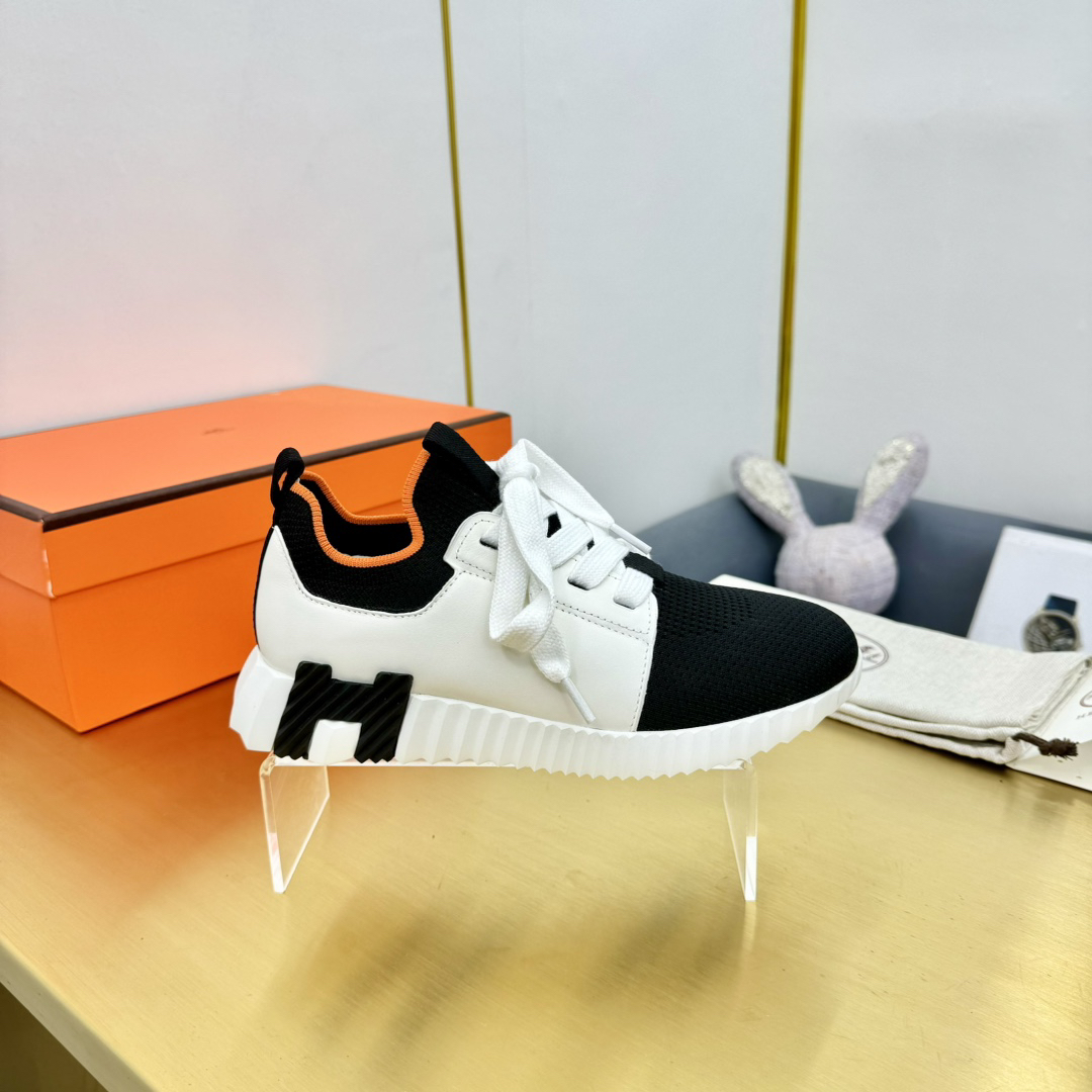 Design Features: A minimalist lace-up sneaker design with the signature orange trim on the sole and a “H en biais” pattern on the side of the sole, showcasing a modern retro style.