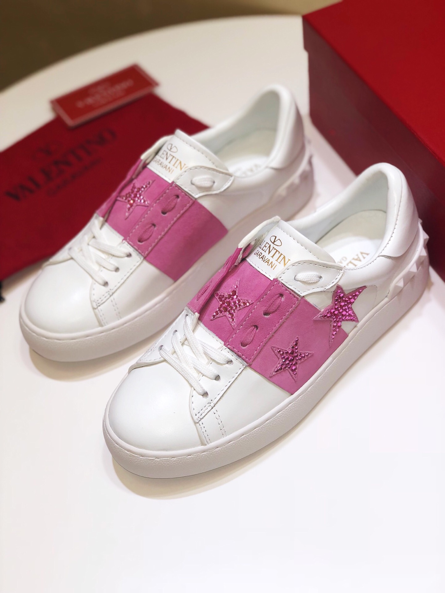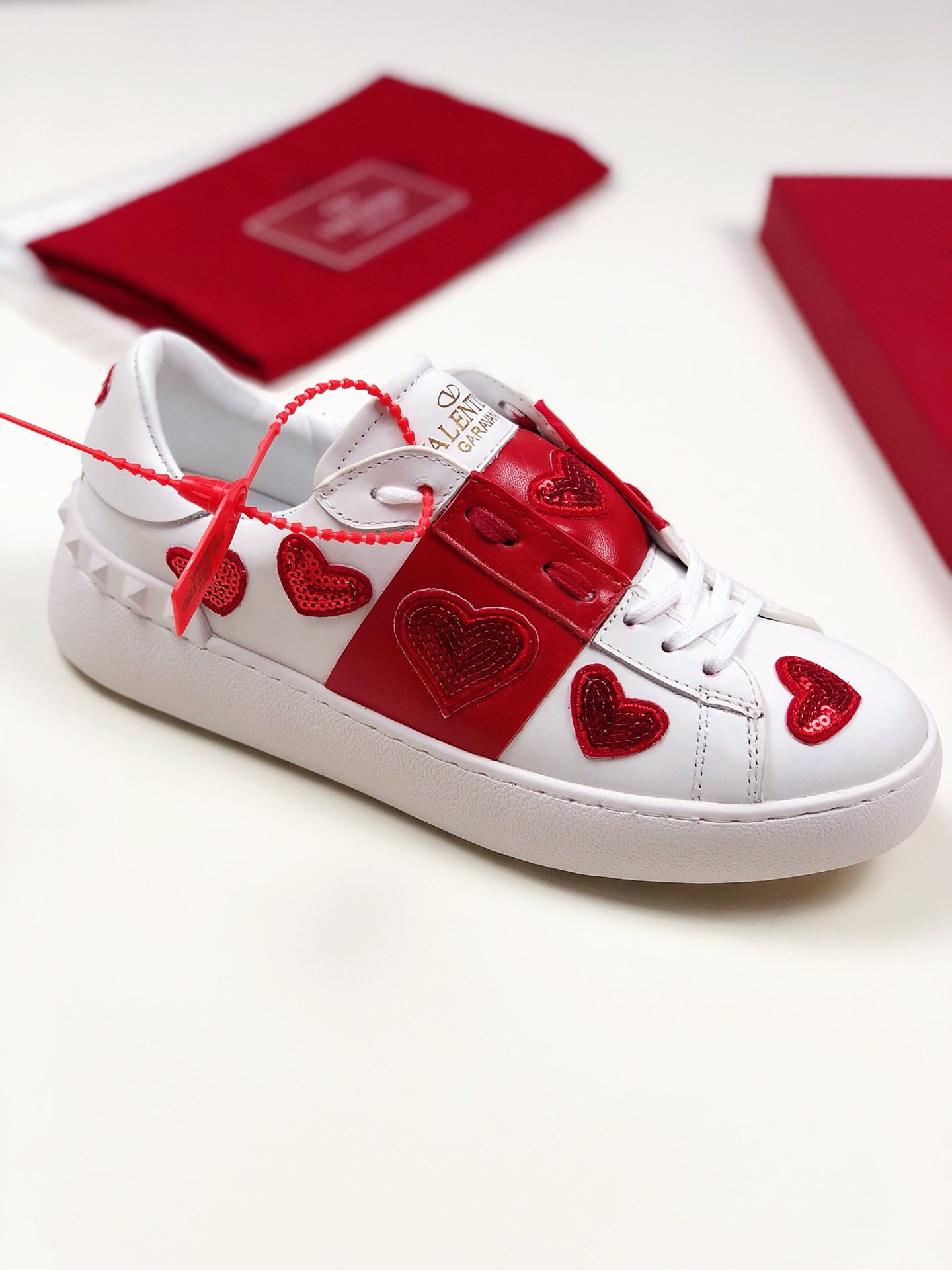 Design Details: The upper is primarily made of white calfskin, with the signature pink stripe on the side, embellished with red sequins or embroidered heart patterns. The heel features the brand’s classic pyramid-shaped studs.Sizes: 5-10