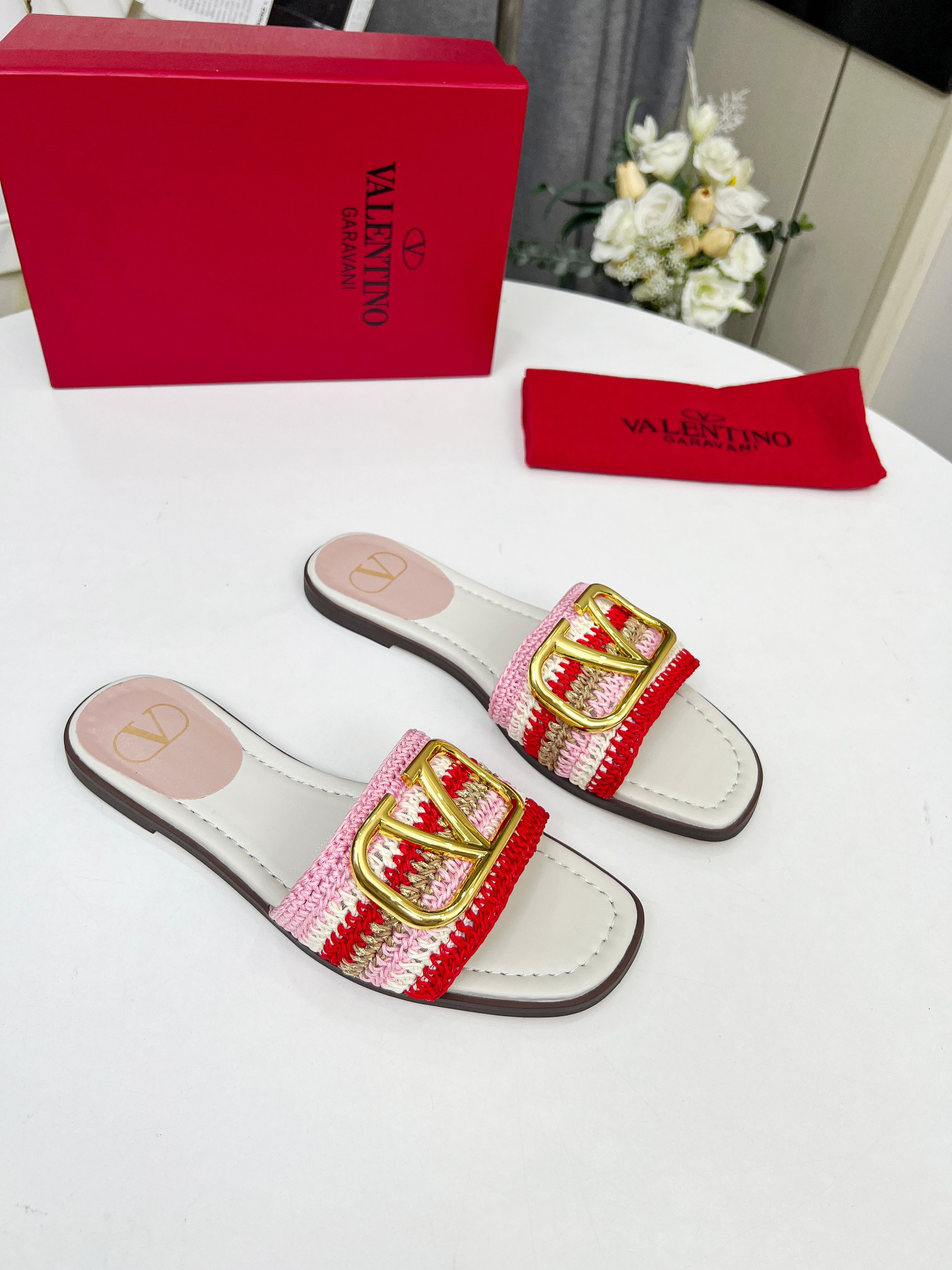 The shoes you see are the Valentino Garavani VLogo Signature Woven Raffia Slide Sandals. These sandals come in a variety of colors and styles, all featuring a woven design and the iconic VLogo hardware.