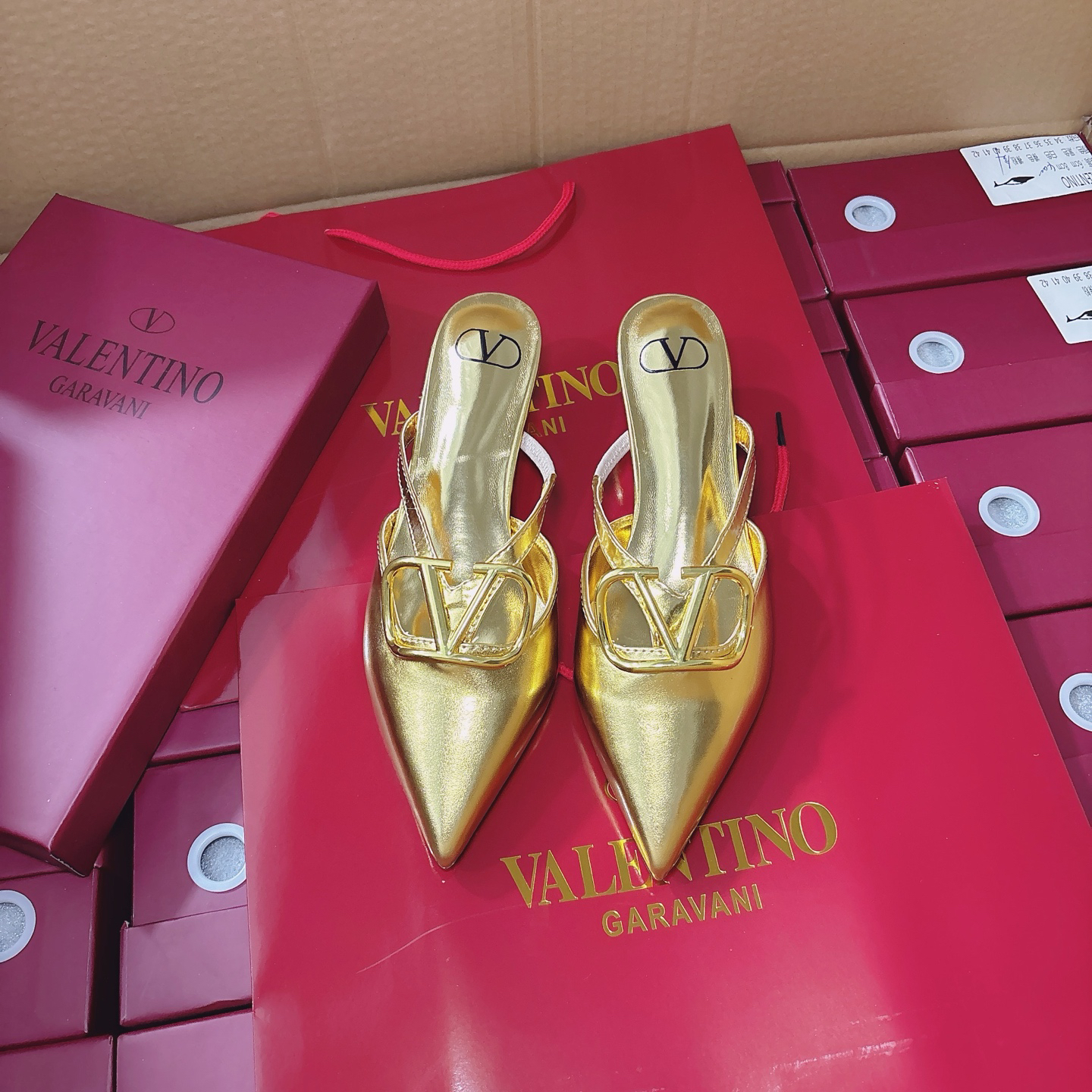 The shoes you see are Valentino Garavani VLogo Signature Mules. These shoes are renowned for their unique gold-toned metallic sheen and kitten heel design.