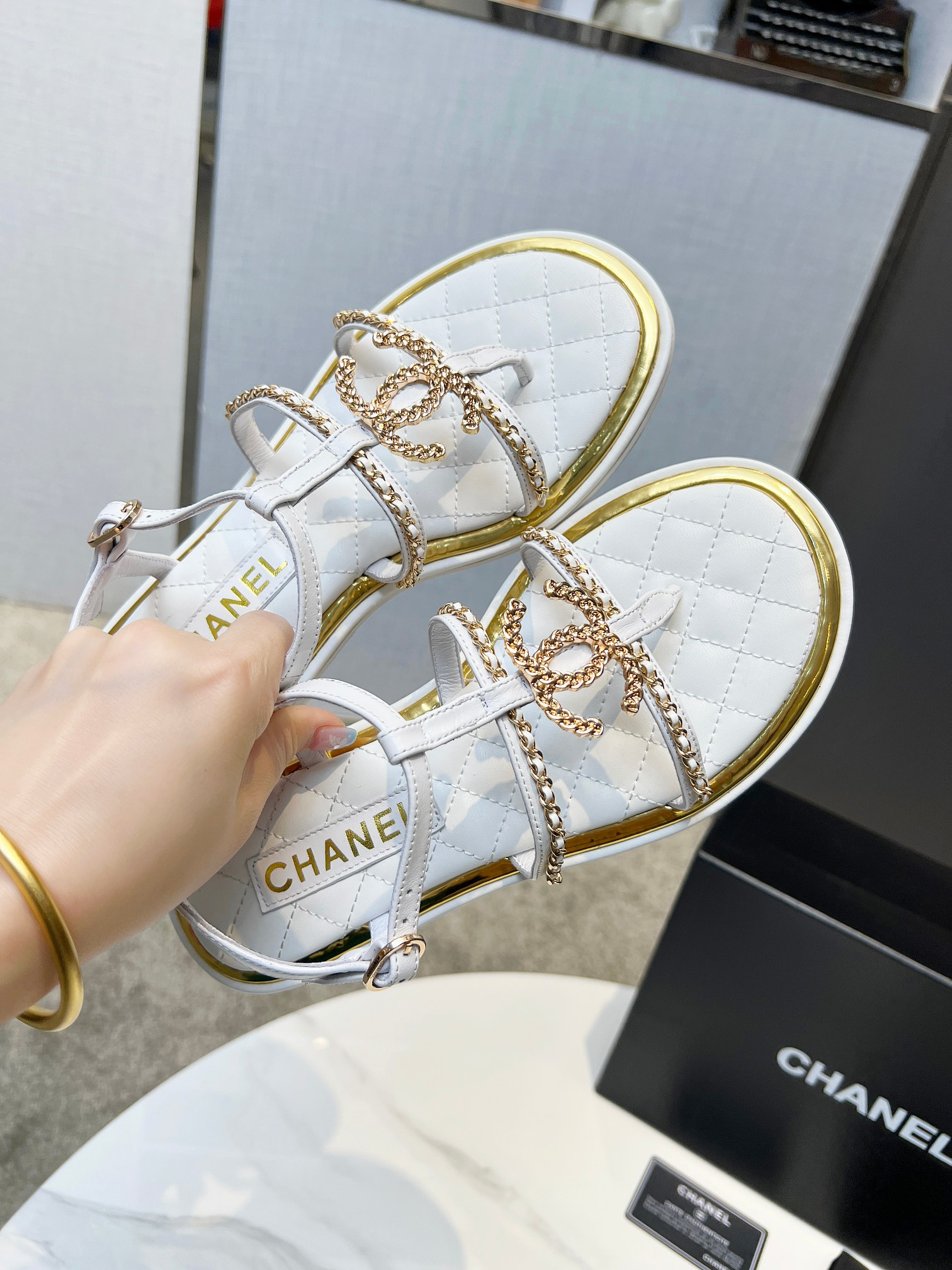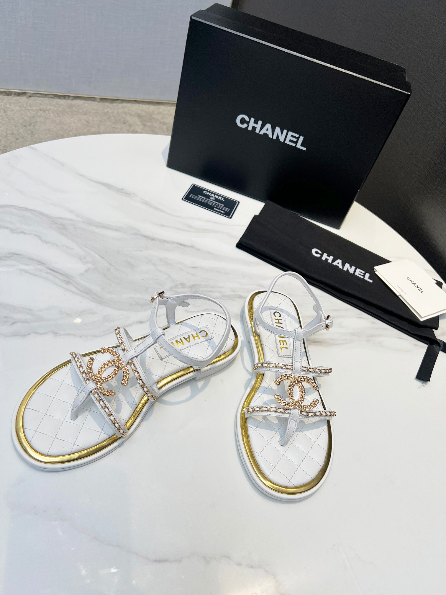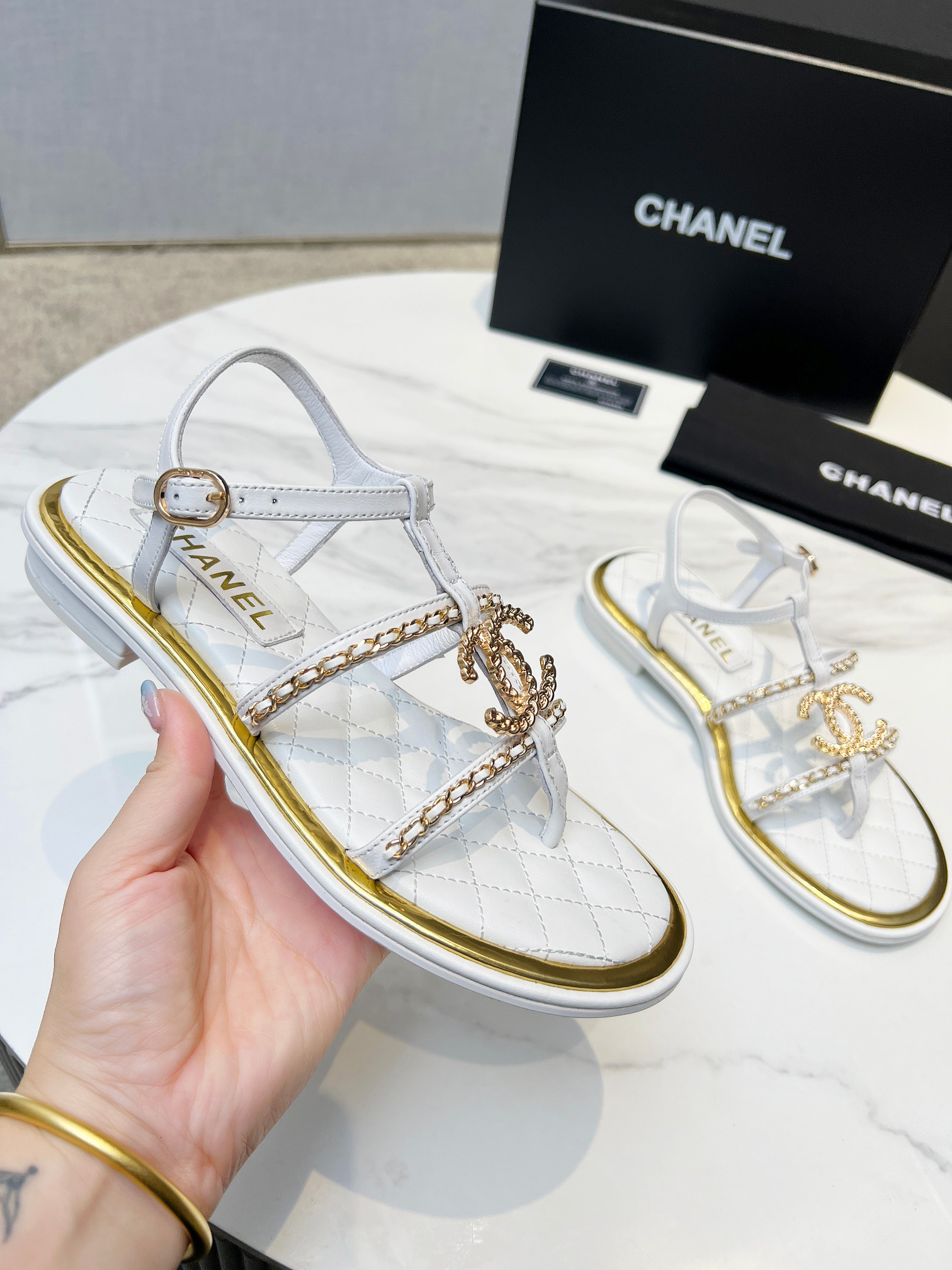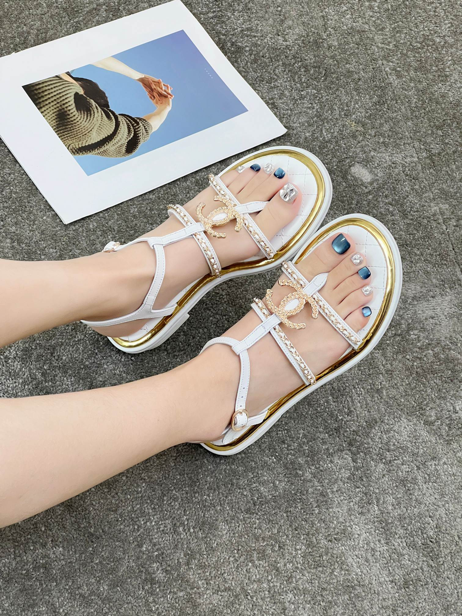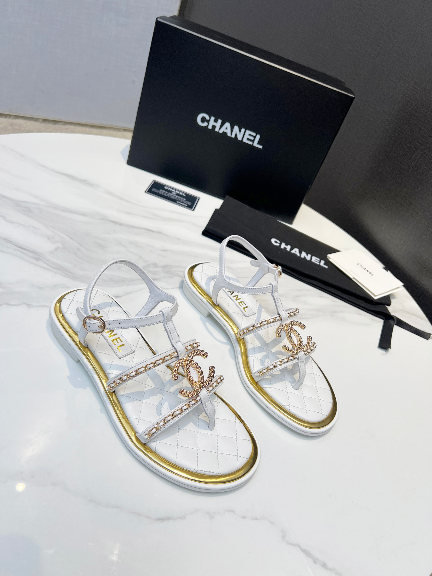Unique double-layer welt construction, original molded logo, exuding lasting charm, these Chanel-style sandals are vibrant, sophisticated, and elegant, highlighting the unique beauty of women. Material: Sheepskin; Lining: Imported sheepskin; Outsole: Rubber outsole (genuine leather outsole); Colors: Black, Apricot, White; Sizes: 5-11
