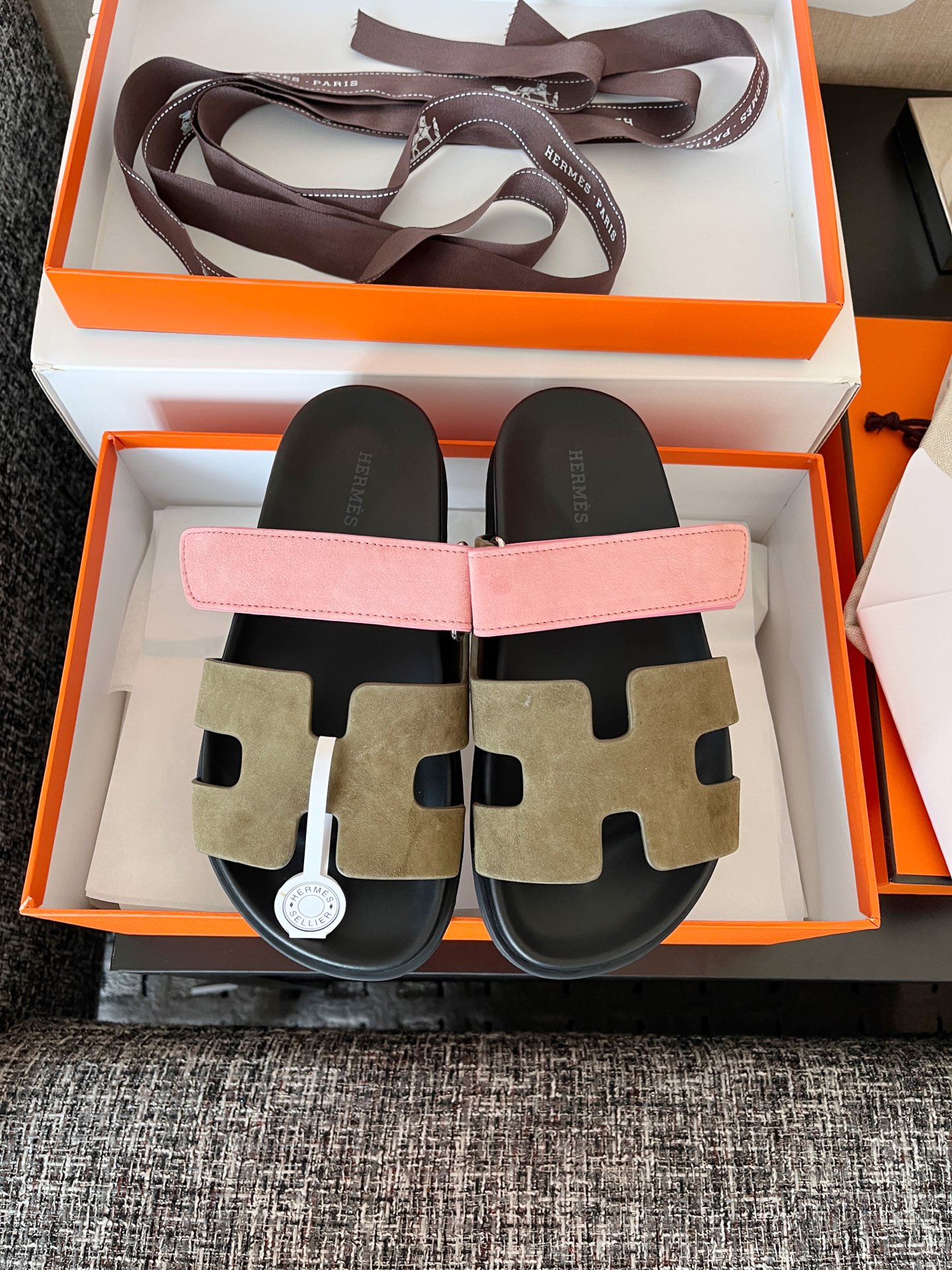 Hermes Chypre series, vintage-style slippers, H-shaped slippers, Velcro sandals.