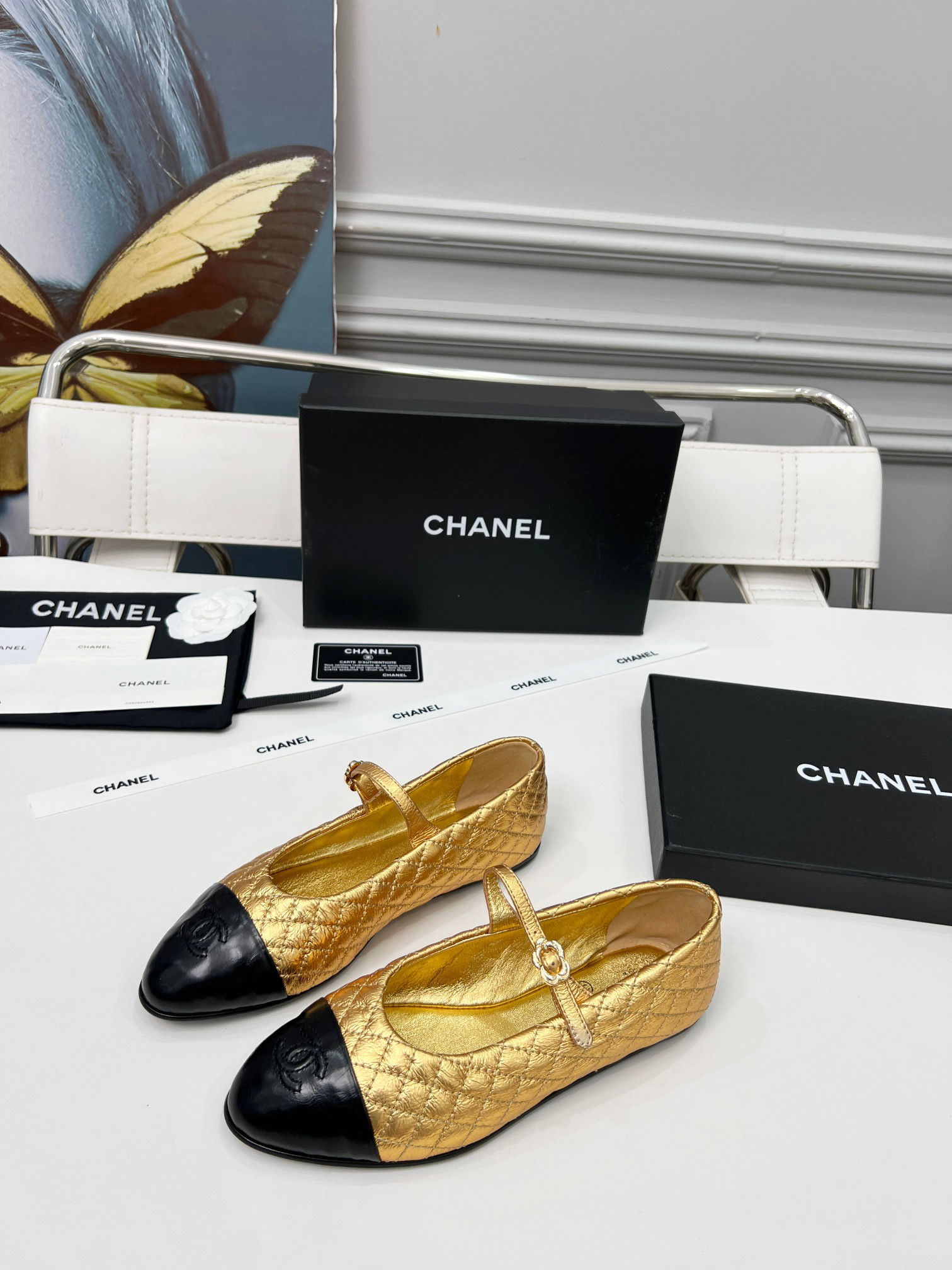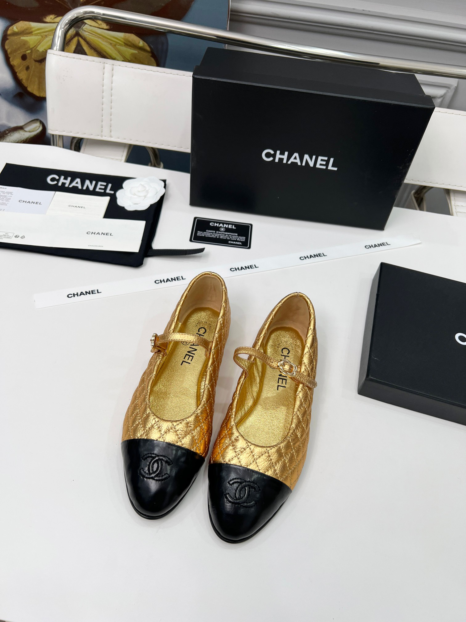 Chanel-style black and gold diamond-patterned Mary Jane flats