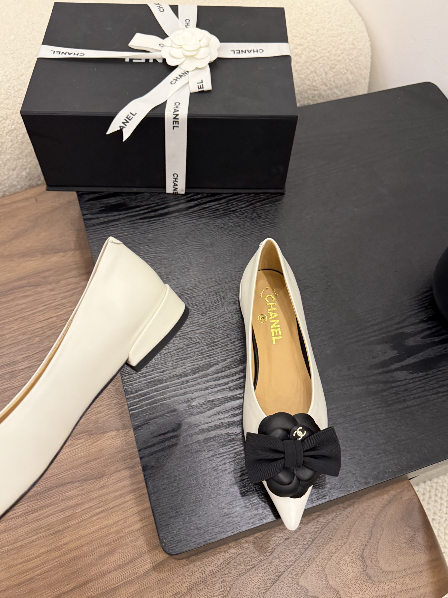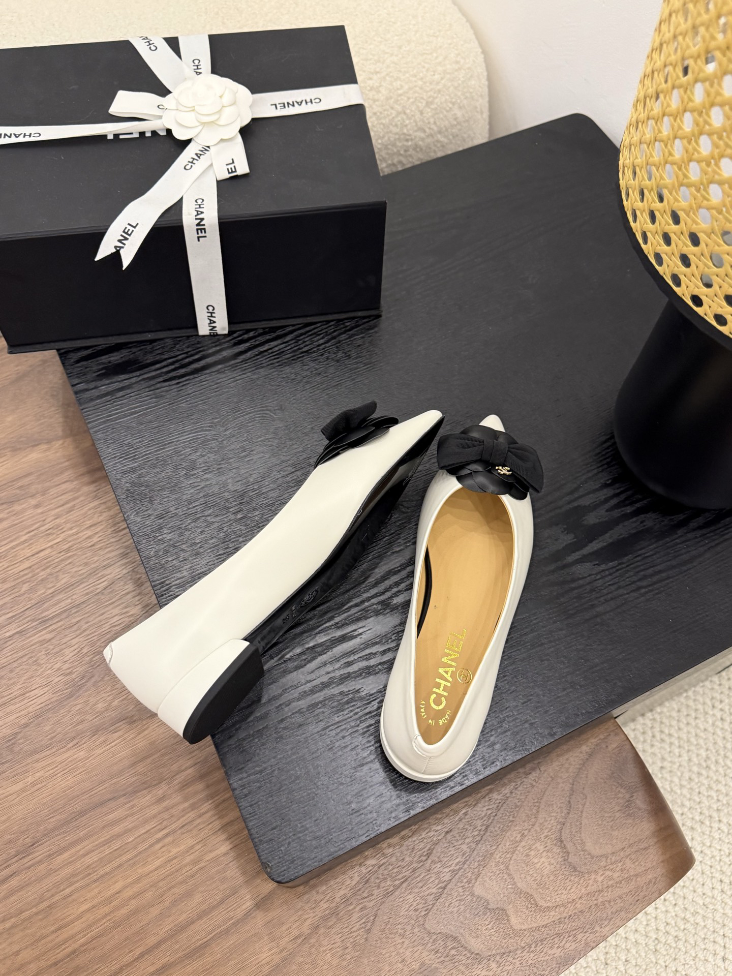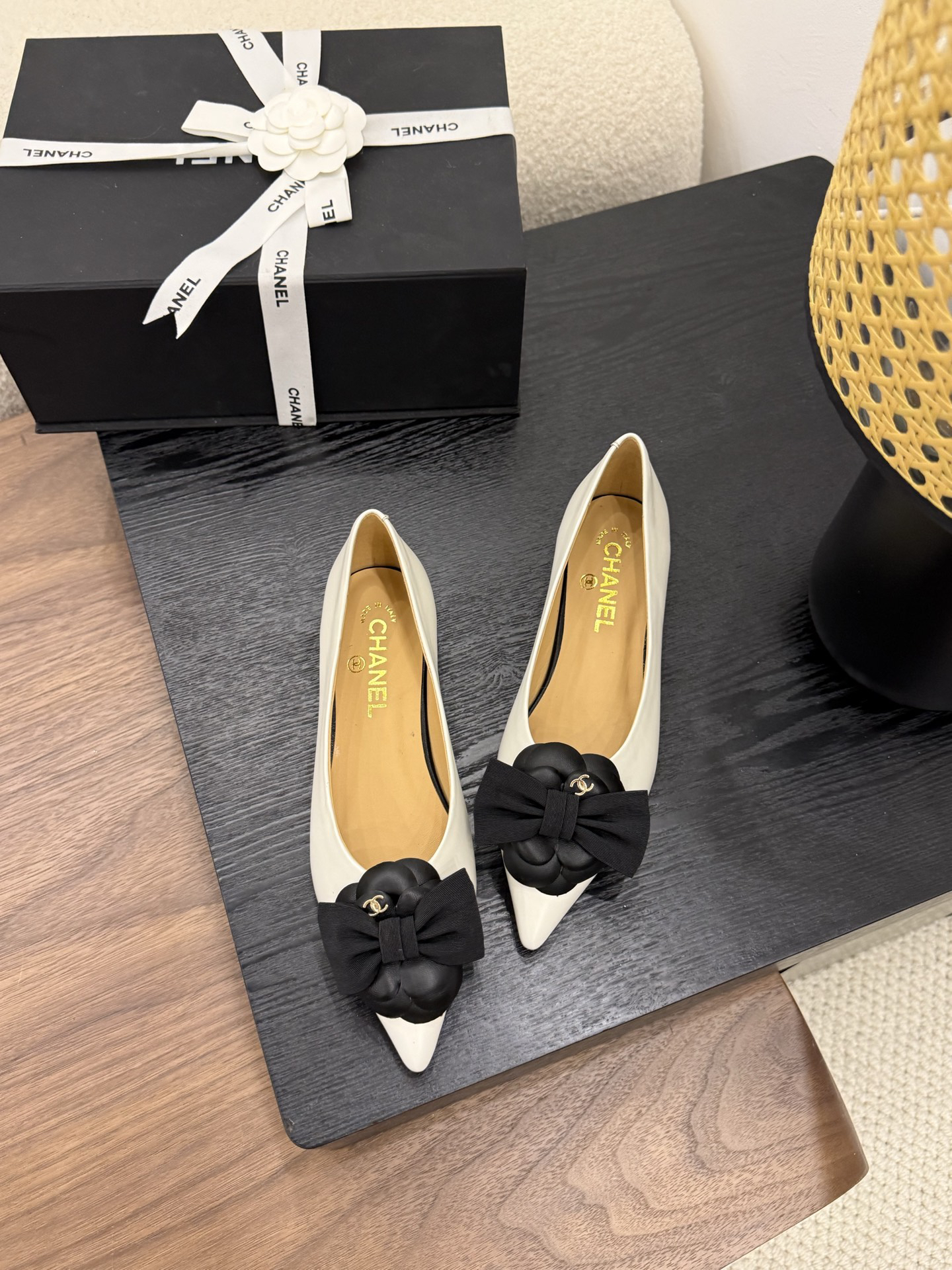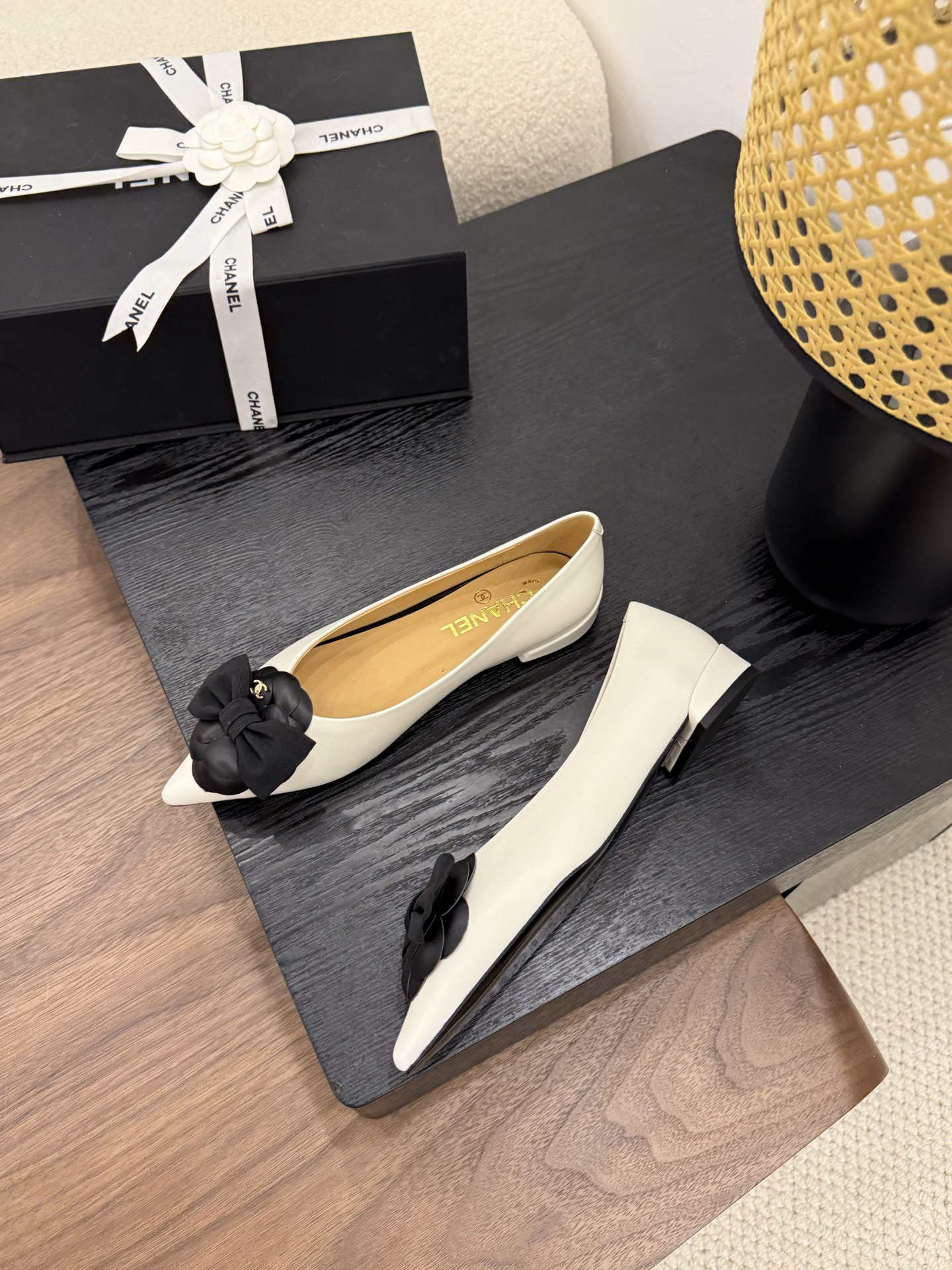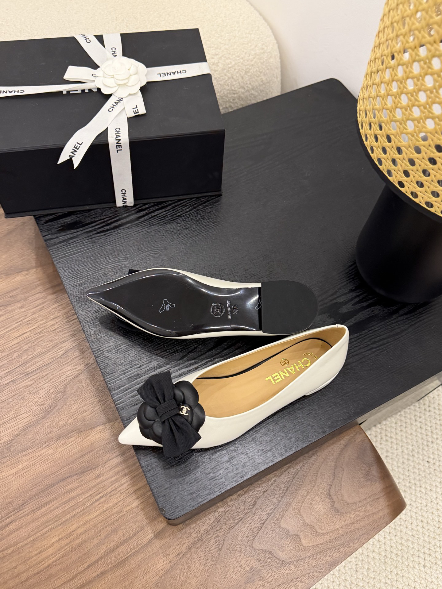 Design Elements: The shoe features an off-white upper with black camellia embellishments, a bow, and double C logos. The pointed toe and flat sole combine elegance and distinctiveness.