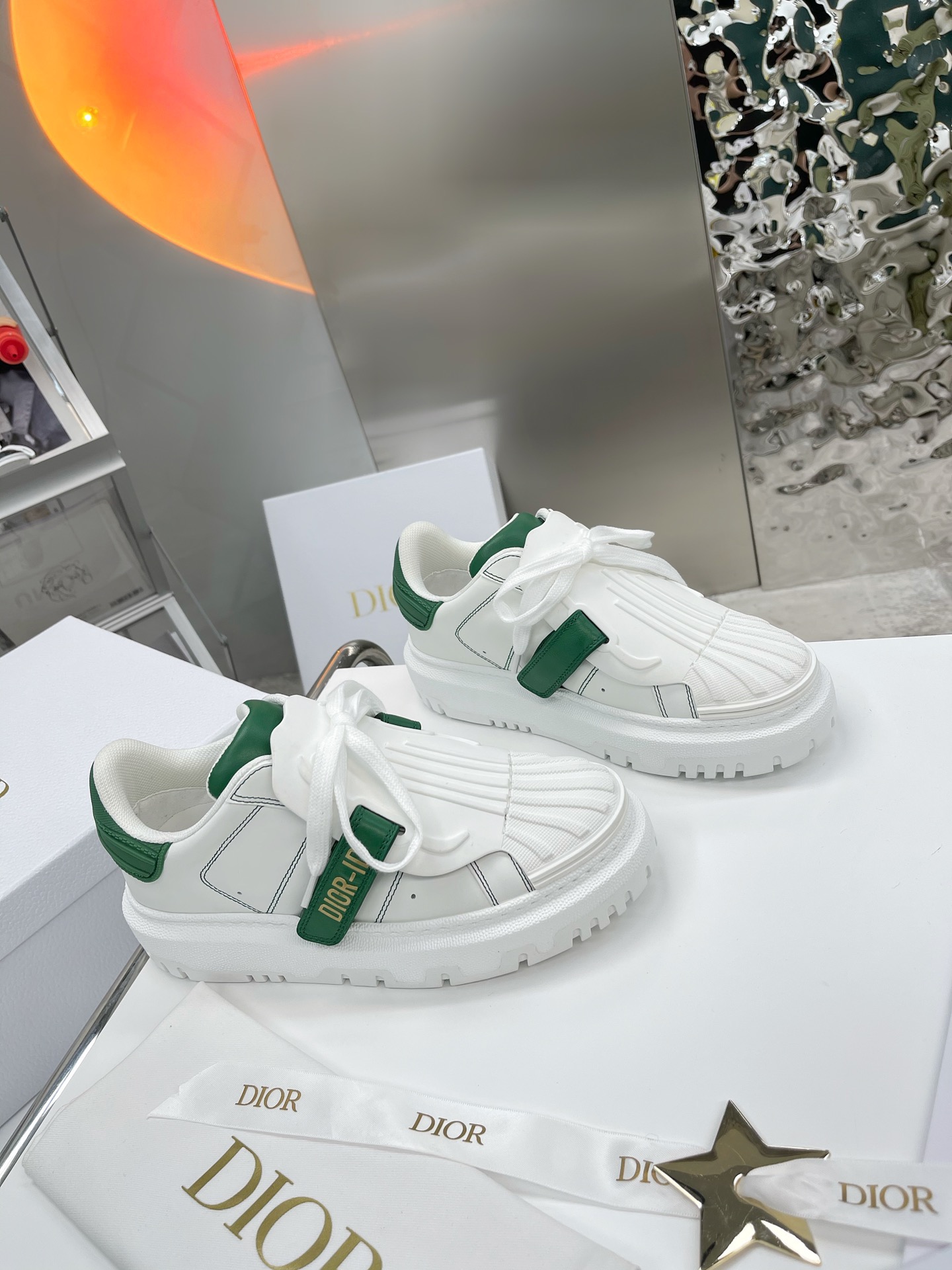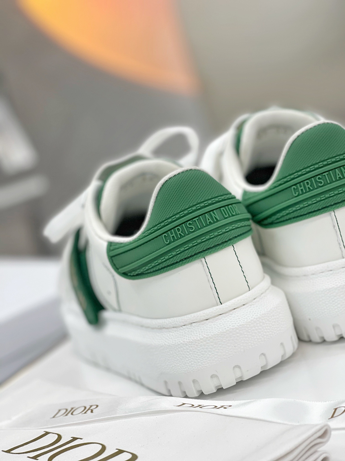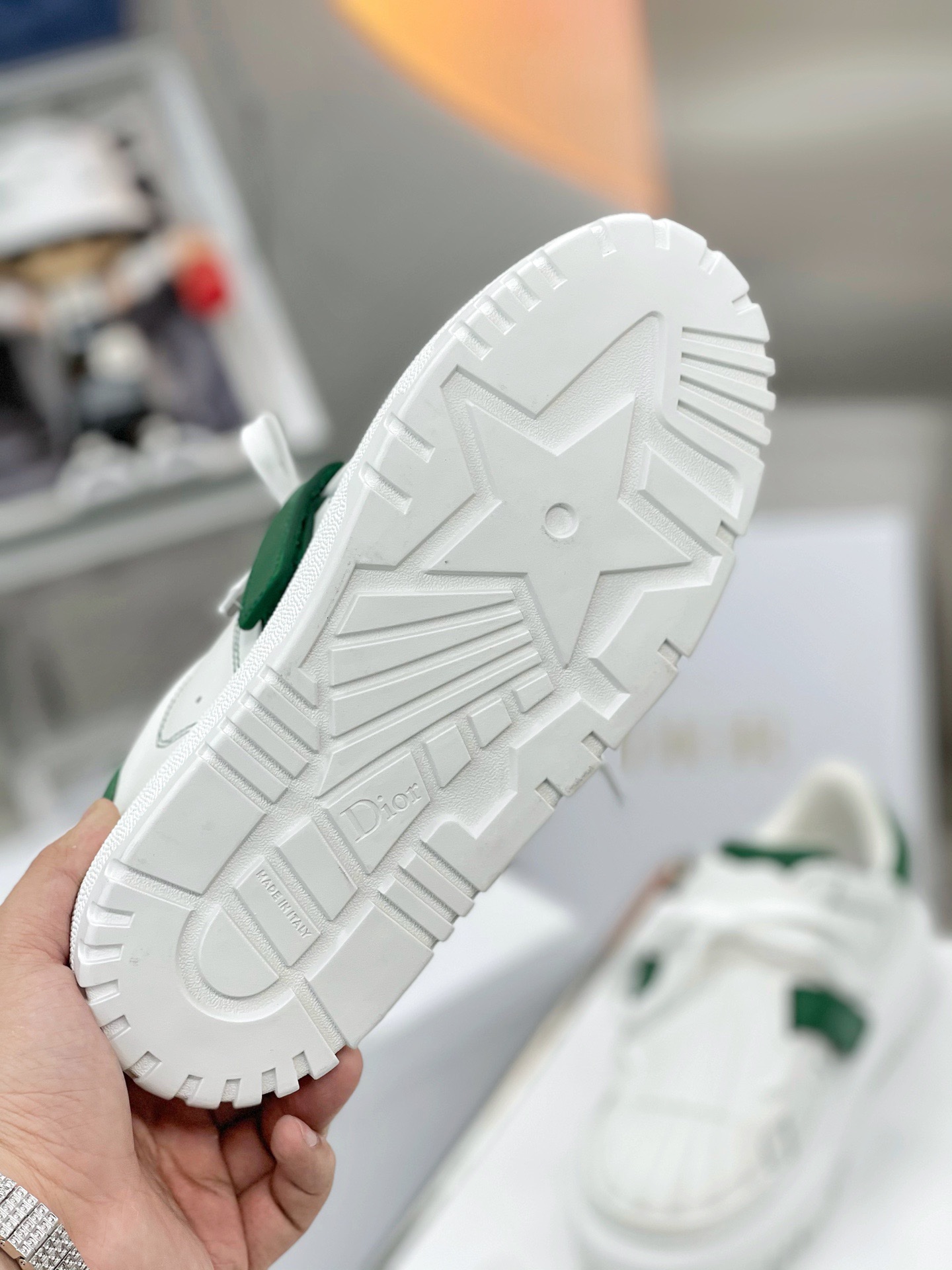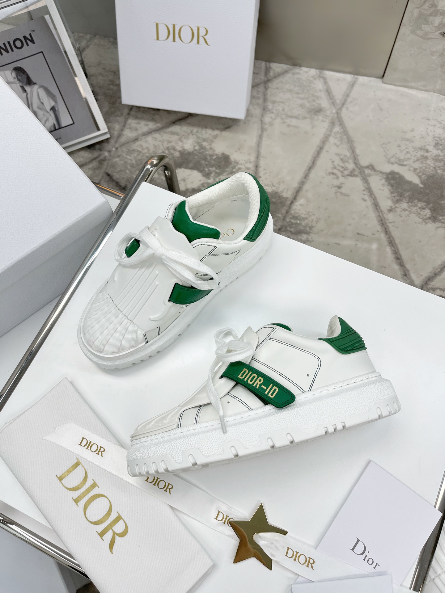 Upper: White leather with dark green accents, paired with a dark green Velcro strap featuring the “DIOR-ID” logo. The retro shell toe design and simple stitching create a sophisticated and sleek style.