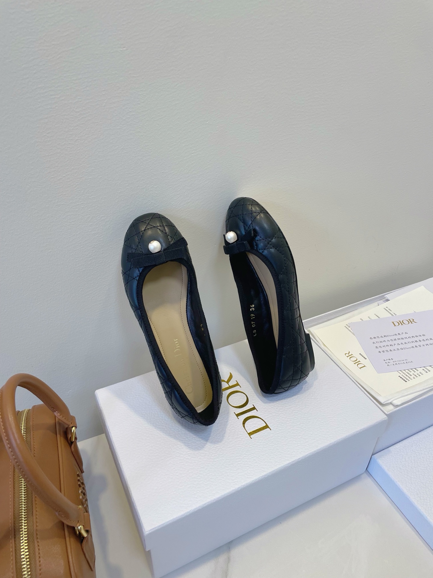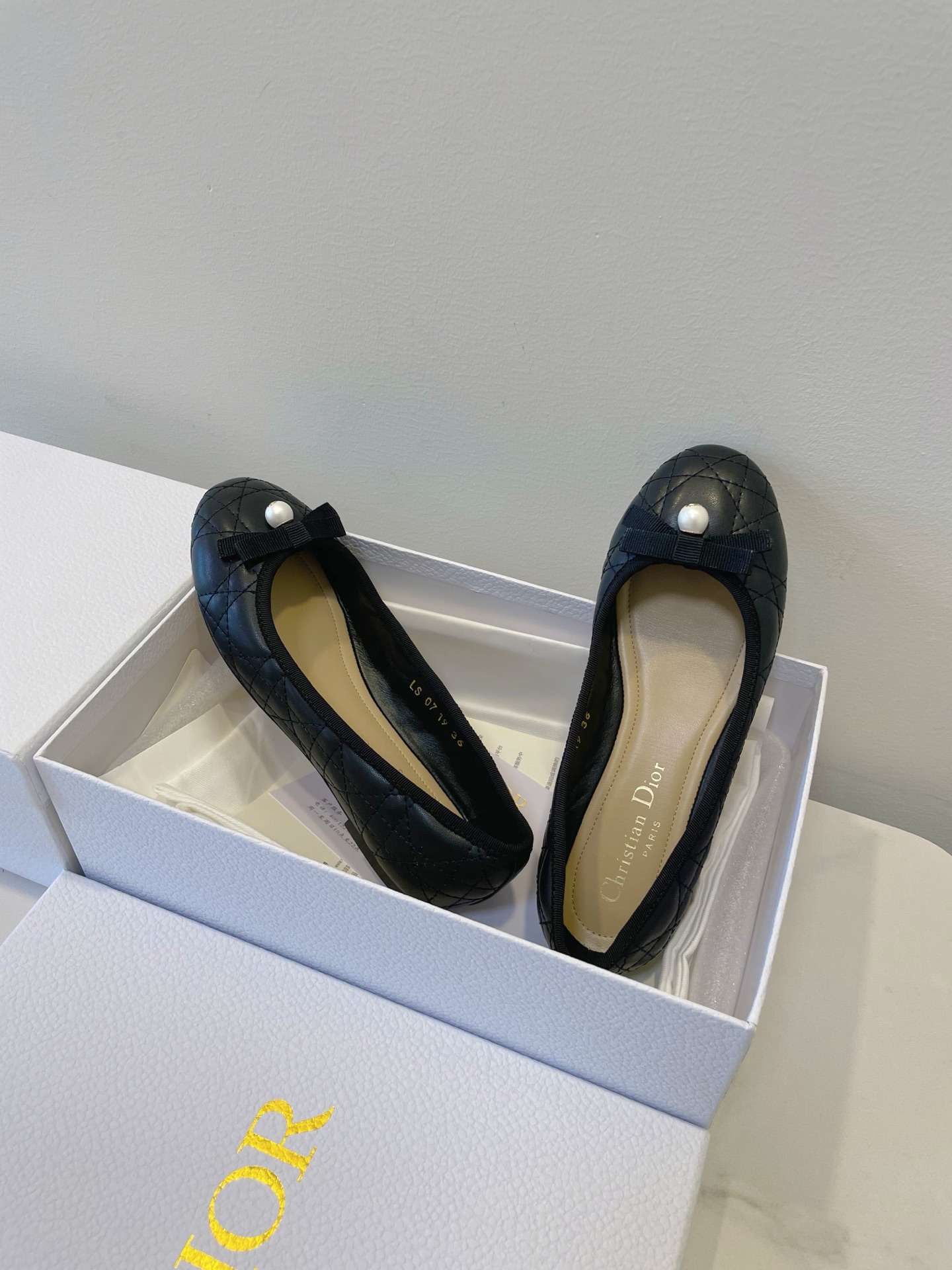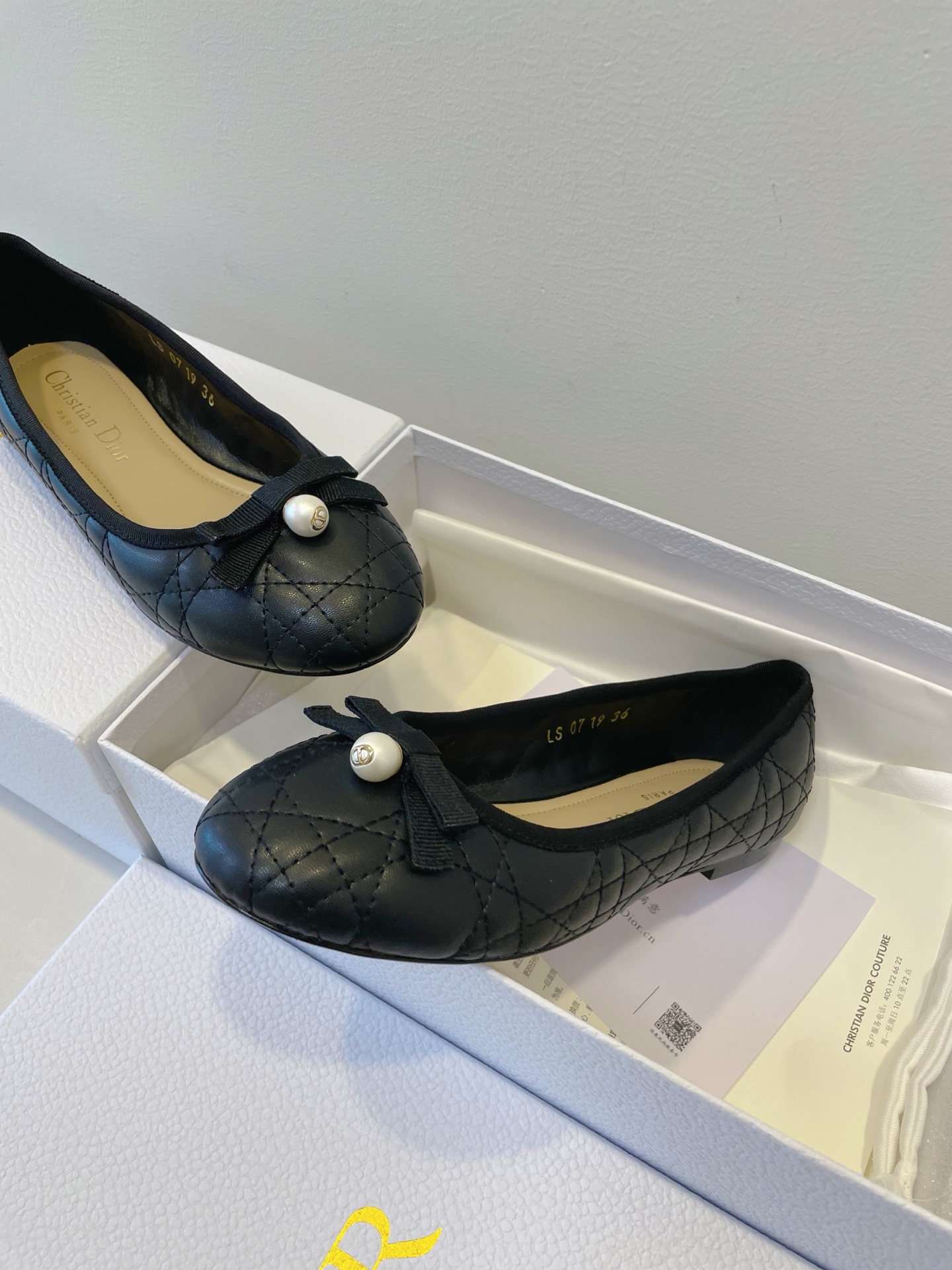 Embellishing: A matching bow at the toe, centered with a pearl buckle (a signature Dior element), combining elegance and sophistication.