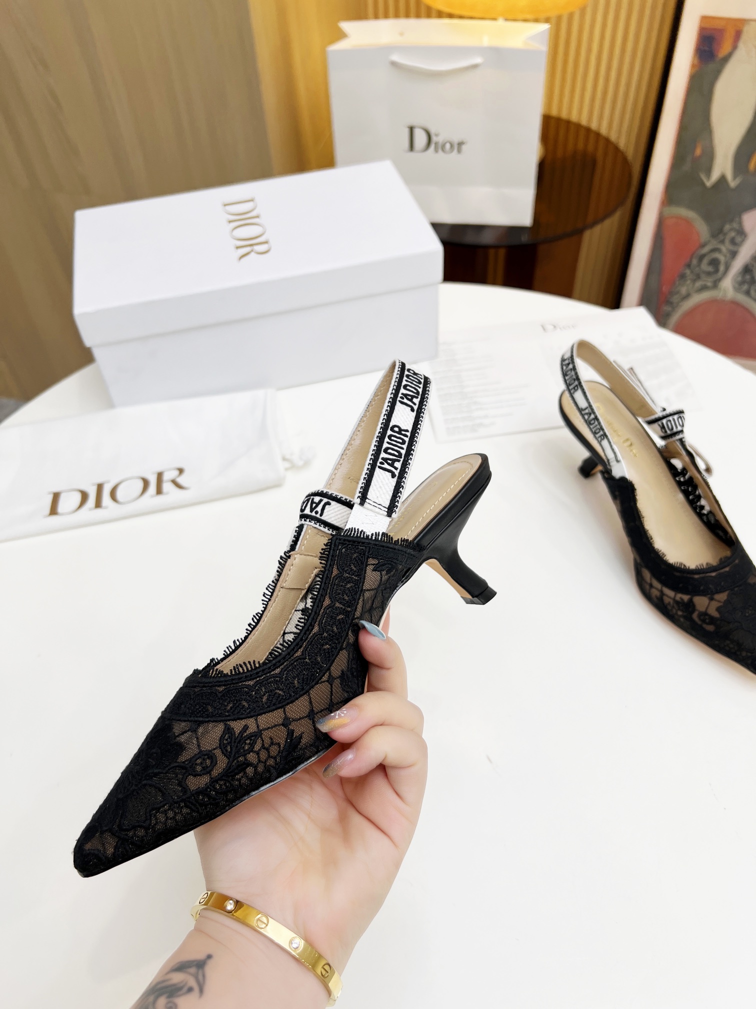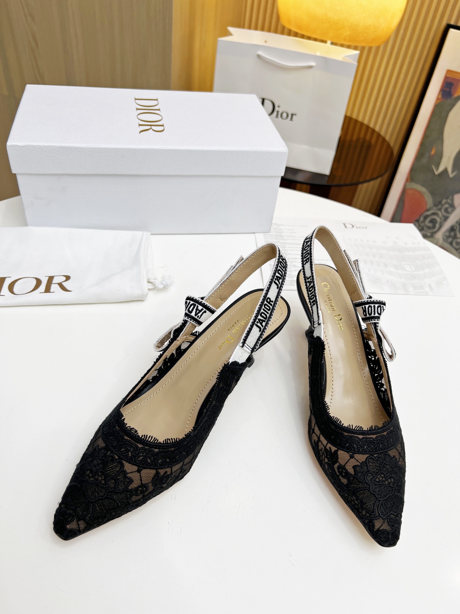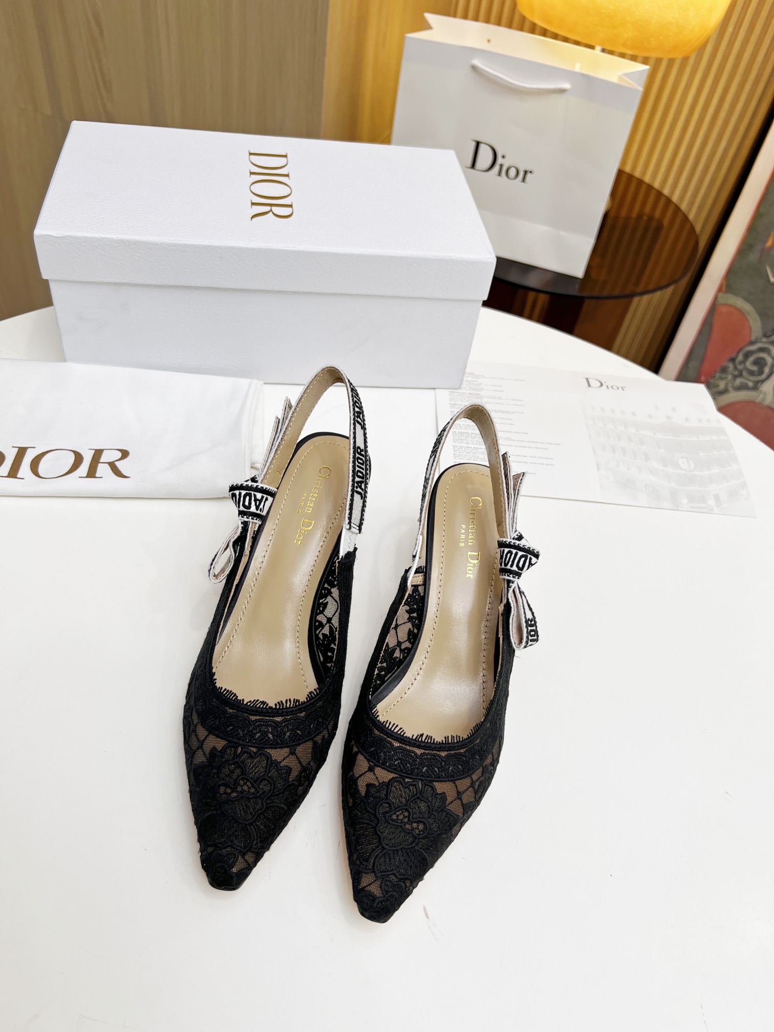 Upper: Made of black lace mesh with delicate, sheer patterns, paired with a black and white “J’Adior” logo webbing (with a bow embellishment), creating a gentle yet distinctive style;