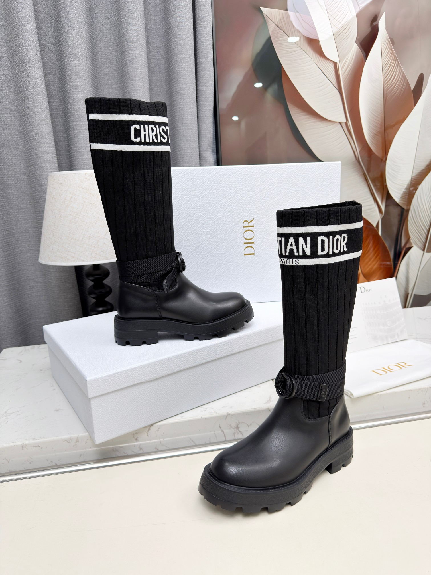 Dior Knit Logo Black & White Lettering Knee-High Boots