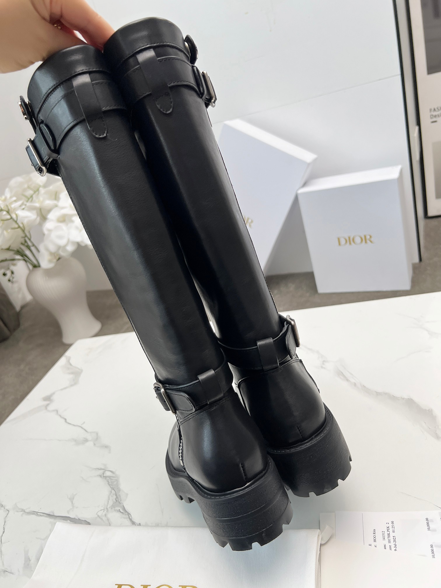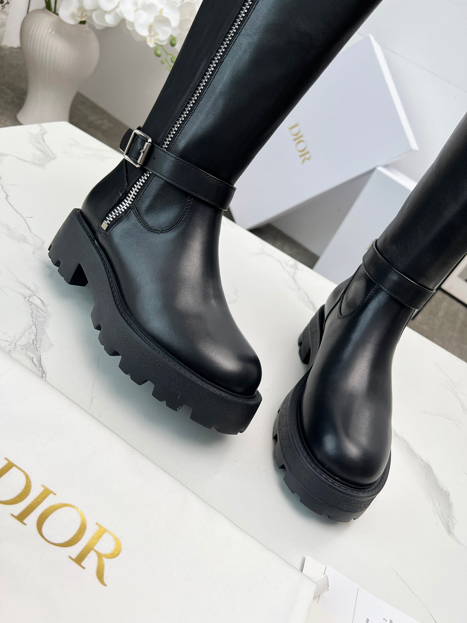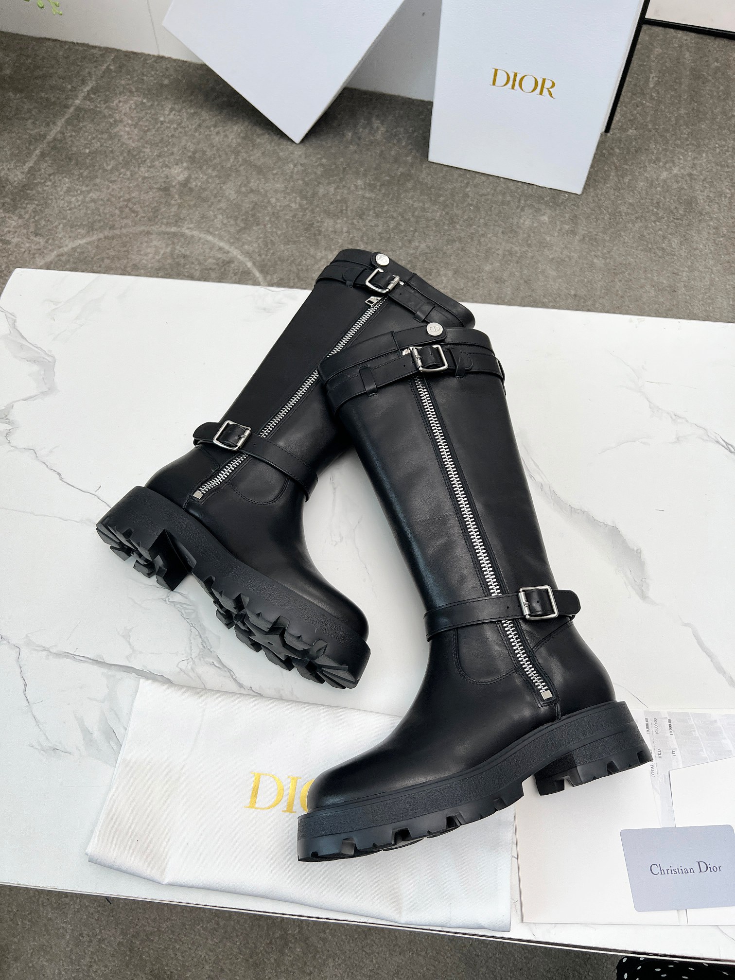 Dior Quilted Black Diamond-Pattern Chunky Heel Knee-High Boots