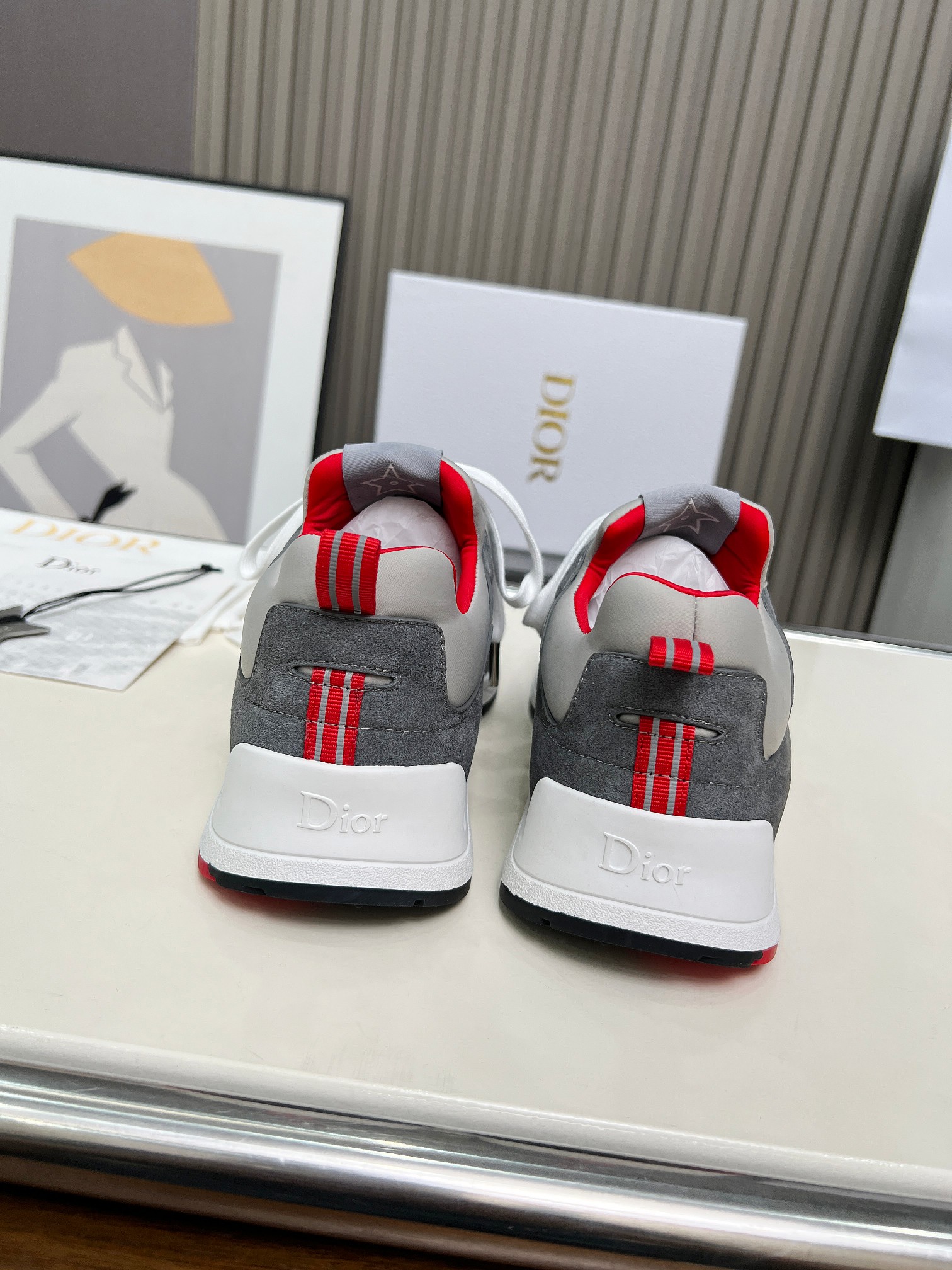 Details: Red accents on the inner lining of the collar and heel, along with the “Dior” logo on the tongue and metal details on the lace loops, enhance brand recognition.