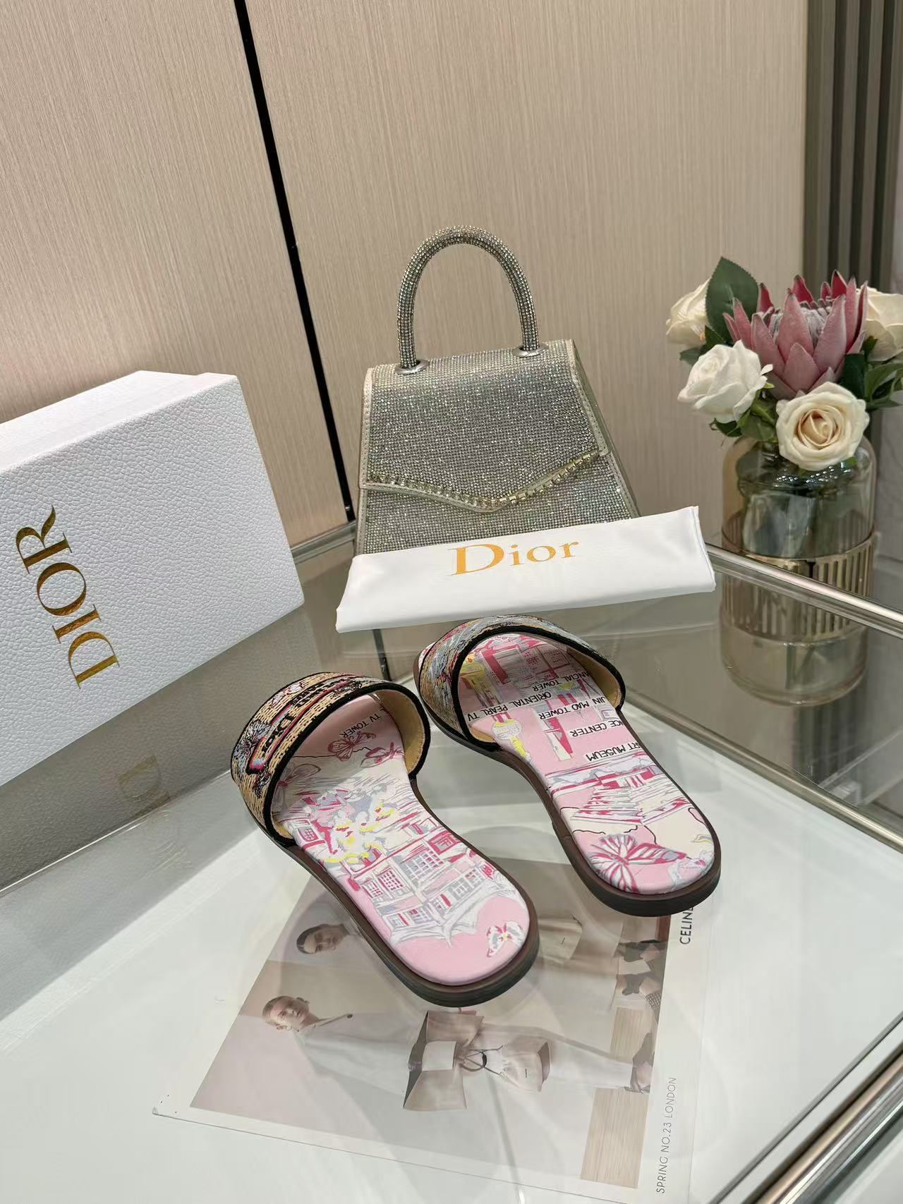 Upper: Crafted from silk jacquard fabric, printed with vintage tropical motifs (palm trees, flowers, architecture), and finished with a brown woven strap featuring the “DIOR” logo.
