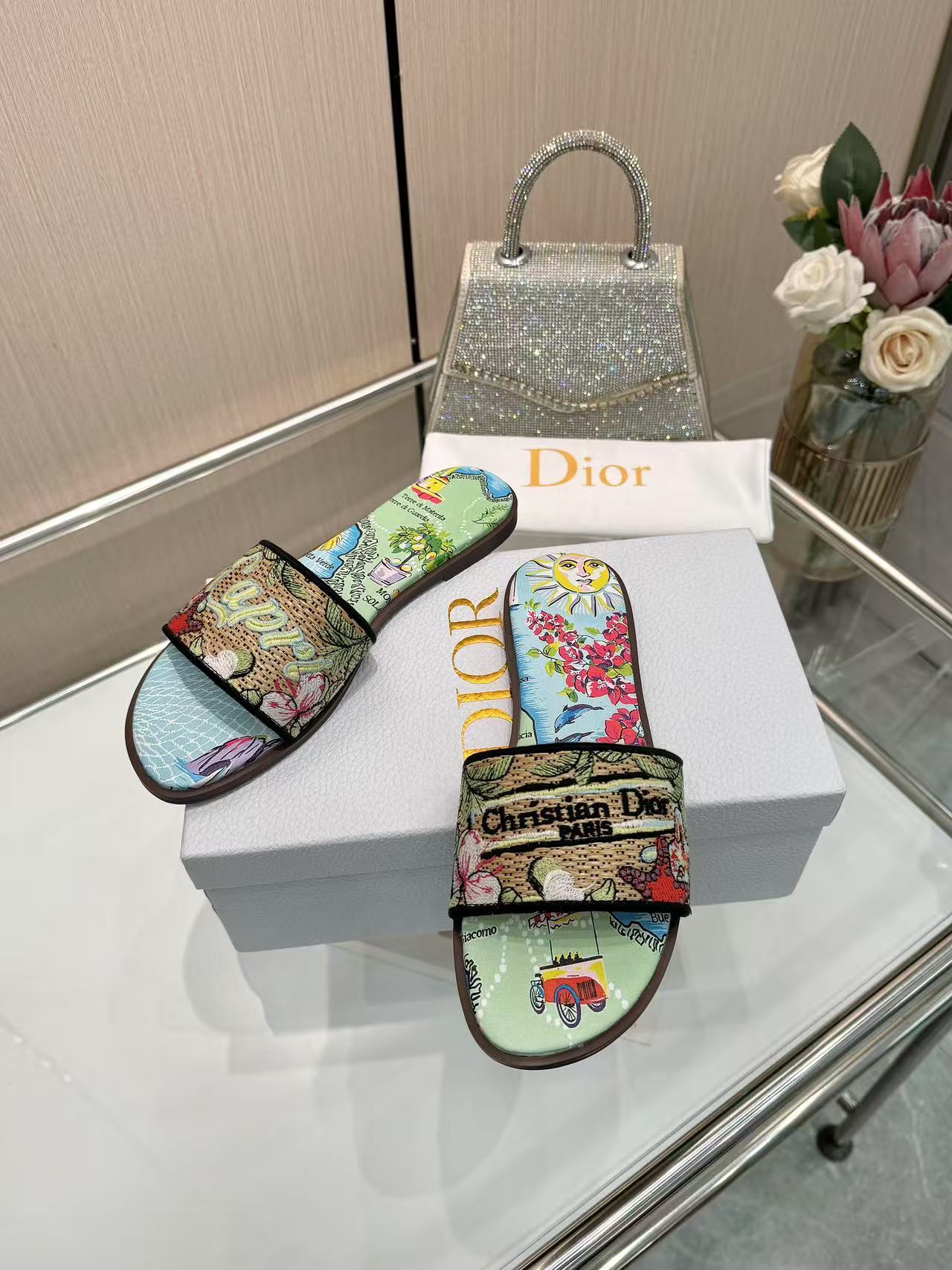 Upper: Crafted from silk jacquard fabric, printed with vintage tropical motifs (palm trees, flowers, architecture), and finished with a brown woven strap featuring the “DIOR” logo.