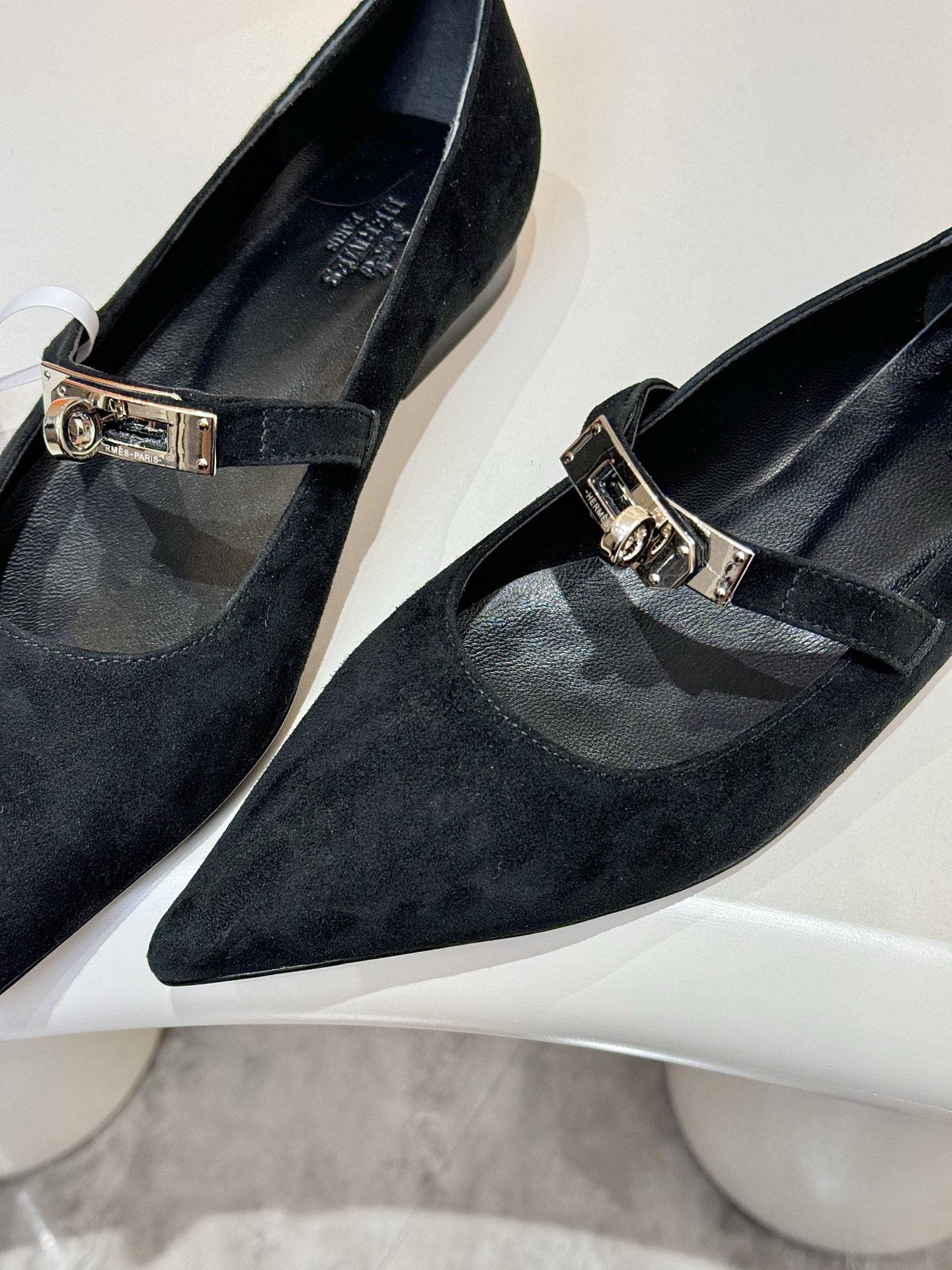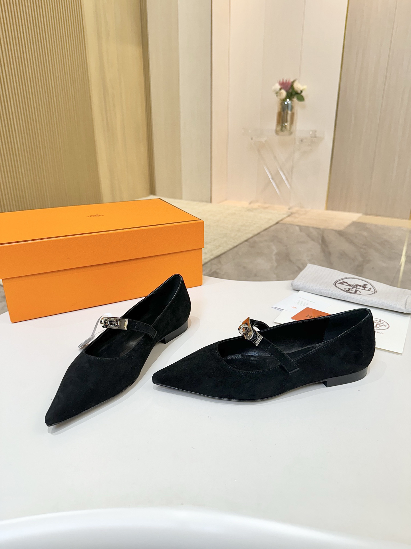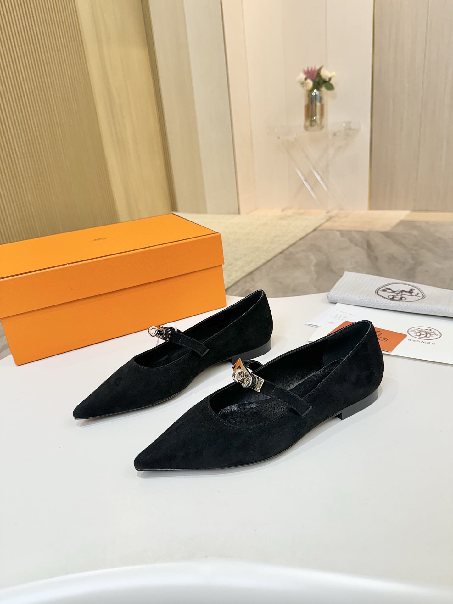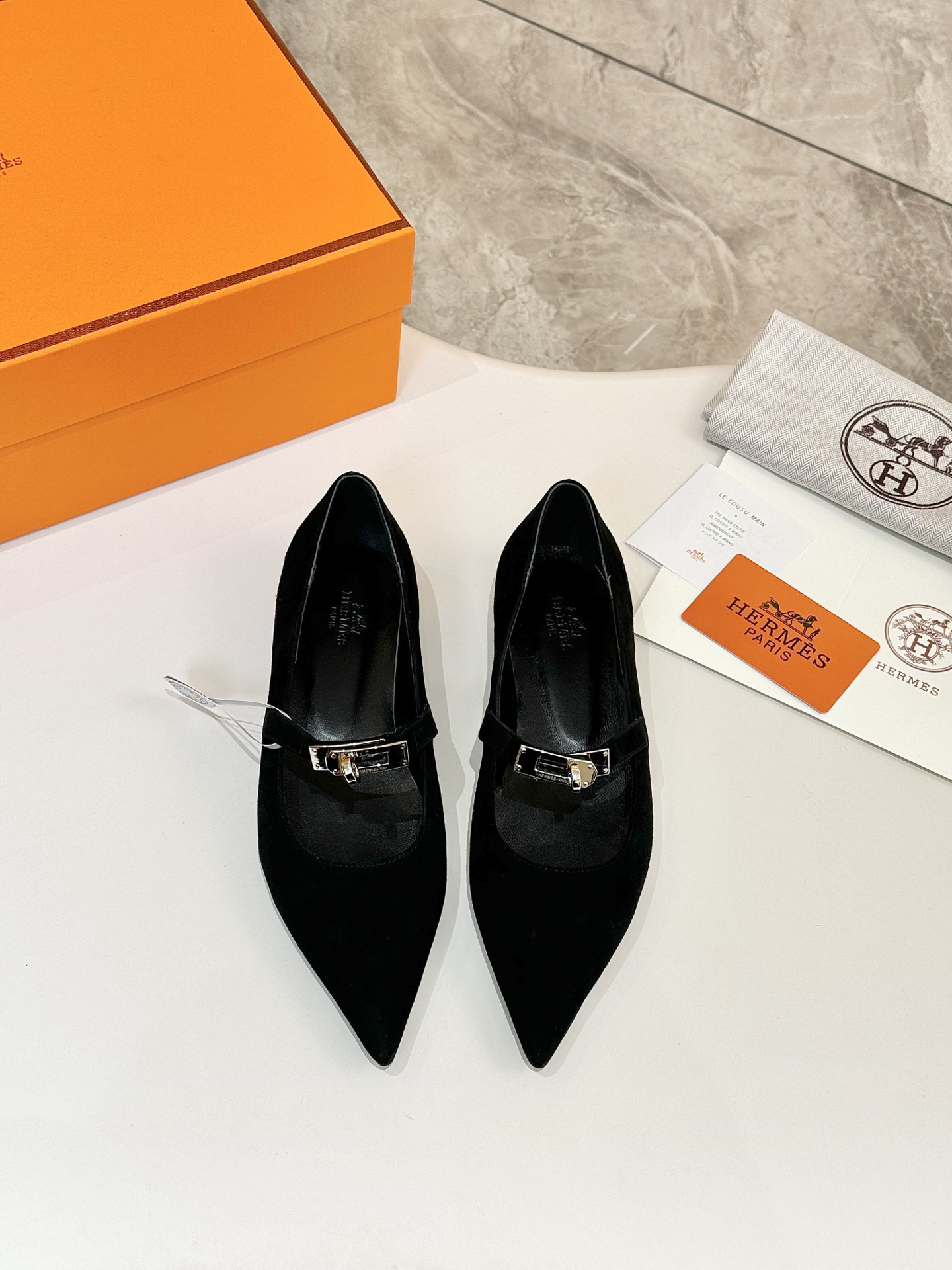 Features: These ballet flats are crafted from supple cashmere leather and feature the iconic Kelly buckle. They boast an elegant silhouette with a pointed toe and a comfortable flat sole.