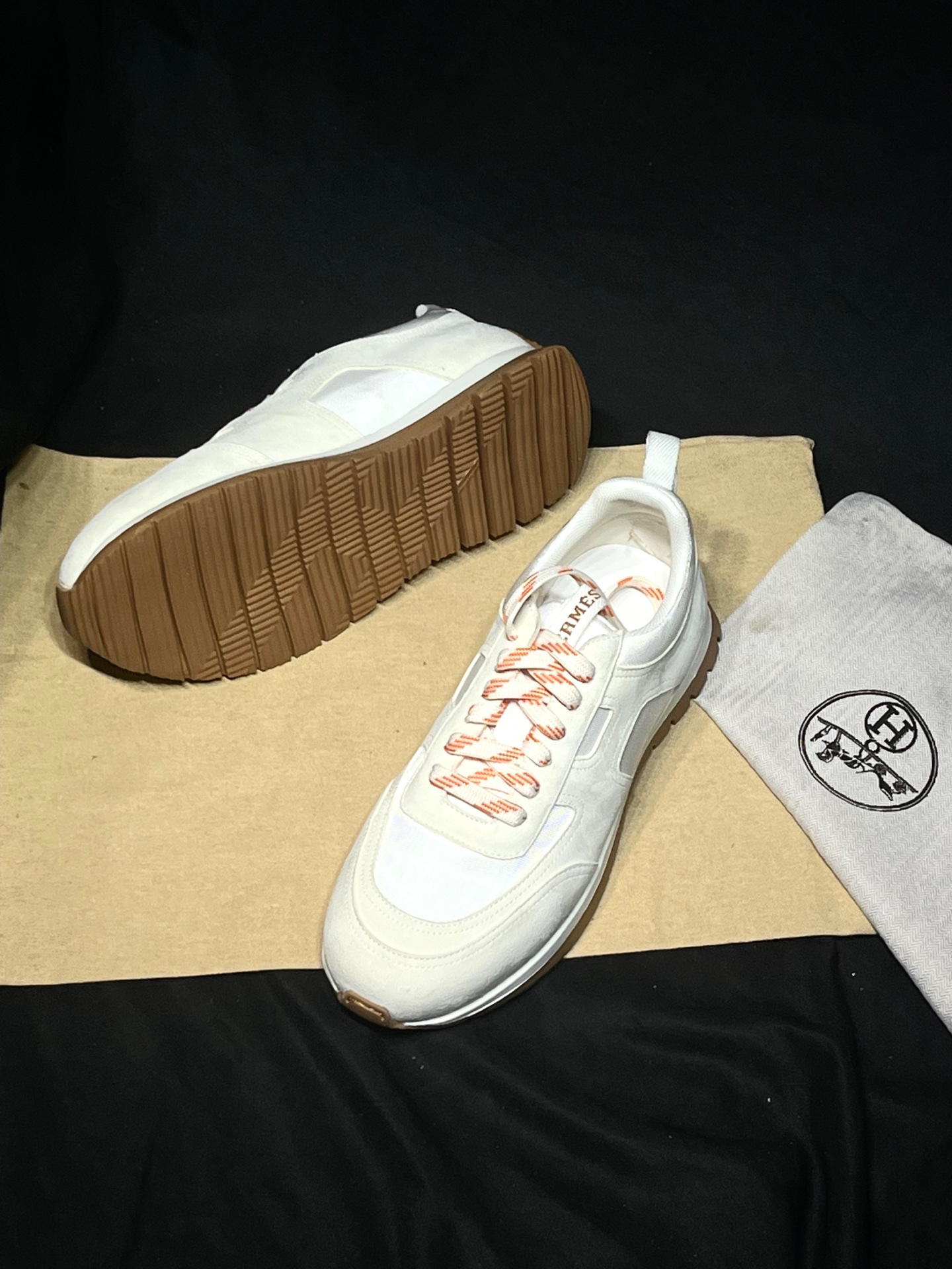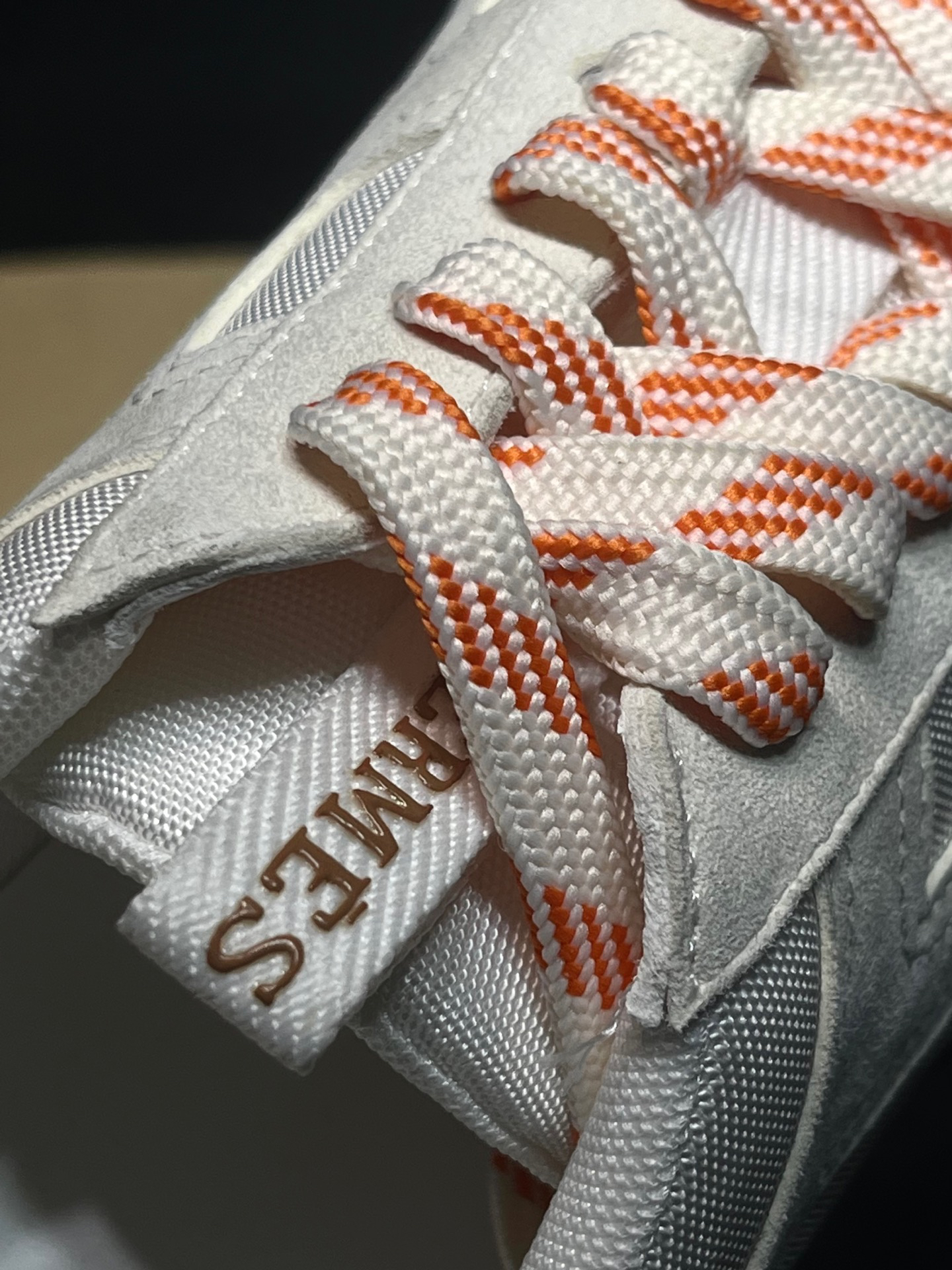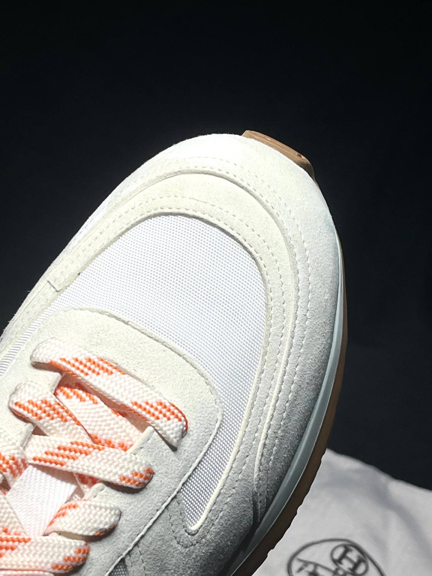 Design Features: A minimalist lace-up sneaker design with the signature orange trim on the sole and a “H en biais” pattern on the side of the sole, showcasing a modern retro style.