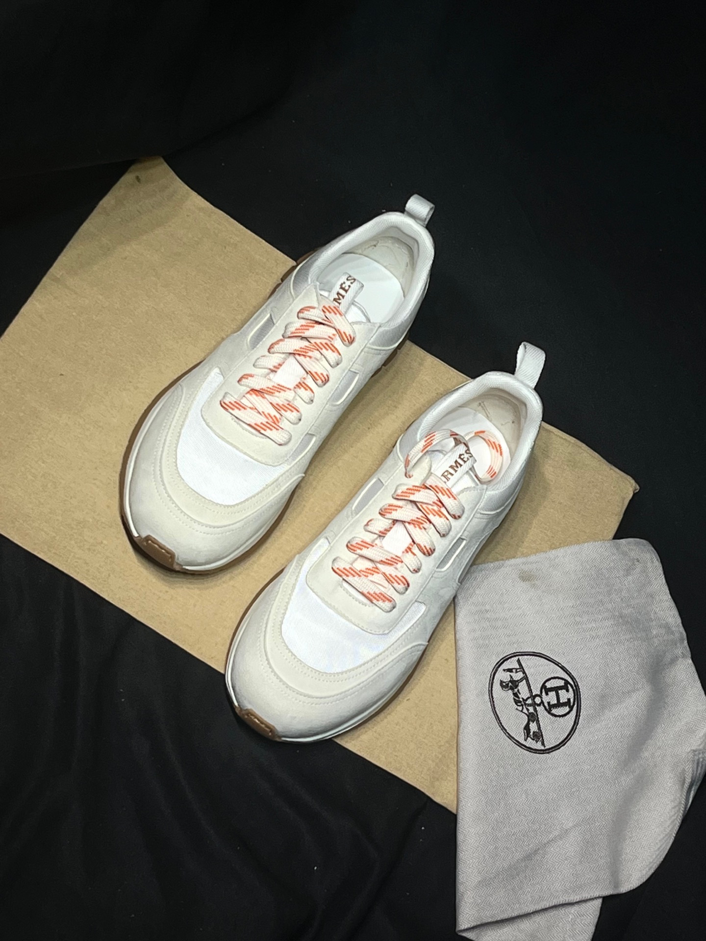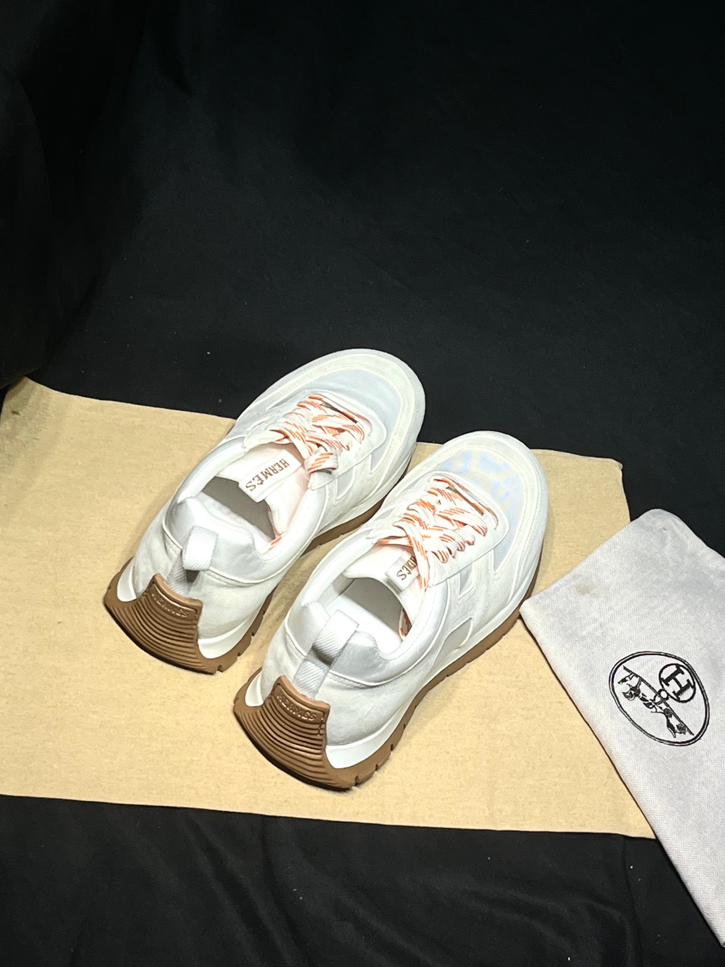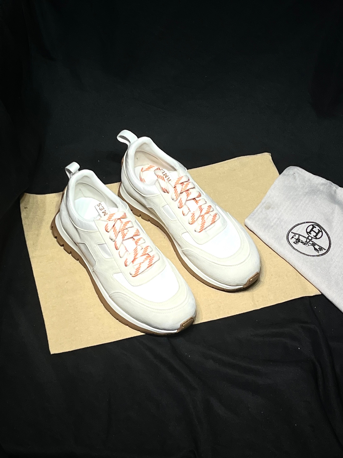 Design Features: A minimalist lace-up sneaker design with the signature orange trim on the sole and a “H en biais” pattern on the side of the sole, showcasing a modern retro style.