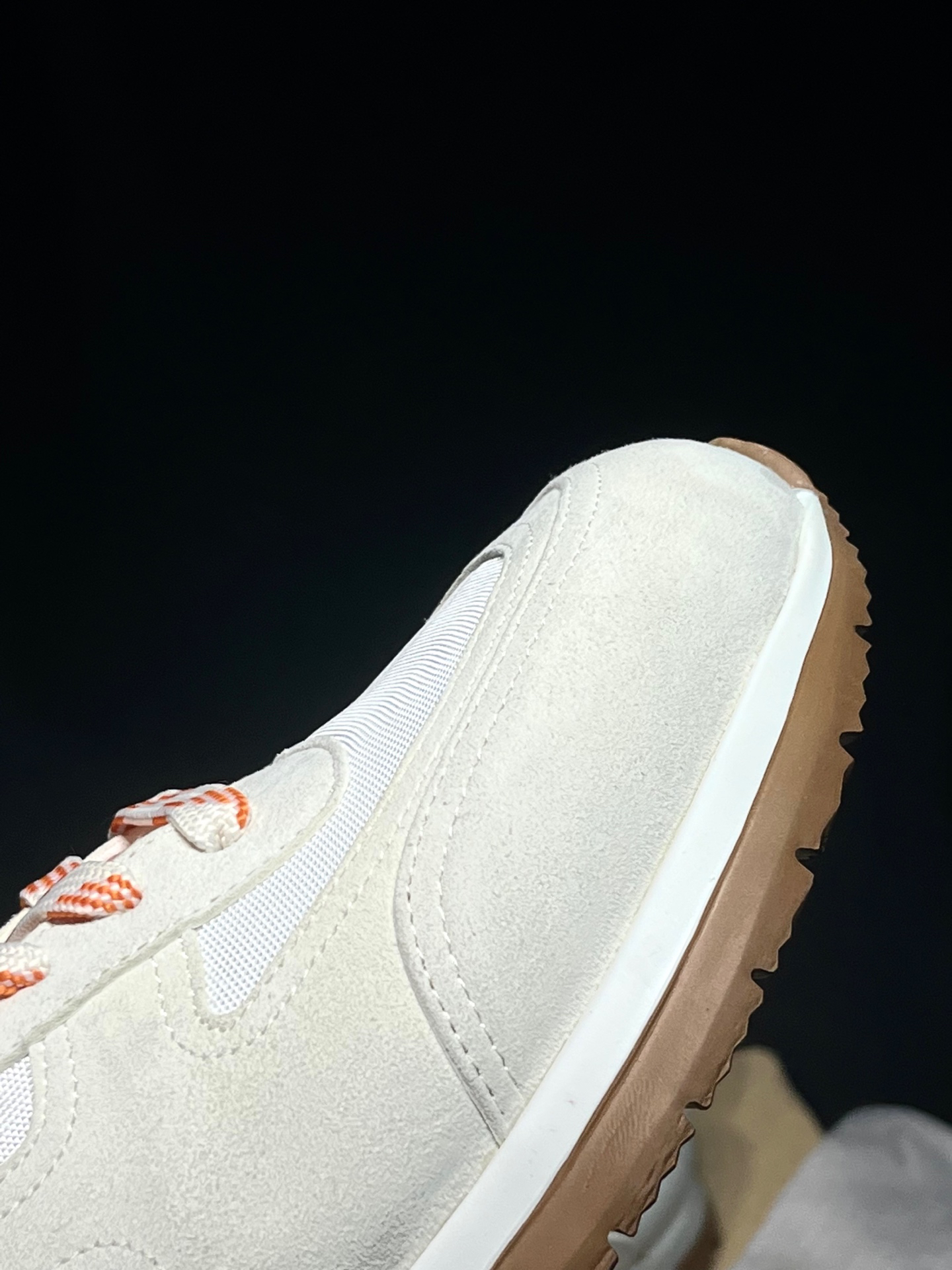 Color: The color scheme shown features a white upper with bright orange laces and sole details.