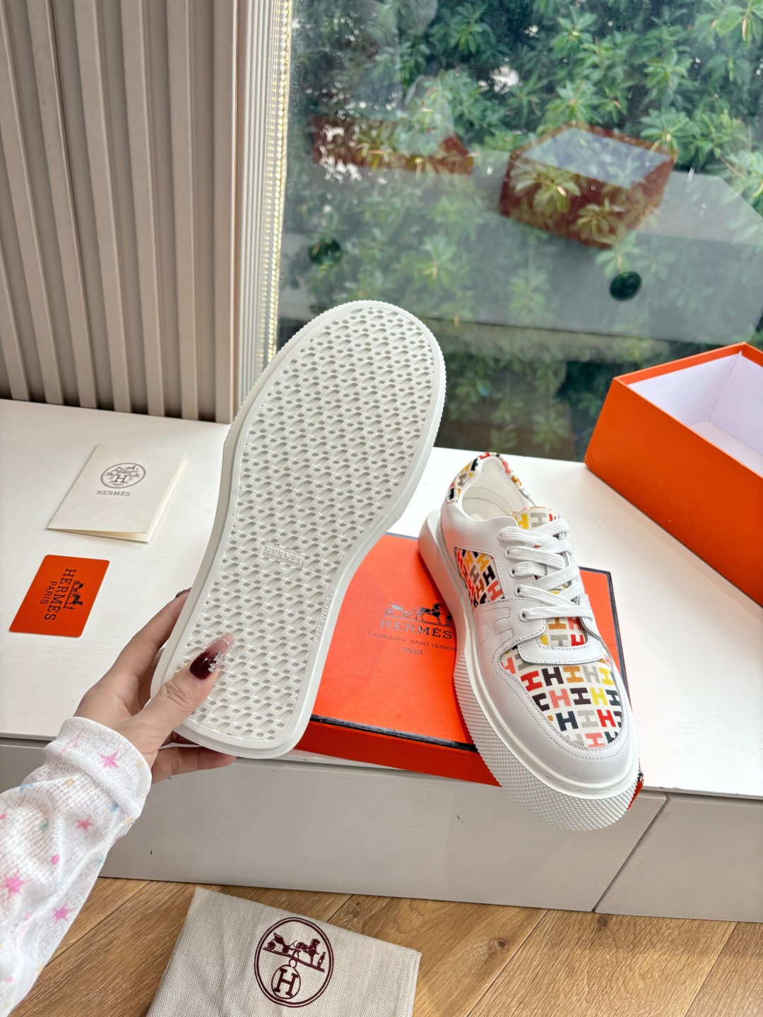 Features: These sneakers feature a lightweight sole adorned with the iconic “H en bias” logo. The upper is constructed from a combination of white calfskin and canvas (H canvas), accented with a brightly colored H letter pattern.