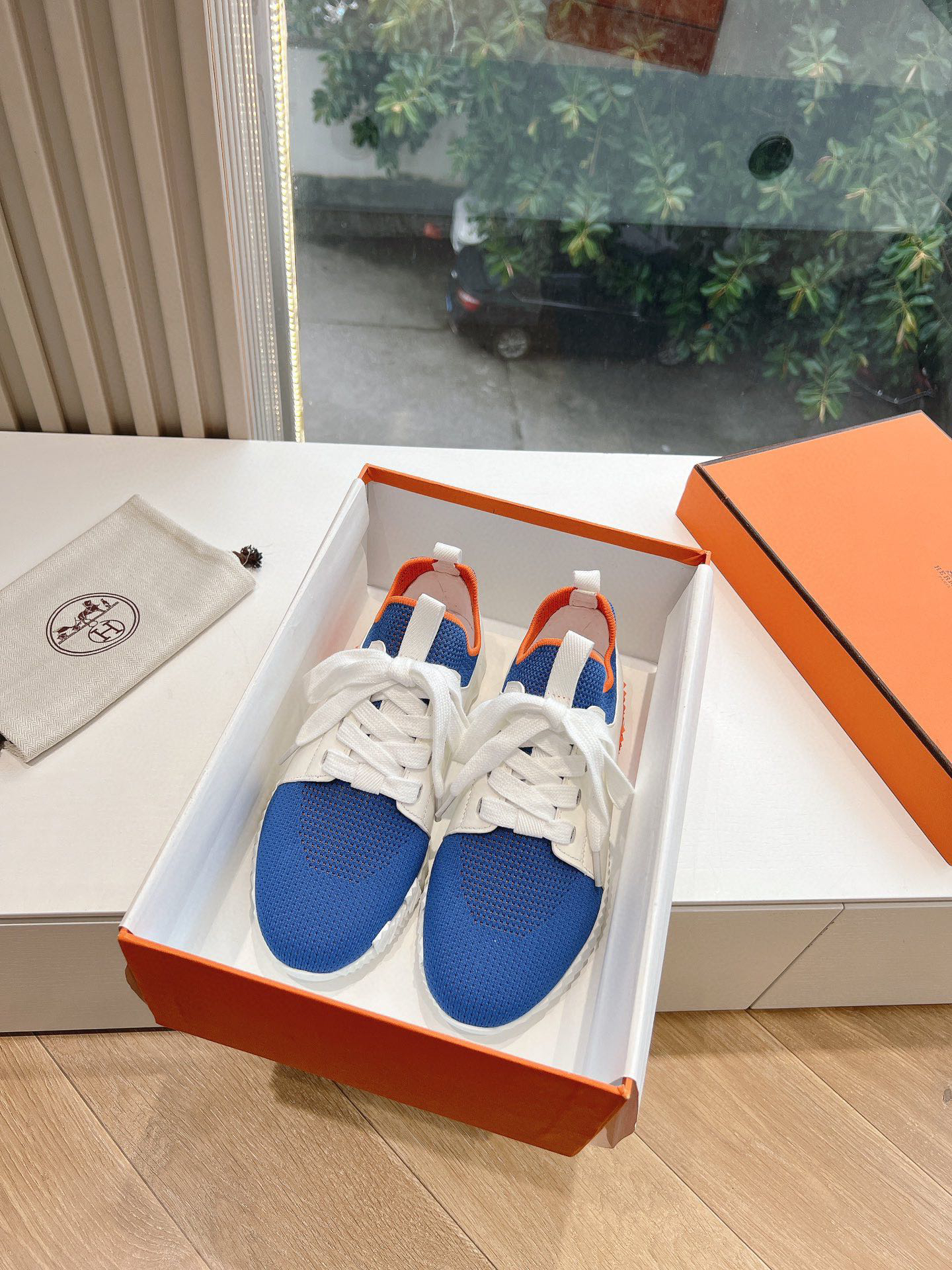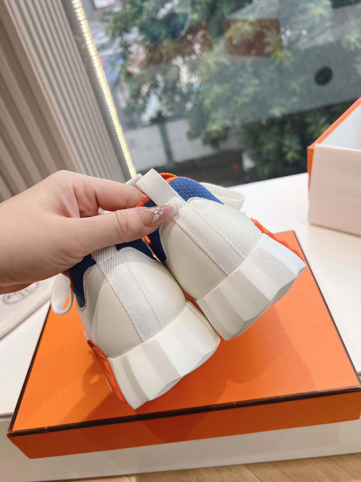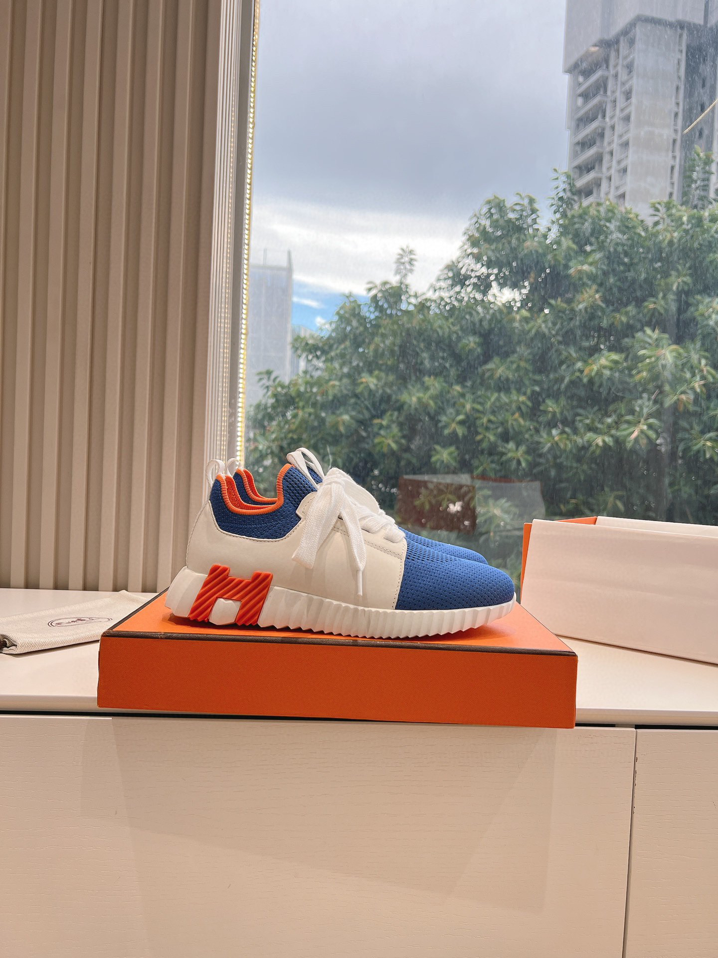 Features: These sneakers feature a lightweight sole and the iconic “H en biais” logo on the side. The upper is constructed from calfskin, mesh, and suede. The color scheme is a combination of blue, white, and orange.