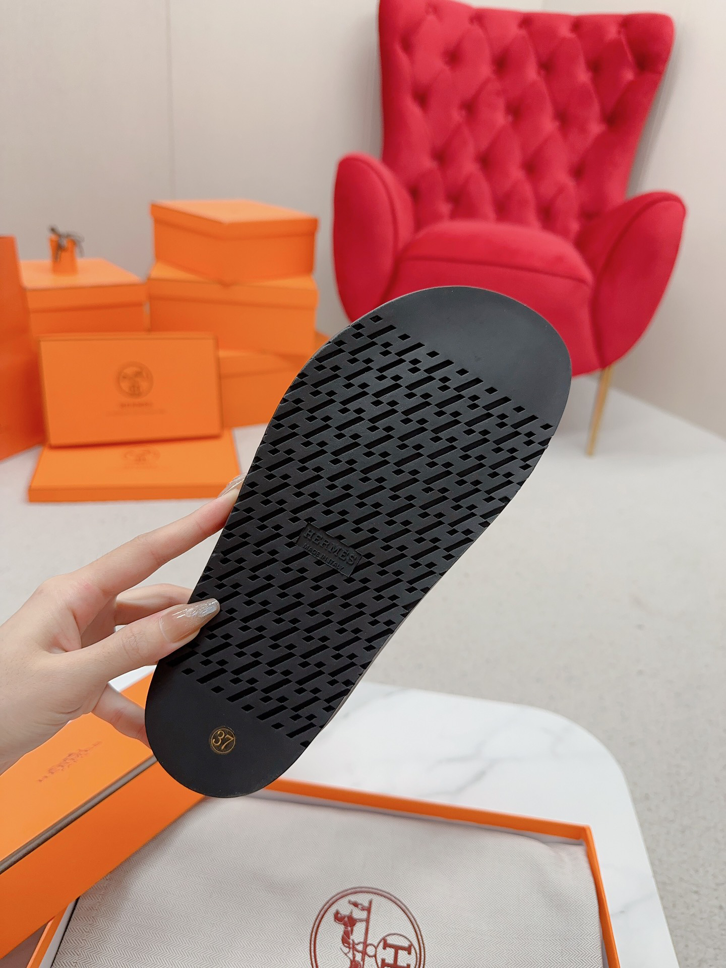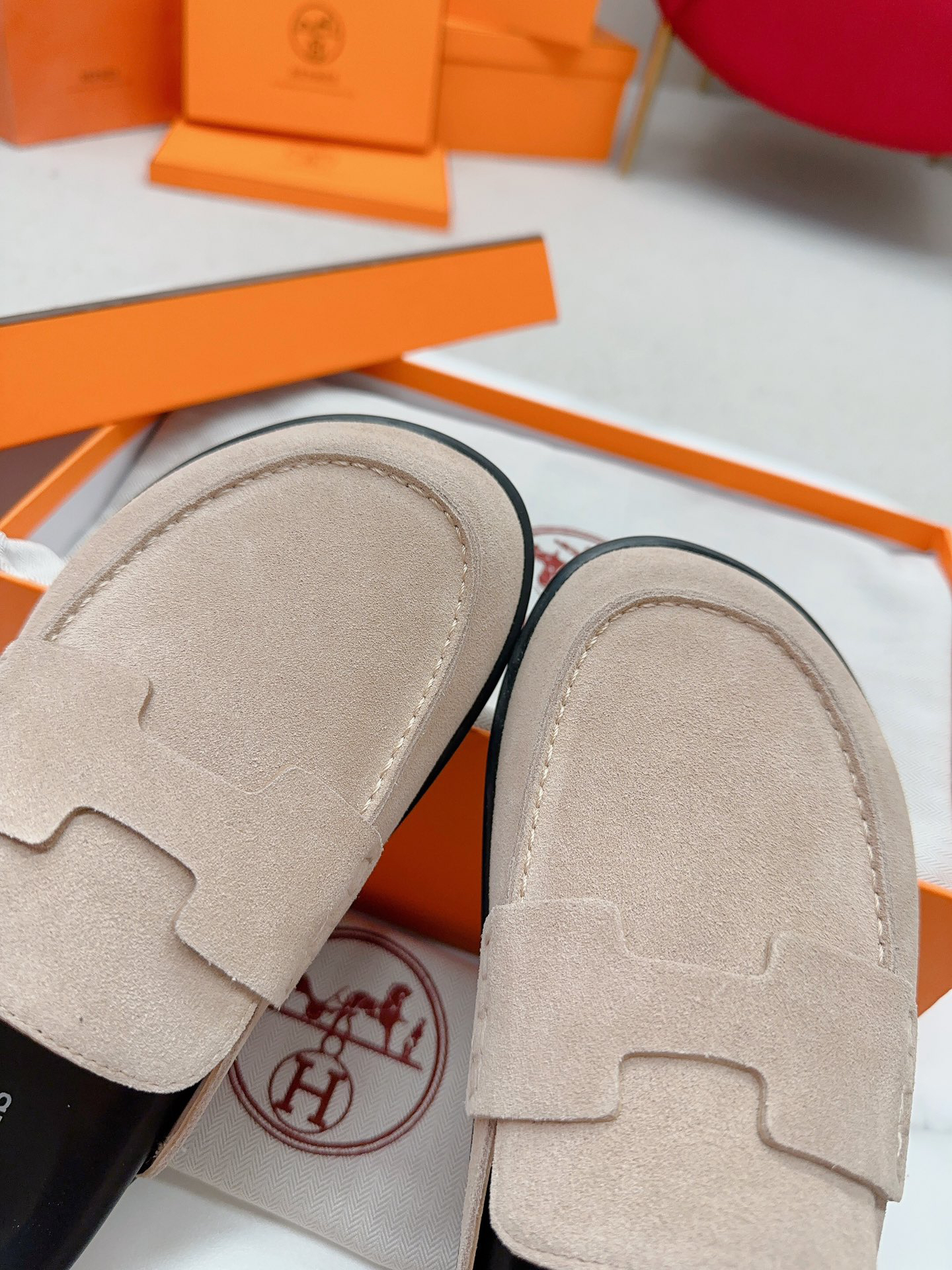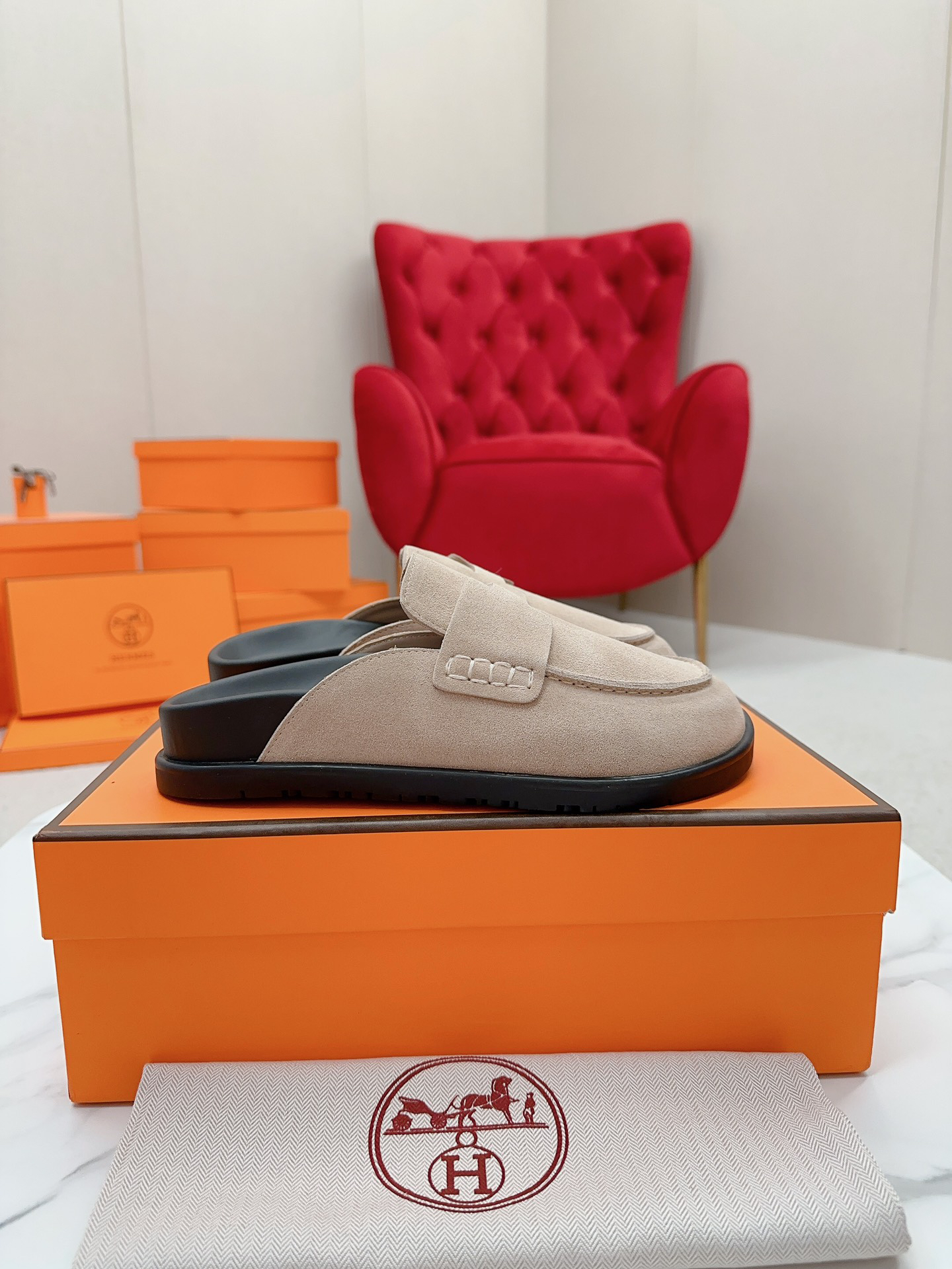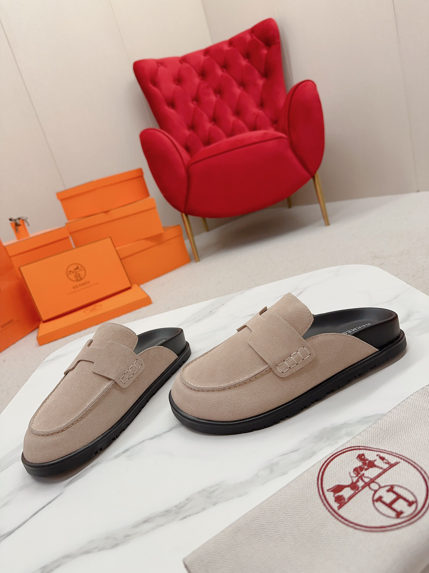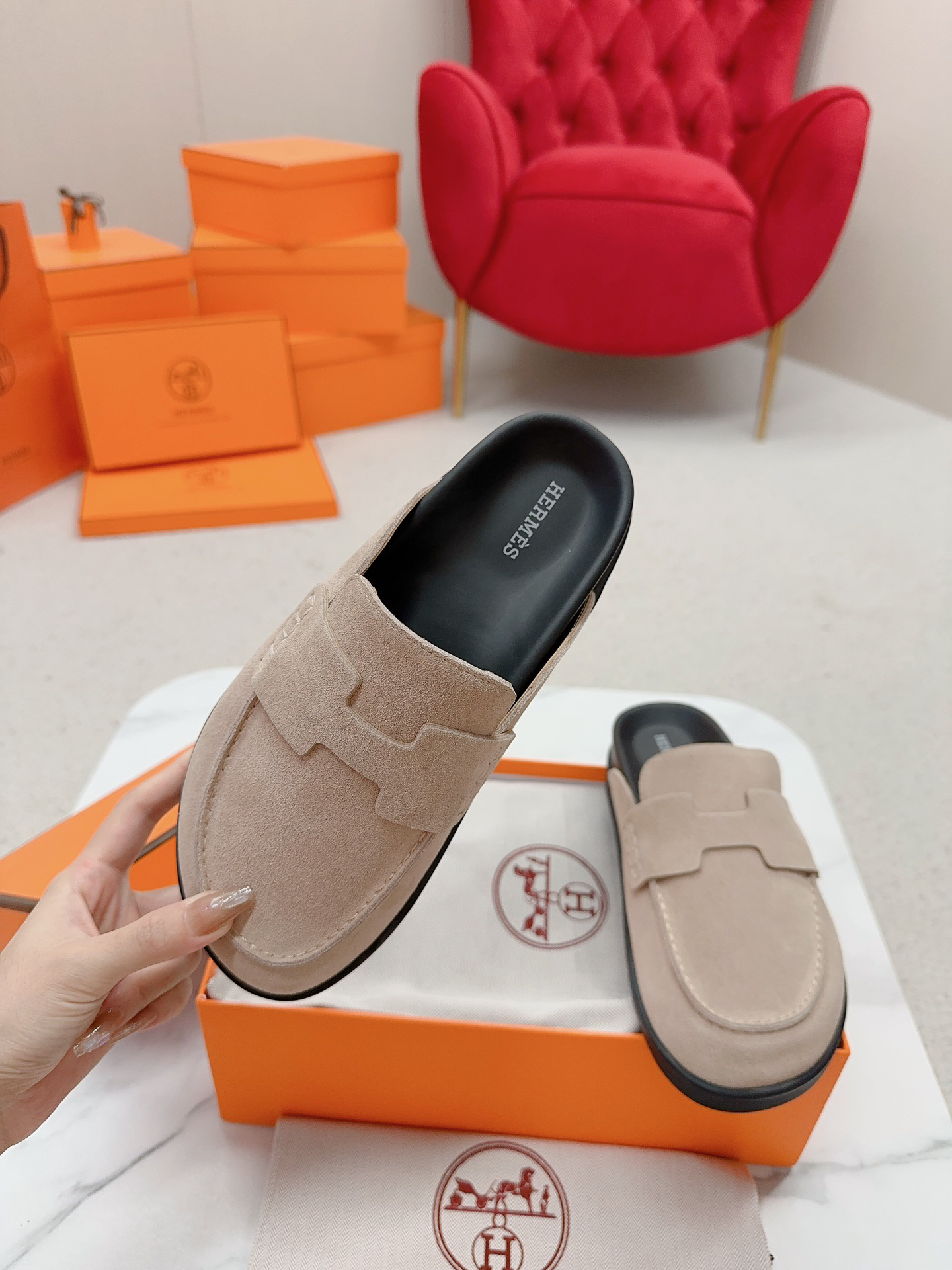 Hermès couple’s Birkenstocks, vintage slippers, teddy bear slippers, and H-shaped slippers.