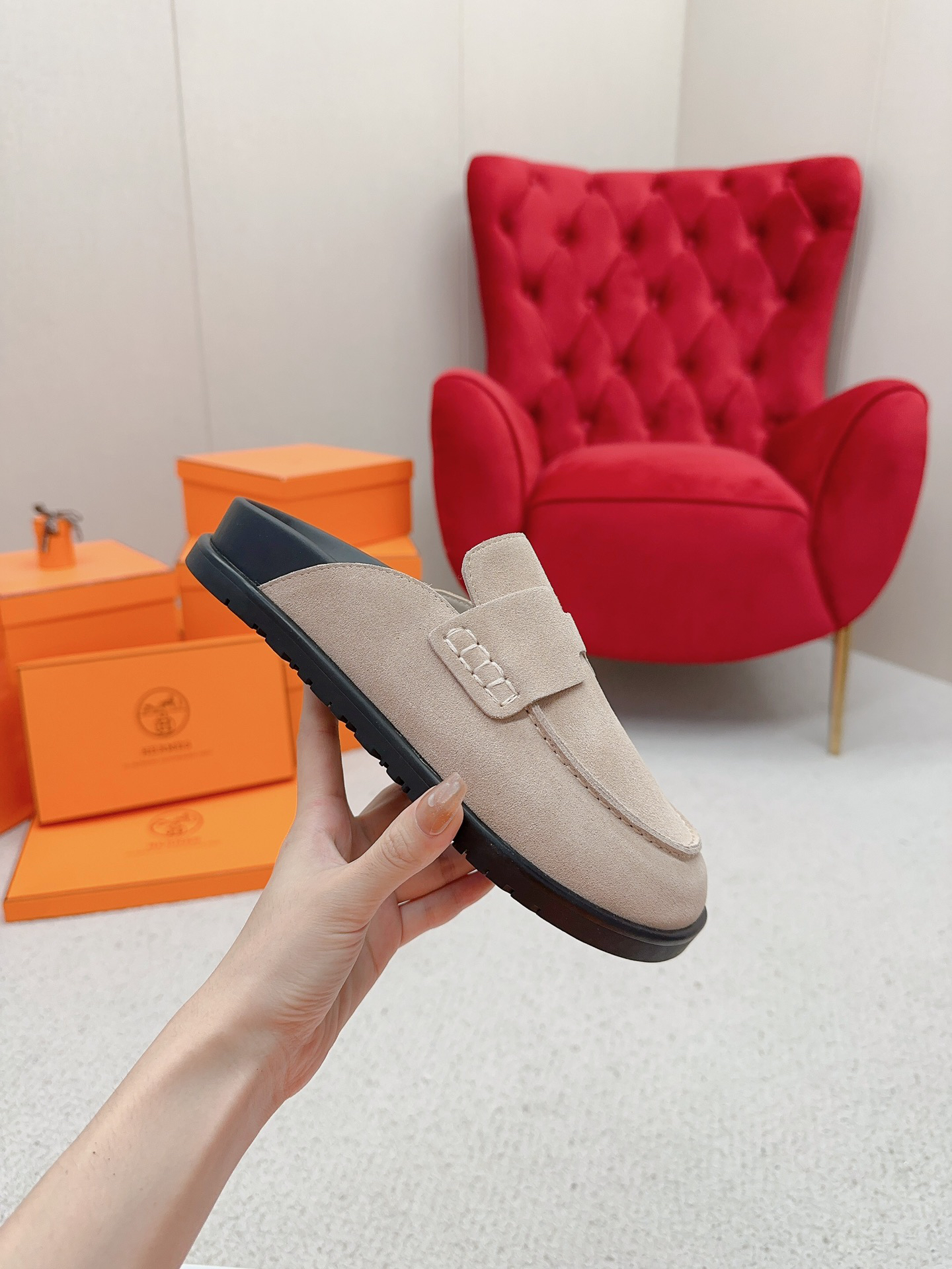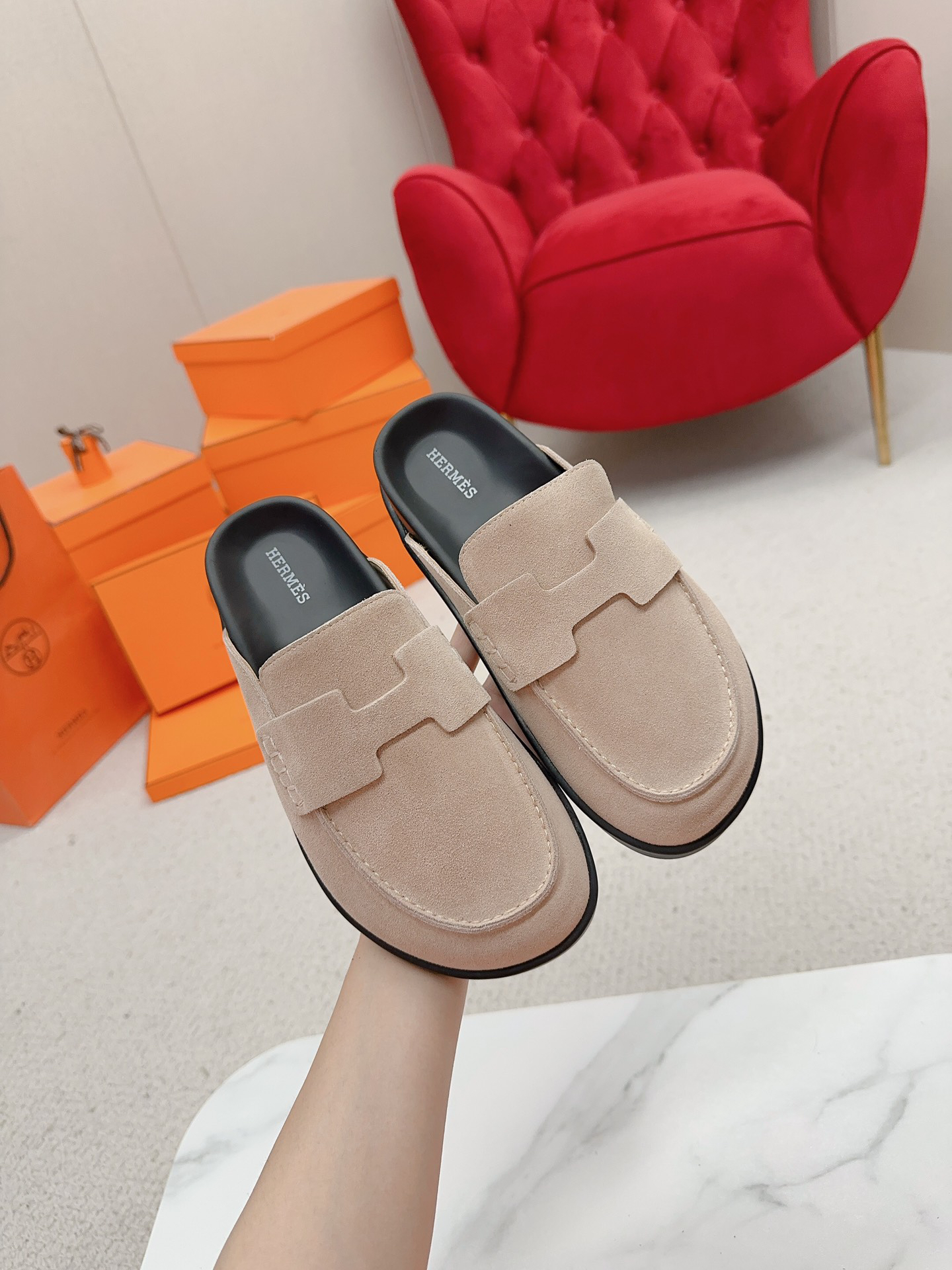 These mules are crafted from a combination of goatskin and sheepskin, featuring a classic “H” detail on the upper for a comfortable and modern style. They’re cute, lightweight, and as soft as a cloud. Whether worn barefoot or with socks, they exude a stunning sense of style. The sole is made of original molded TPU material, with a simple and streamlined design for comfortable and casual wear.
