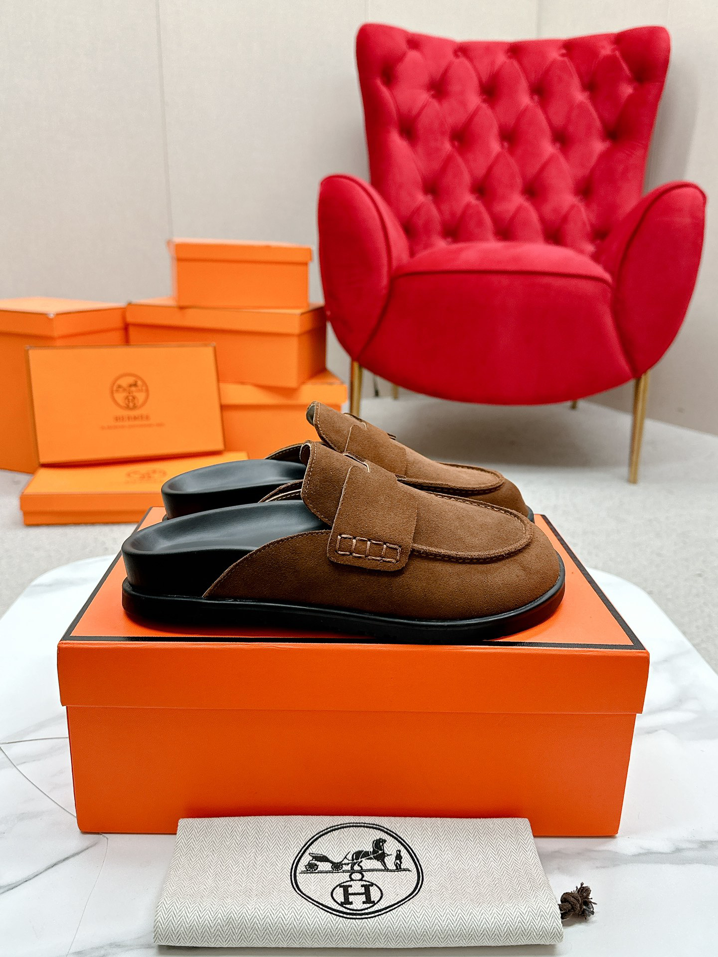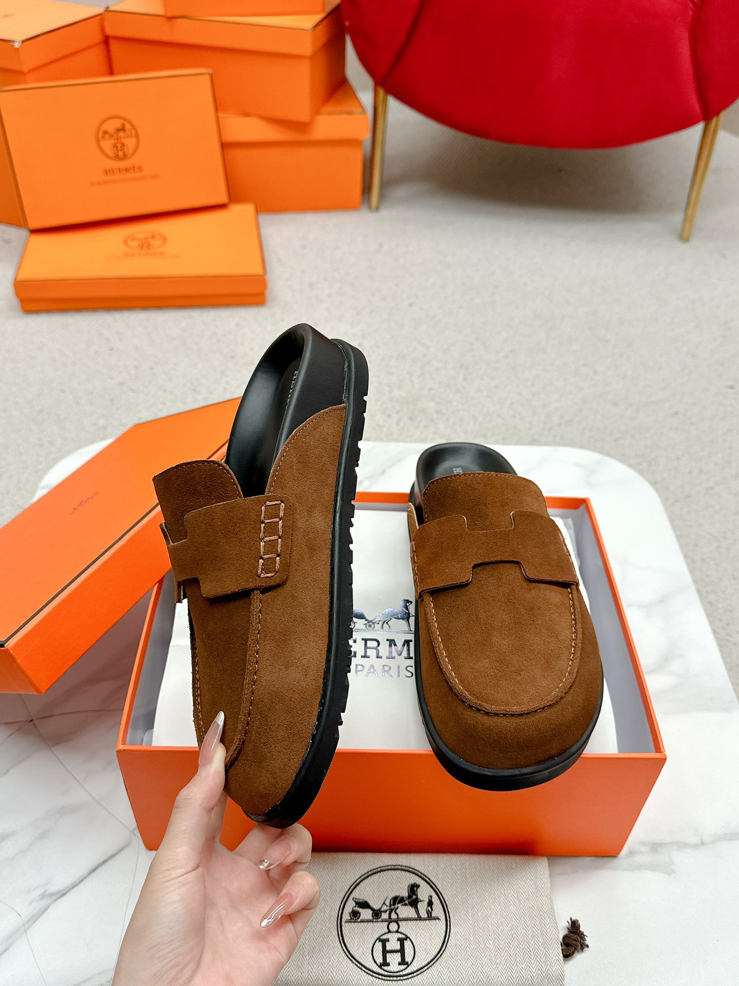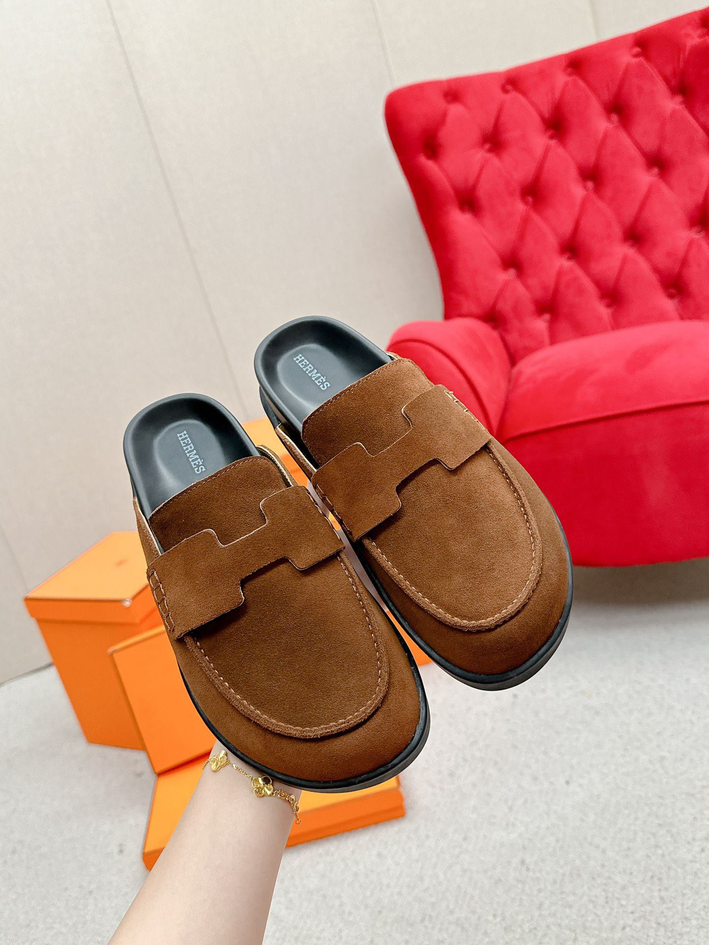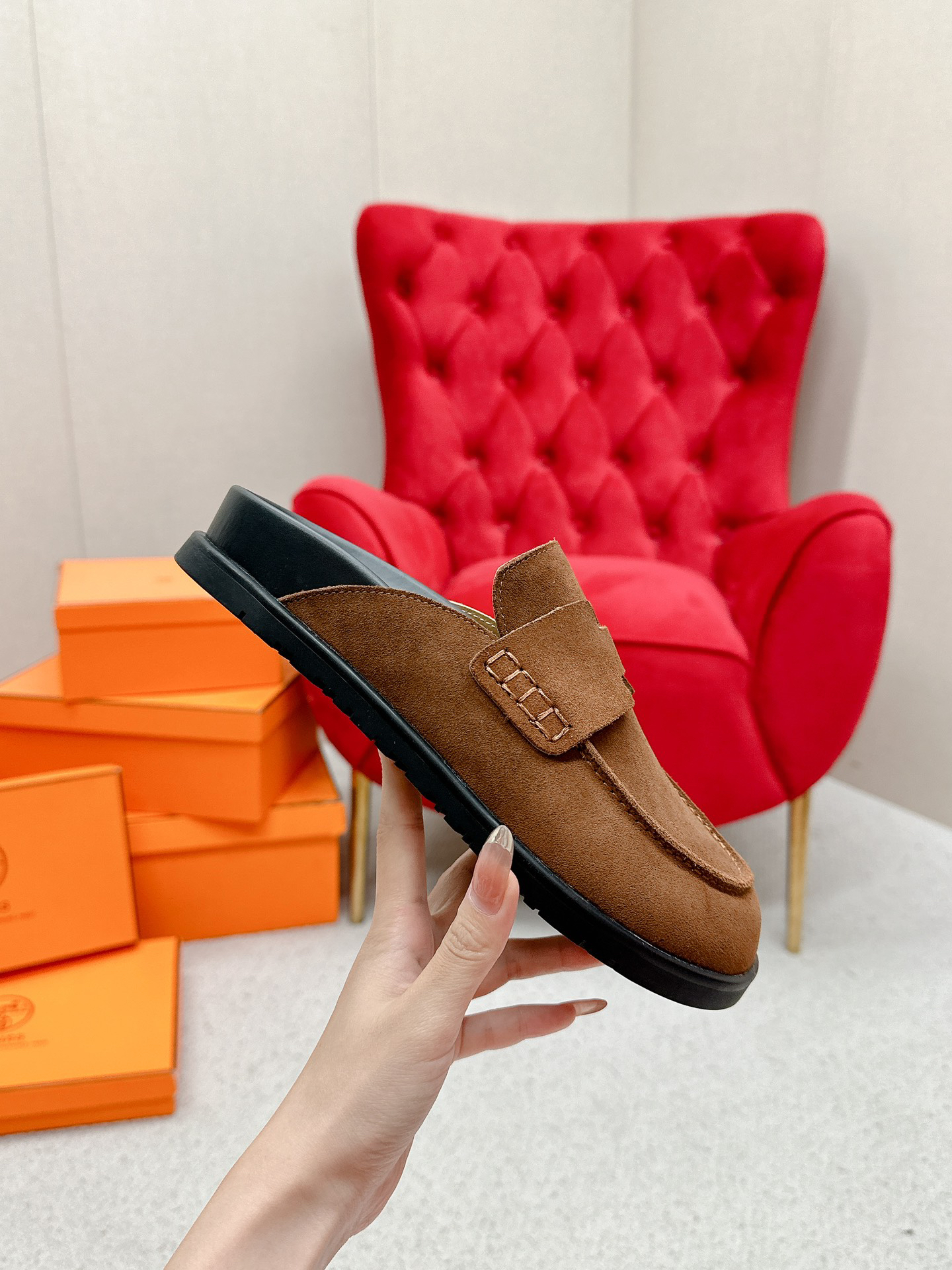 These mules are crafted from a combination of goatskin and sheepskin, featuring a classic “H” detail on the upper for a comfortable yet modern look. Lightweight and adorable, they feel as soft as a cloud. Whether worn barefoot or with socks, they exude a stunning sense of style. The sole is made of original molded TPU material, with a simple and streamlined design for comfortable and casual wear.