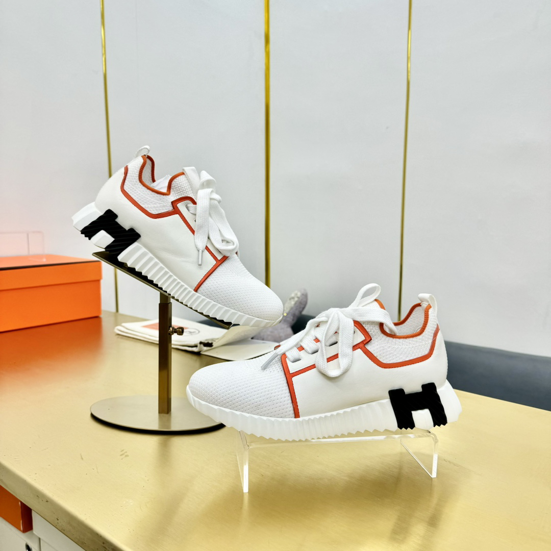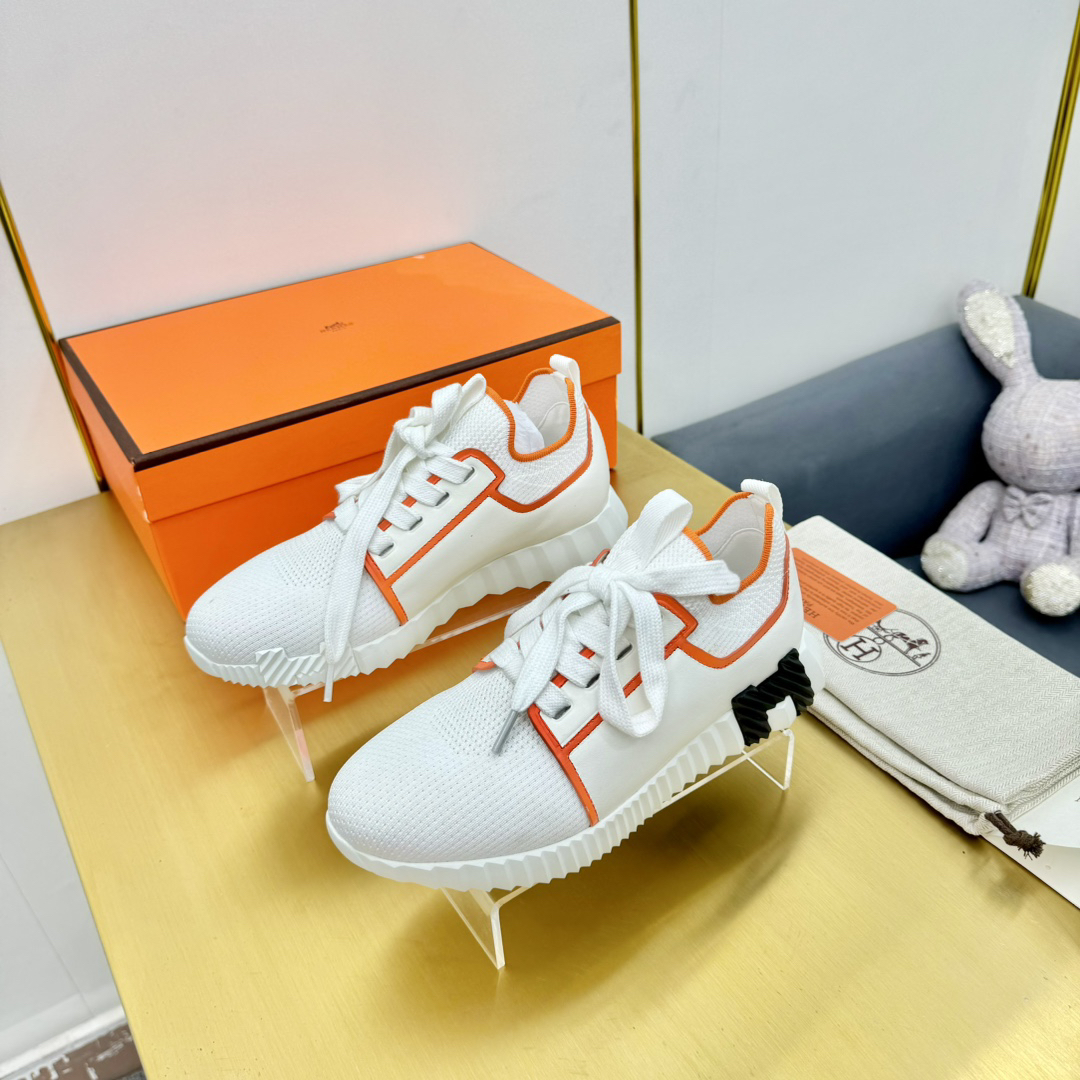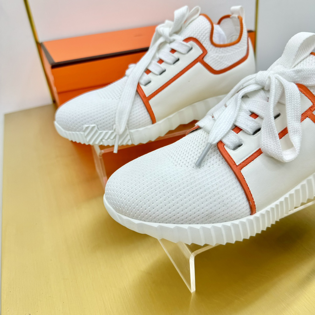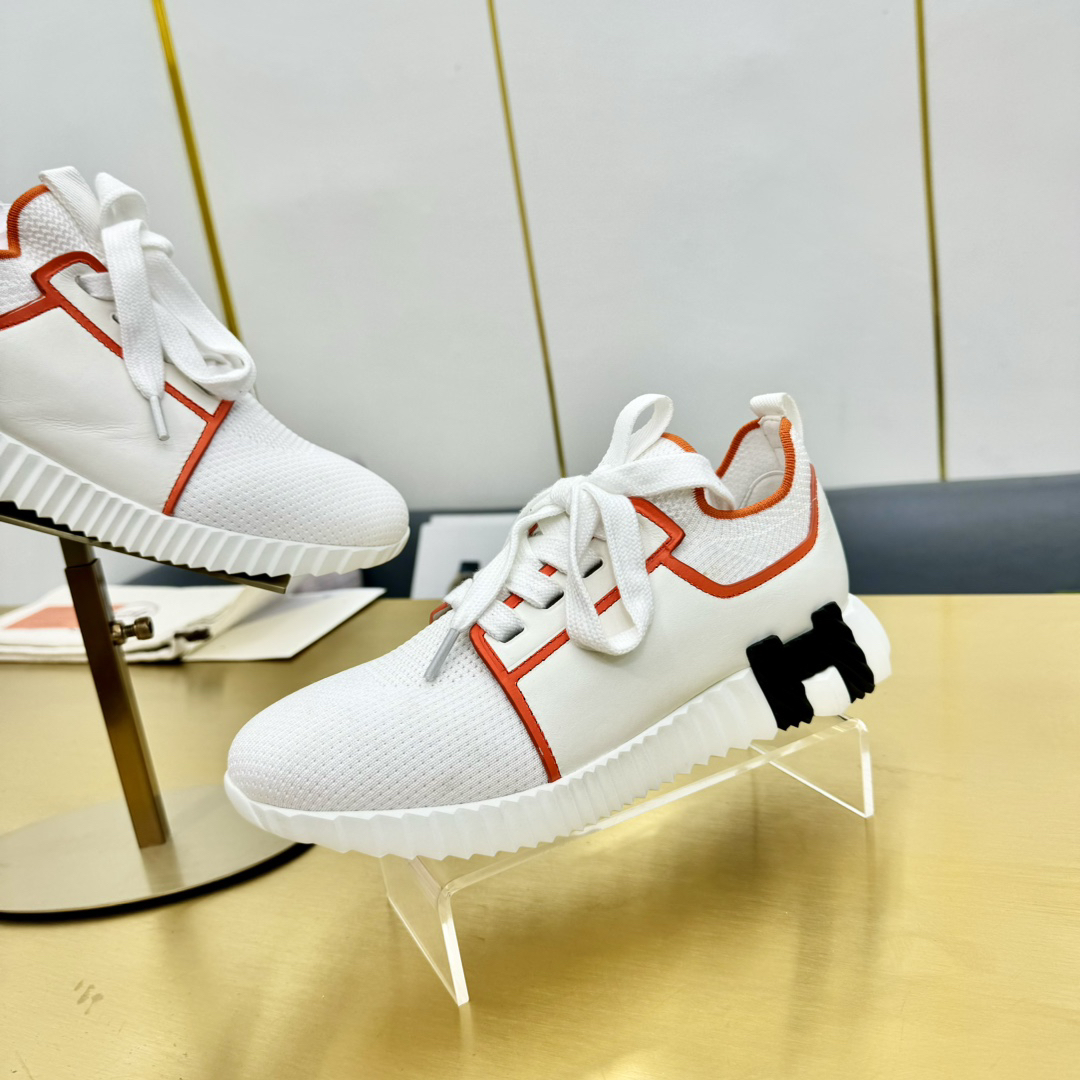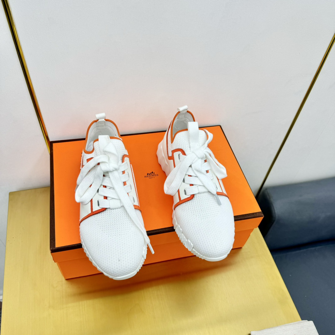 Features: This shoe blends the styles of loafers and sneakers, crafted from breathable knit fabric and supple calfskin. The lightweight and stylish sole is complemented by the iconic orange “H” logo on the sides and edges.
