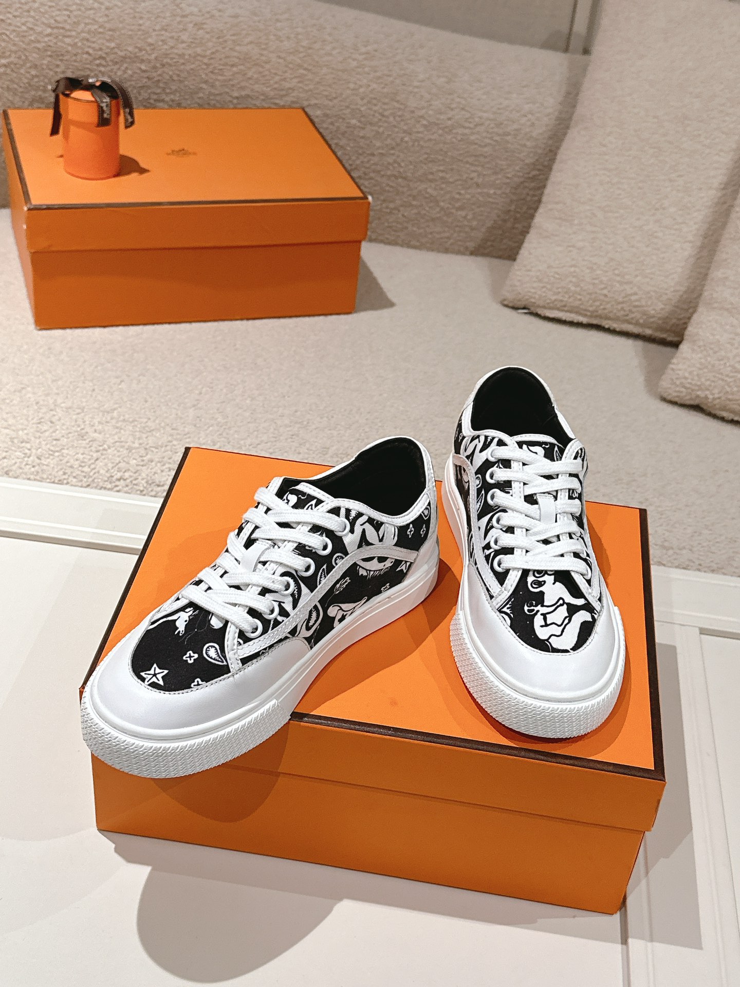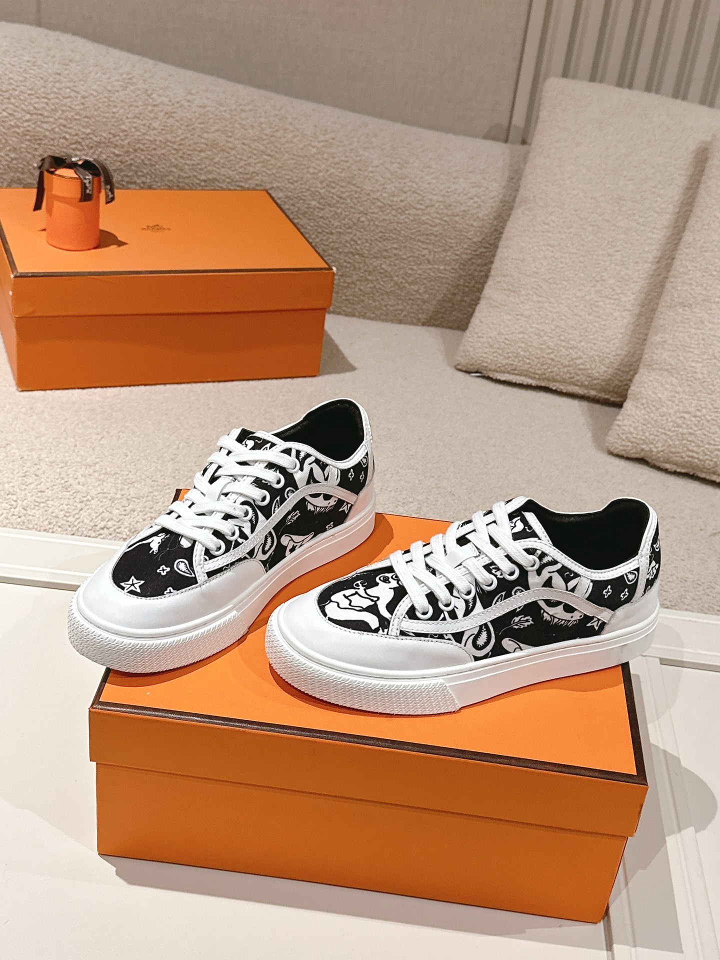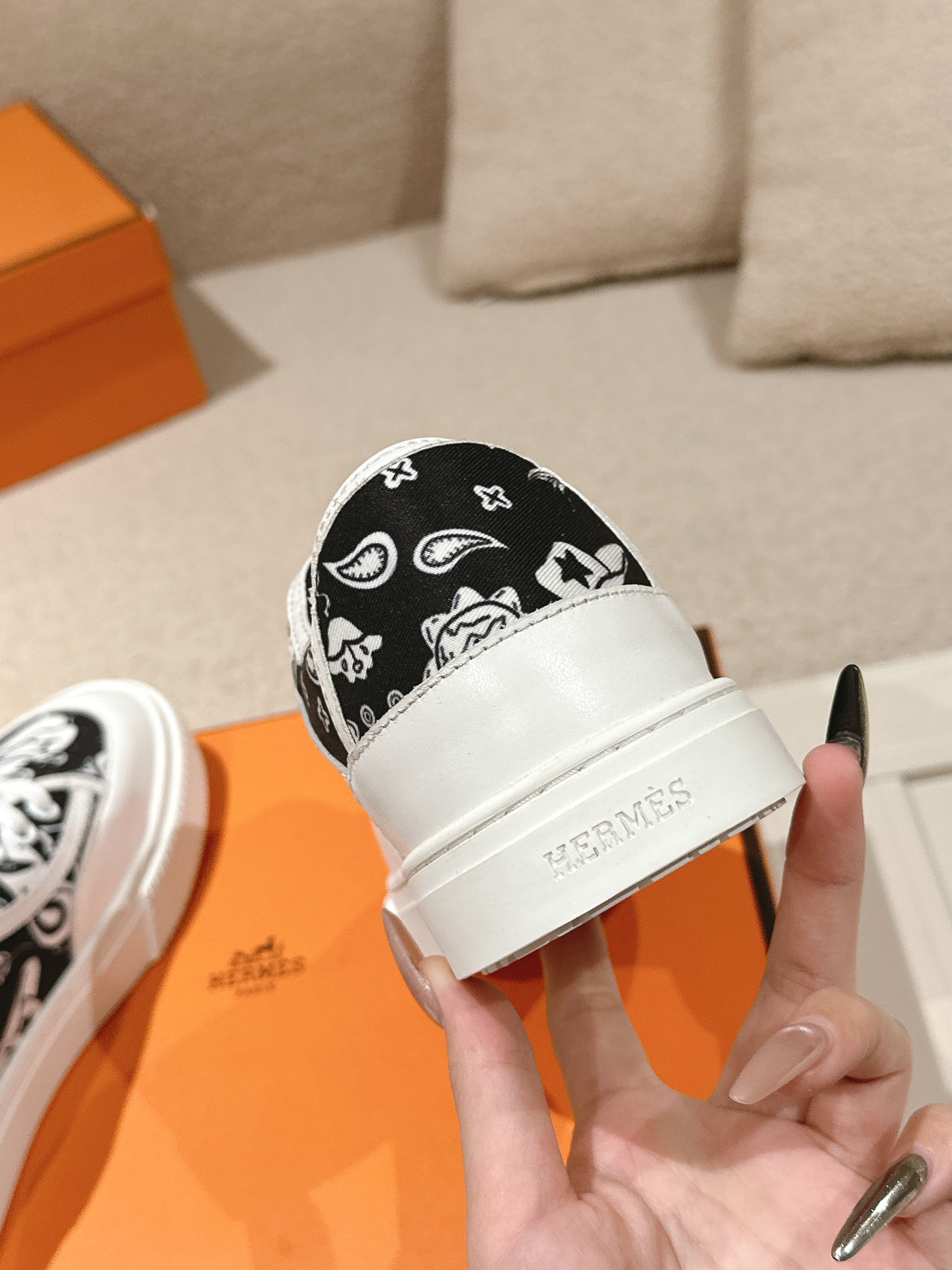 Design Features: Canvas upper, white rubber sole, and the iconic “H en Biais” geometric pattern on the heel. Available in black and white pattern and paisley pattern.
