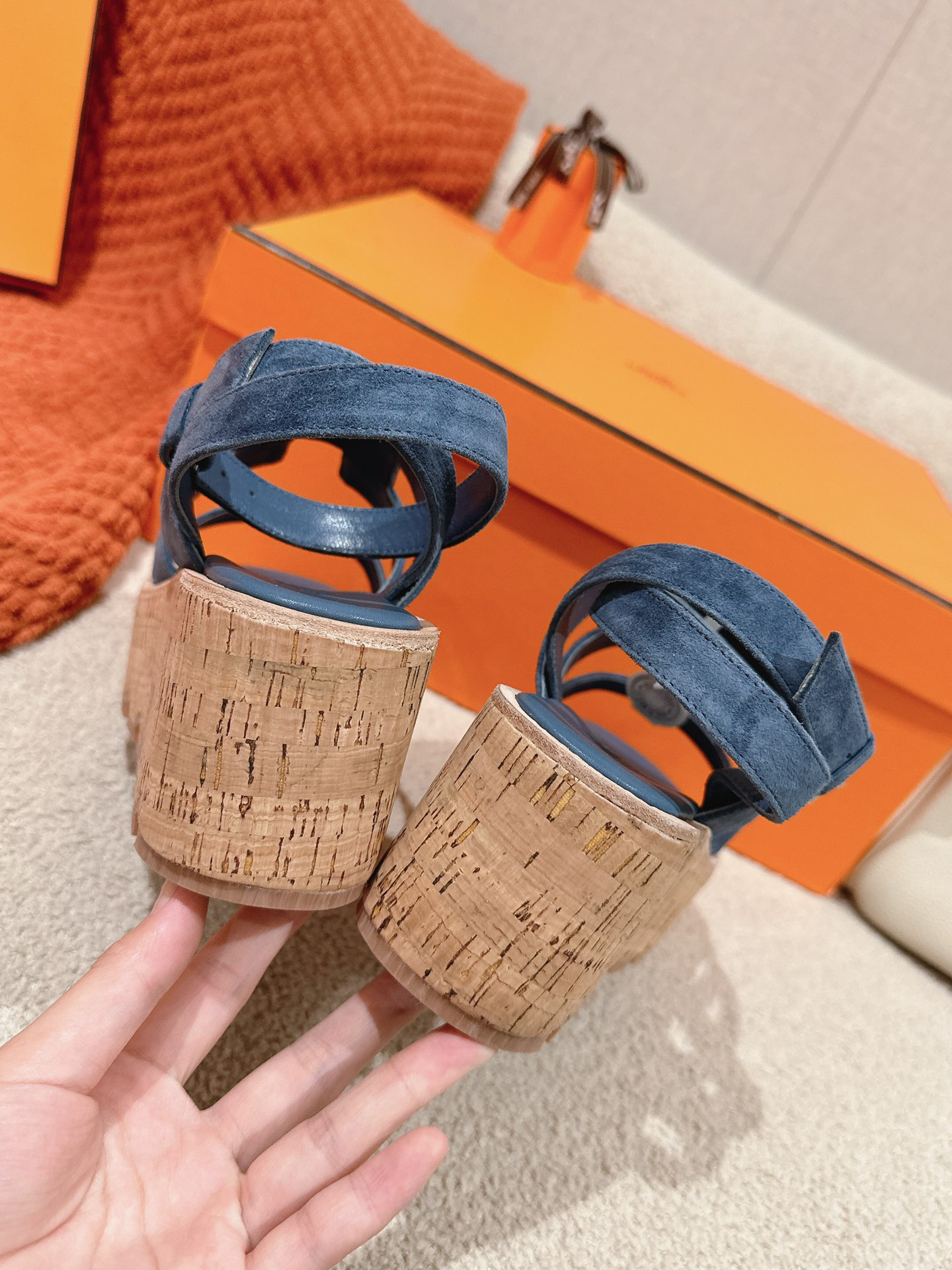 Color Scheme: The shoes shown feature a dark blue upper, paired with a beige cork (or similar cork-textured) wedge heel and leather sole.