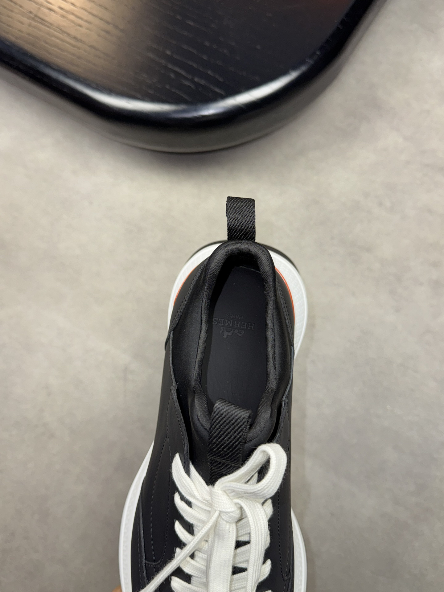 Color scheme: Primarily black upper, paired with a white platform sole and orange heel details.