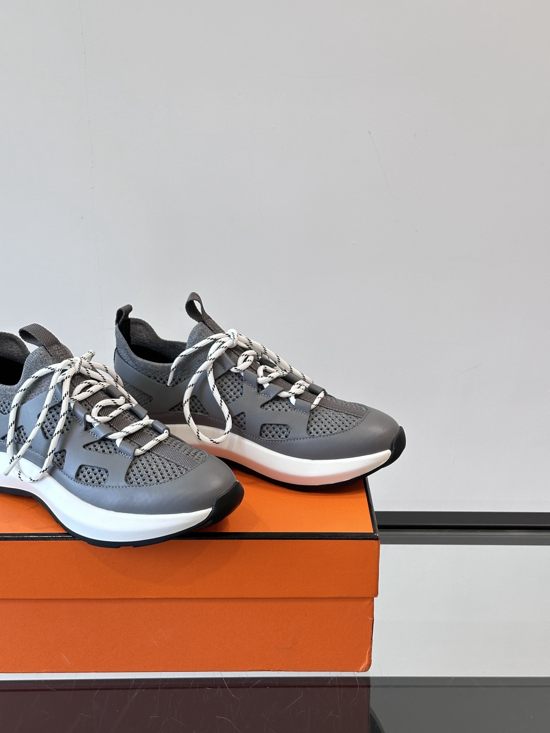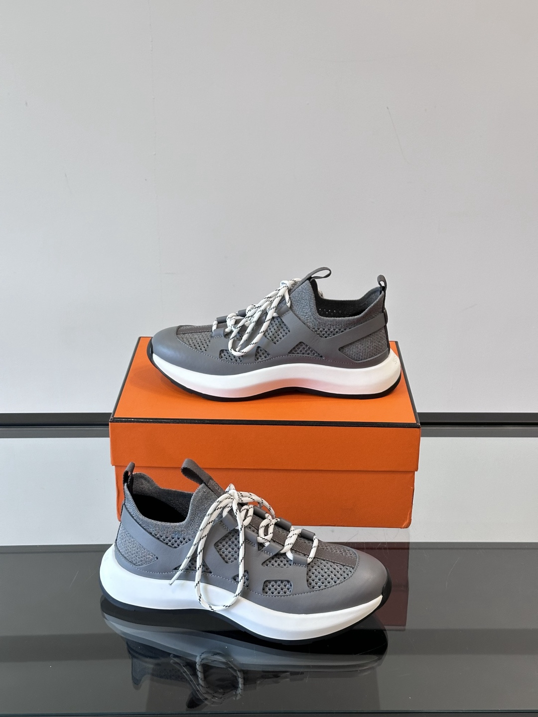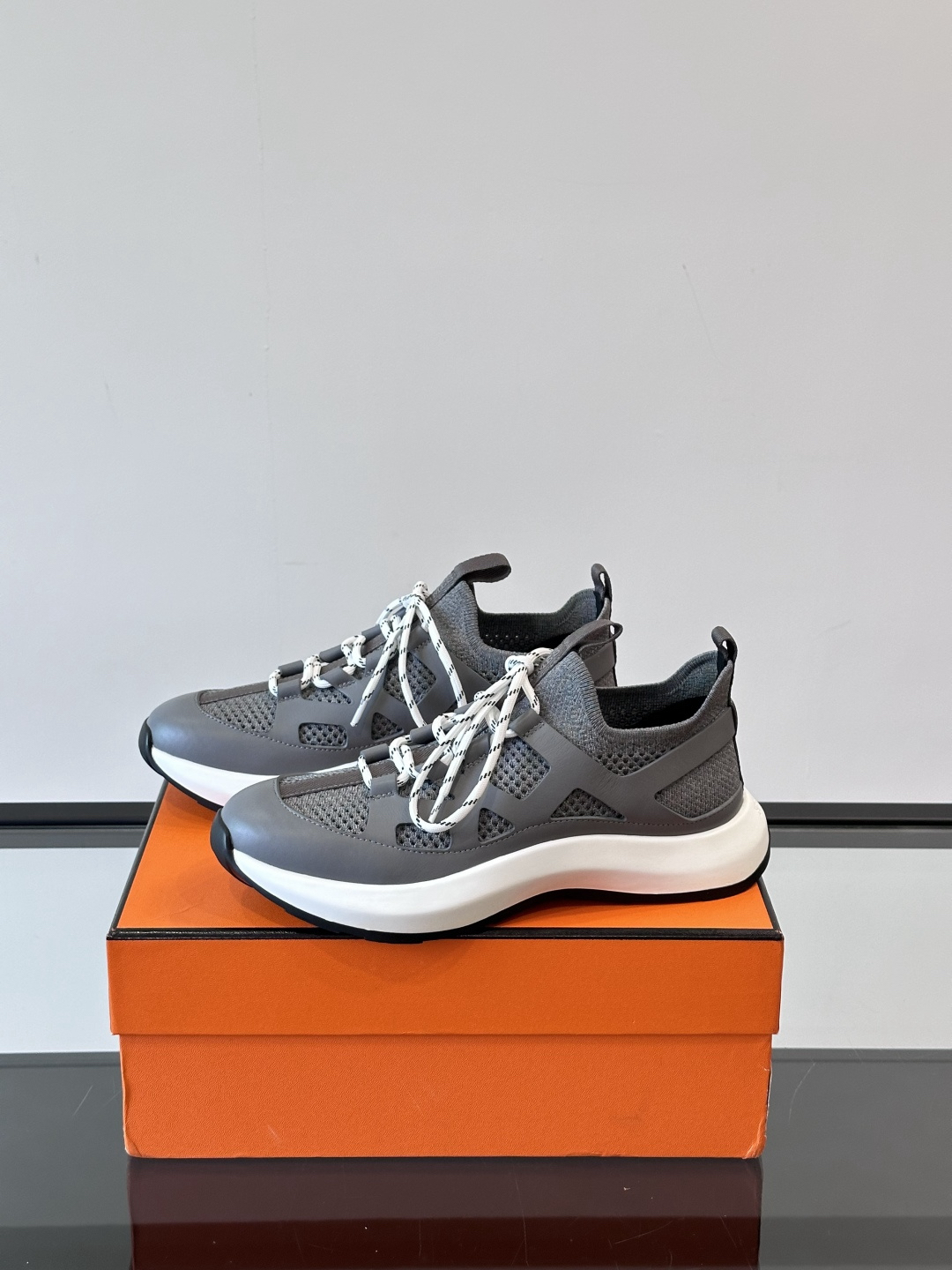 Features: These sneakers are crafted from a combination of grey knit fabric and calfskin, featuring a lightweight sole and a unique lace-up design. The perforated details on the upper are a signature feature of the urban casual style.