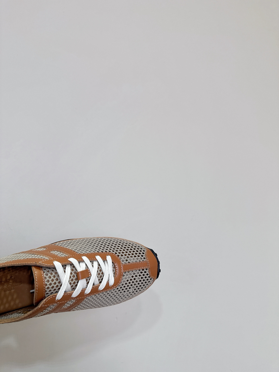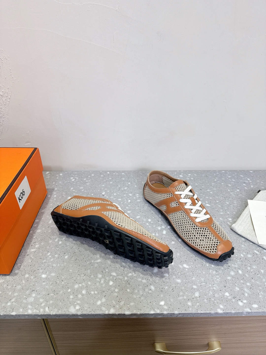 Features: These sneakers are crafted from crochet knit fabric and calfskin, featuring a classic Medor studded sole. The design blends modern and retro geometric elements, offering both breathability and comfort.