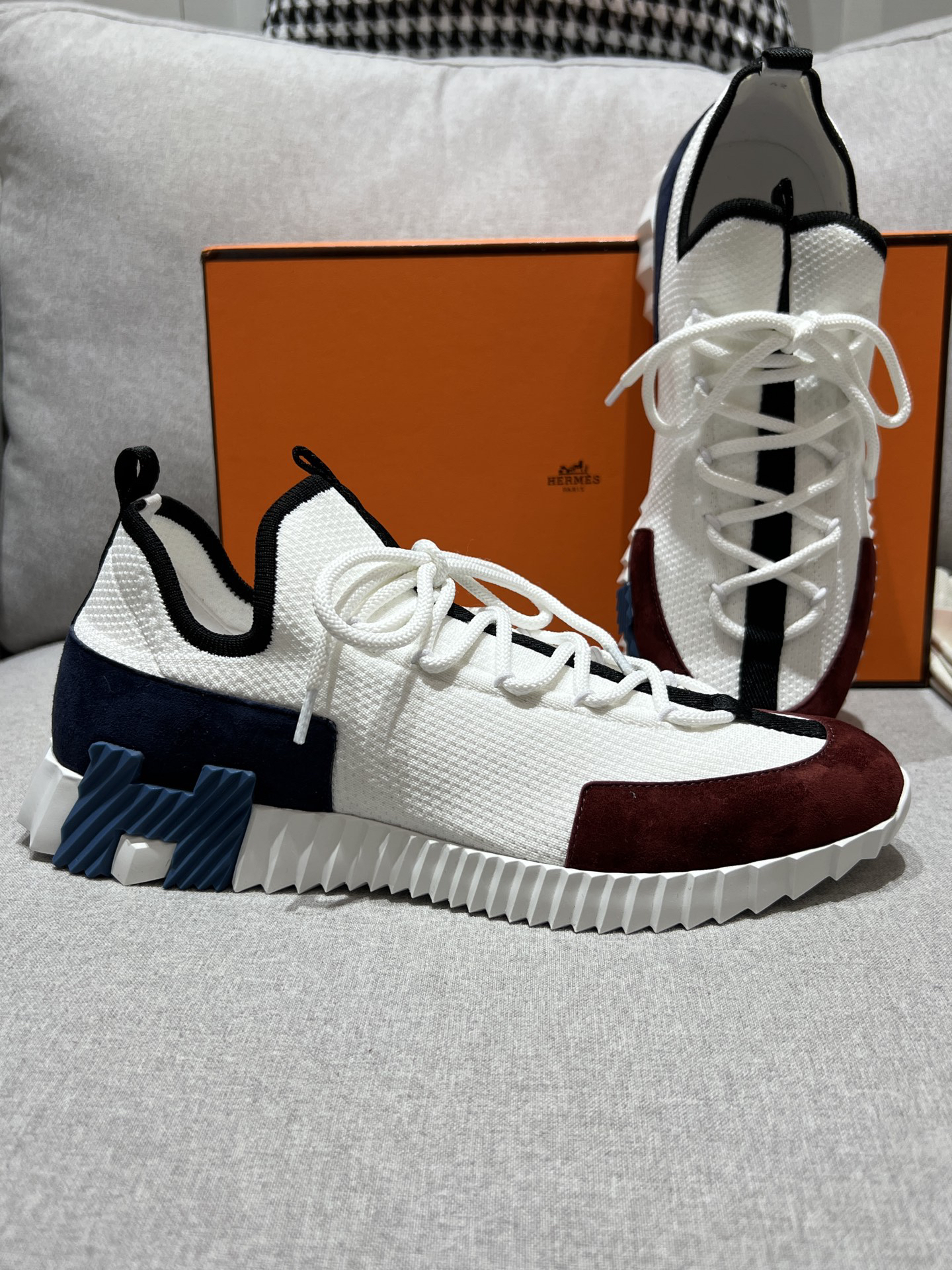 Colors: The color scheme shown includes a white upper, navy blue accents, and burgundy suede details.