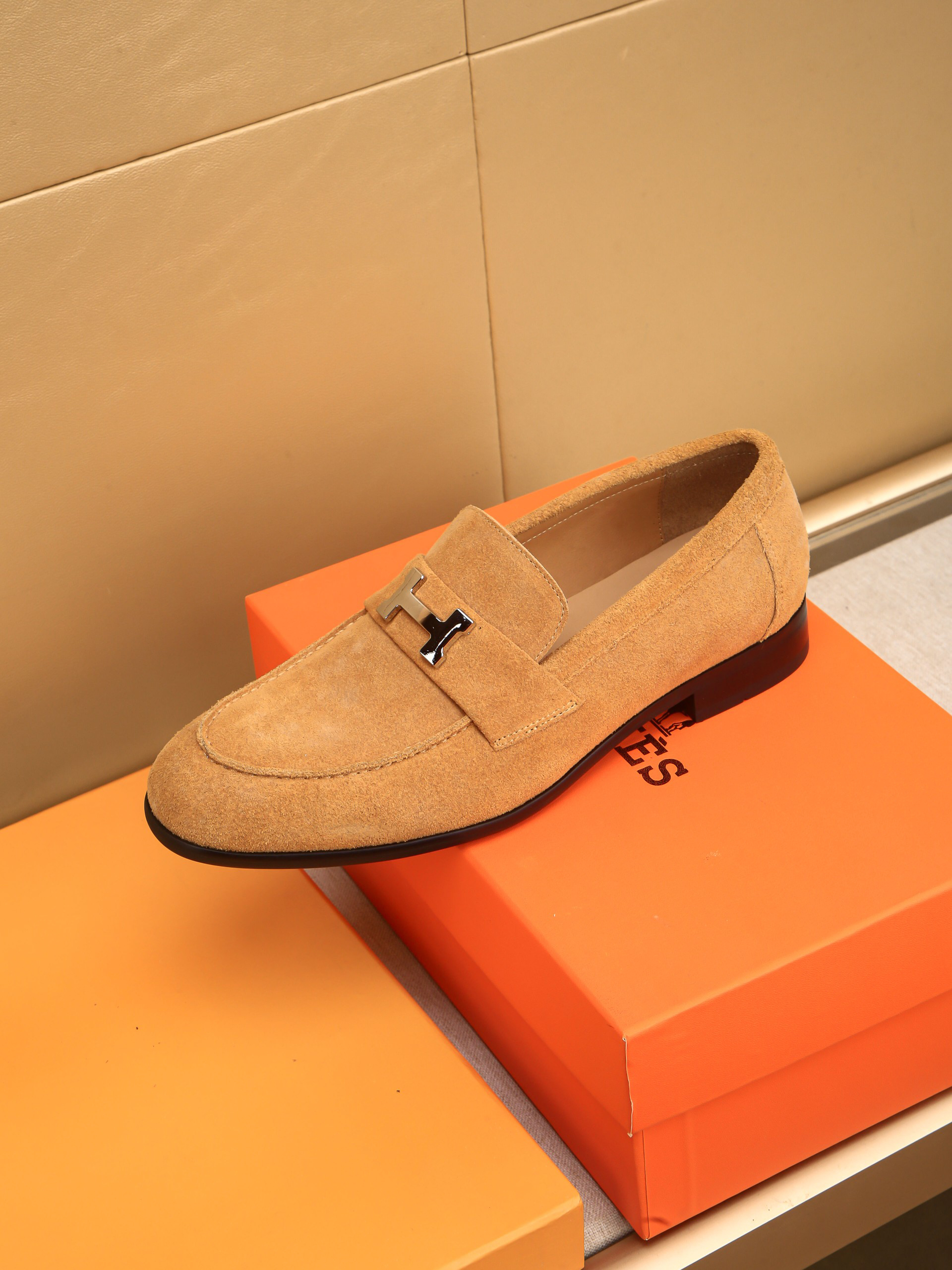 Material: The shoes shown in the picture feature a black goatskin suede upper, adorned with a palladium or matte black patent leather “H” logo buckle.
