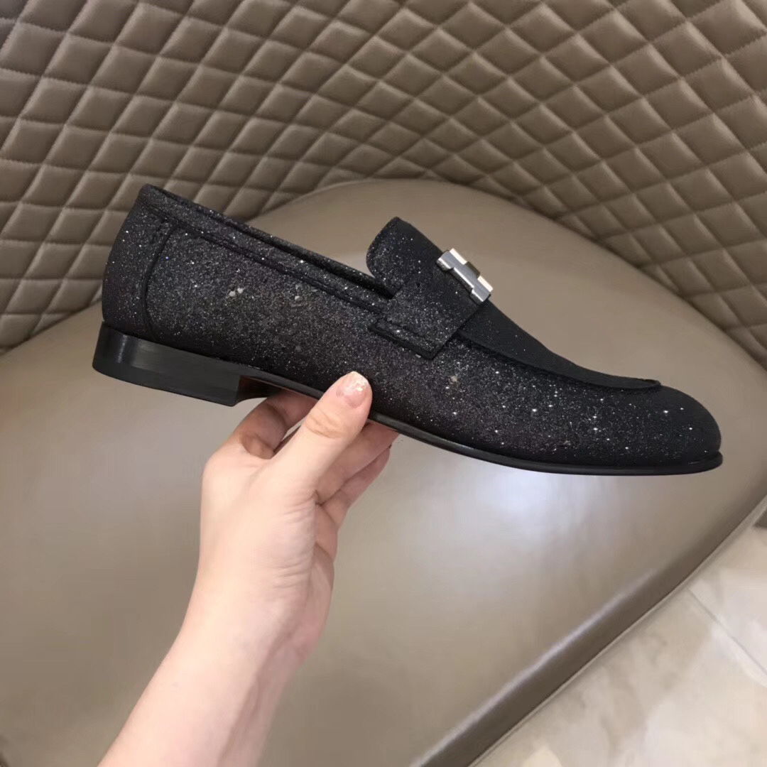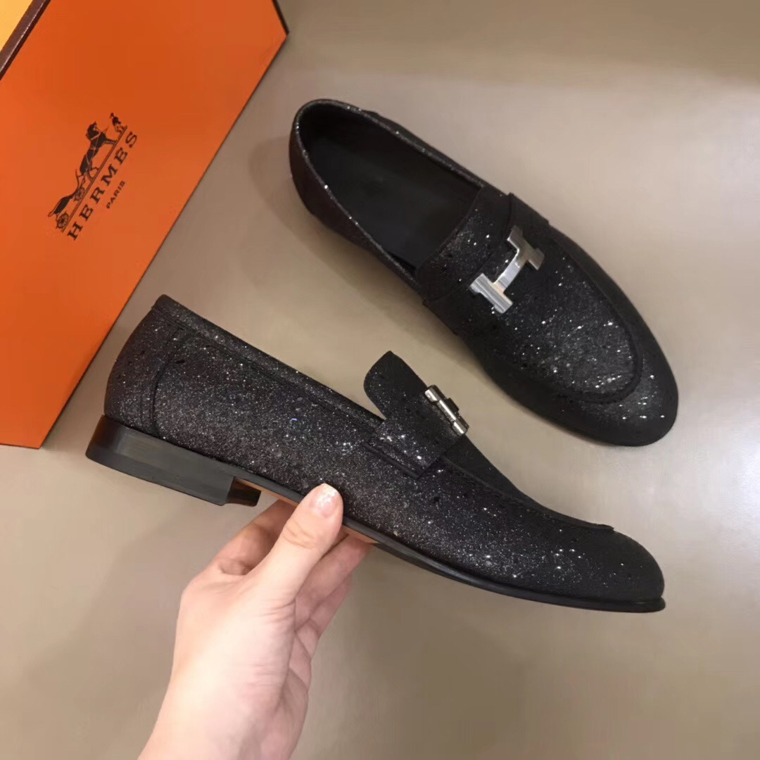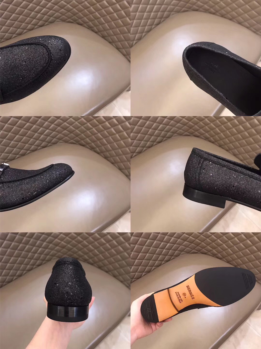 Material: The upper is made of black shimmering fabric or leather with a metallic sheen, paired with a silver or palladium-gold “H” logo buckle.