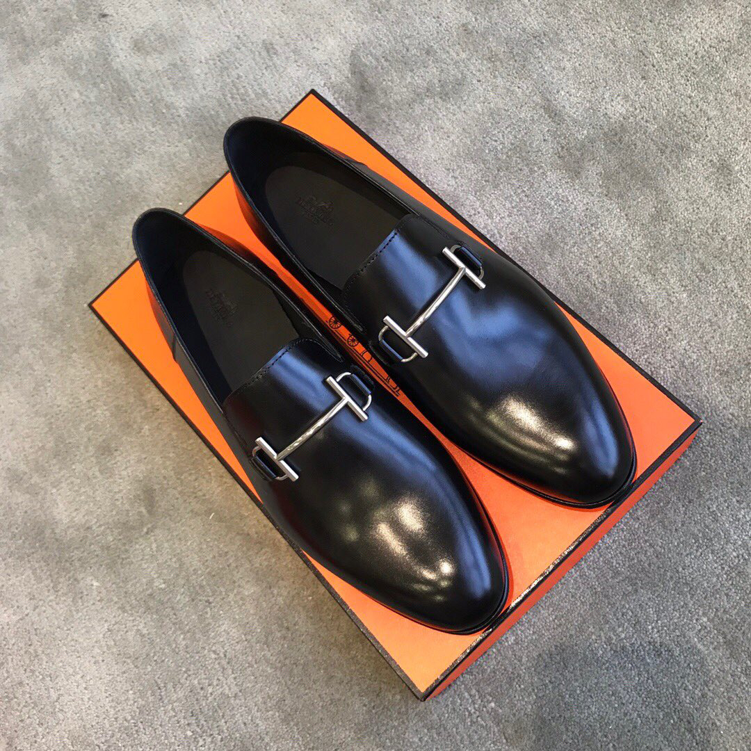 Material: The upper in the picture is made of black patent calfskin or goatskin, with a palladium-plated “H” logo buckle.