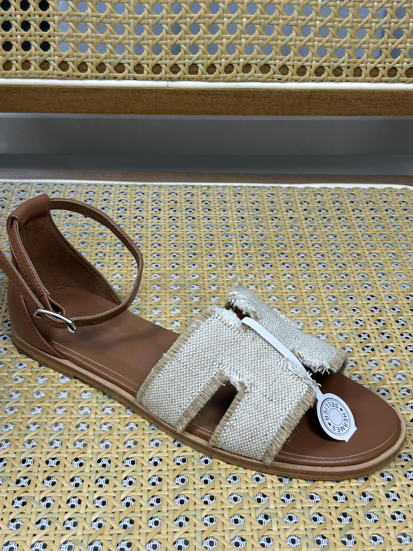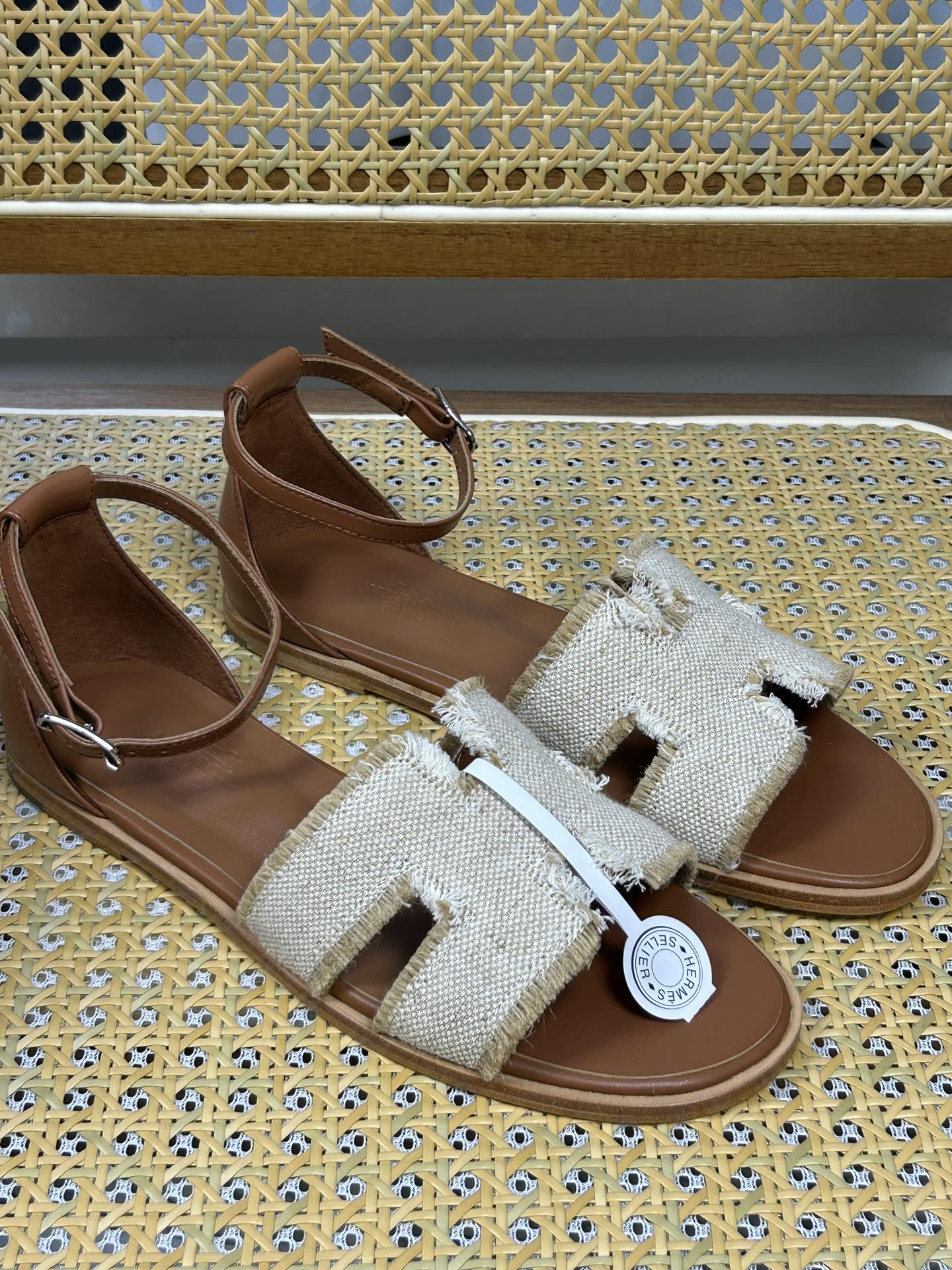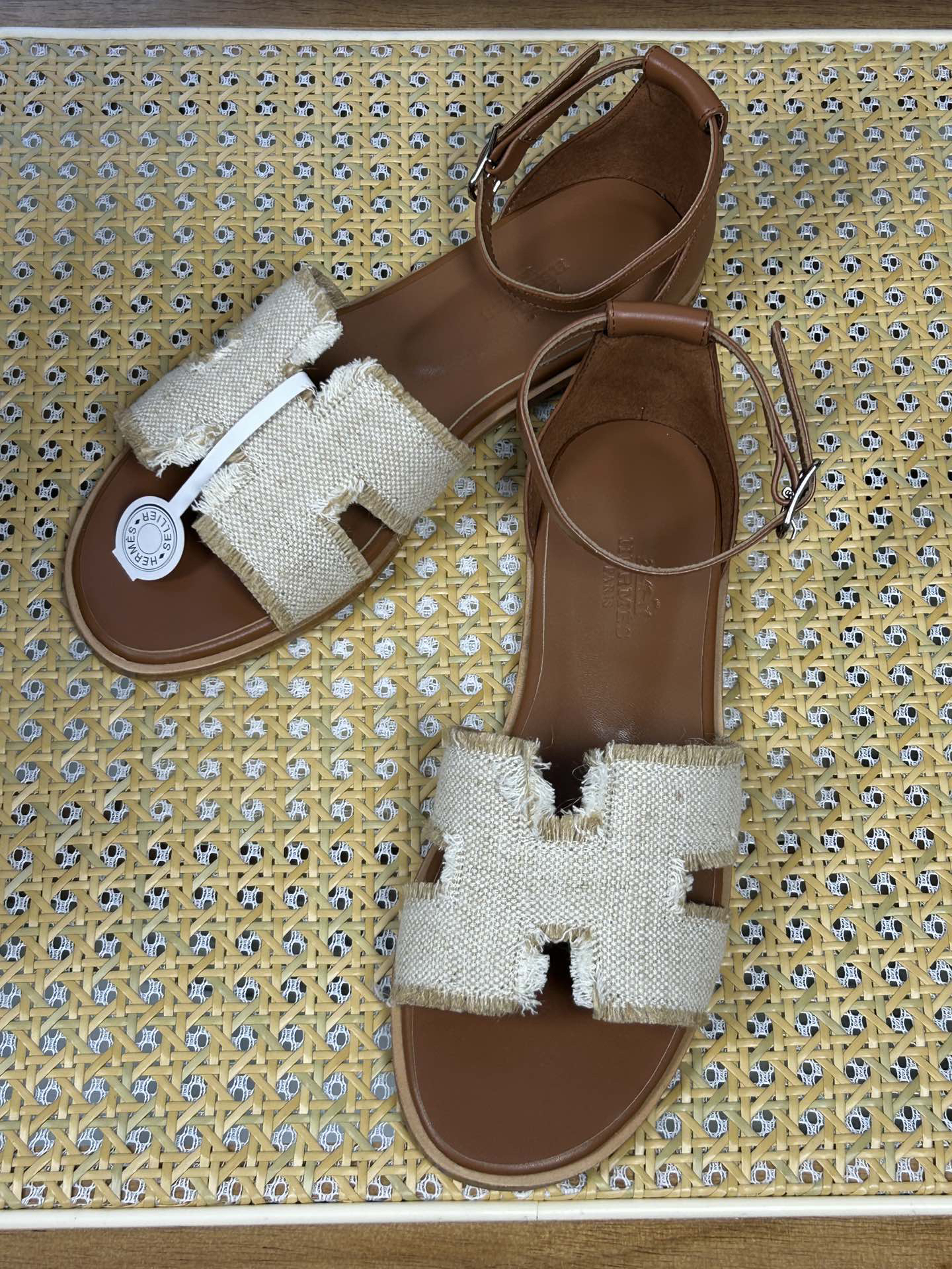 Features: These sandals feature a natural raffia upper with fringed trim and the iconic “H” logo on the side. The flat design includes an adjustable ankle strap for a casual yet stylish look.